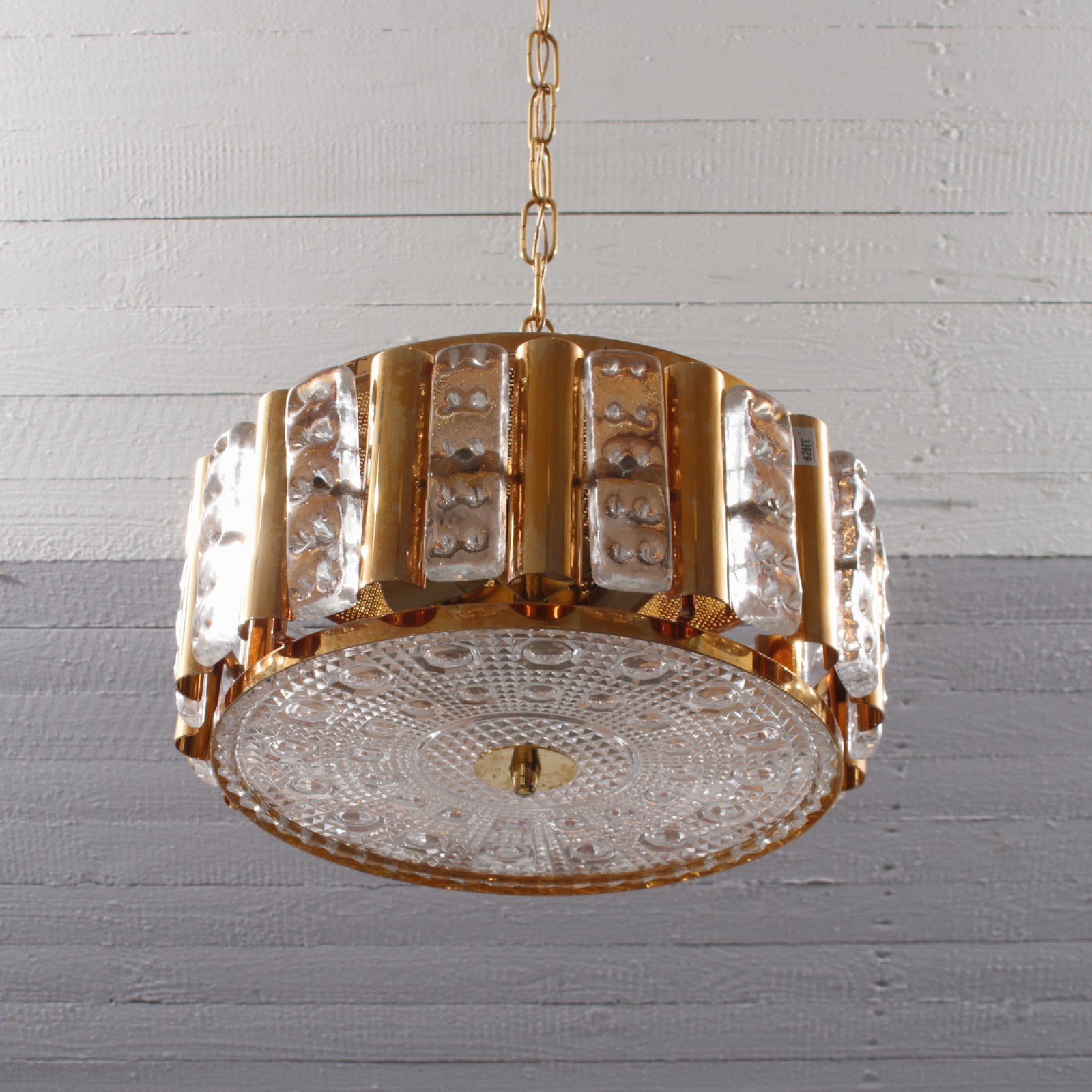 Mässing och glas, troligen Carl Fagerlund för Orrefors, 1970-tal, höjd utan kedja 16 cm, diameter 35 cm. (vån1)