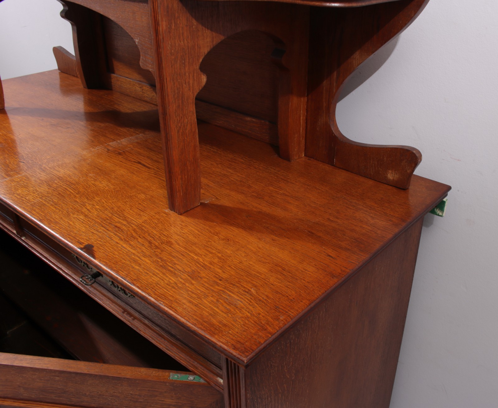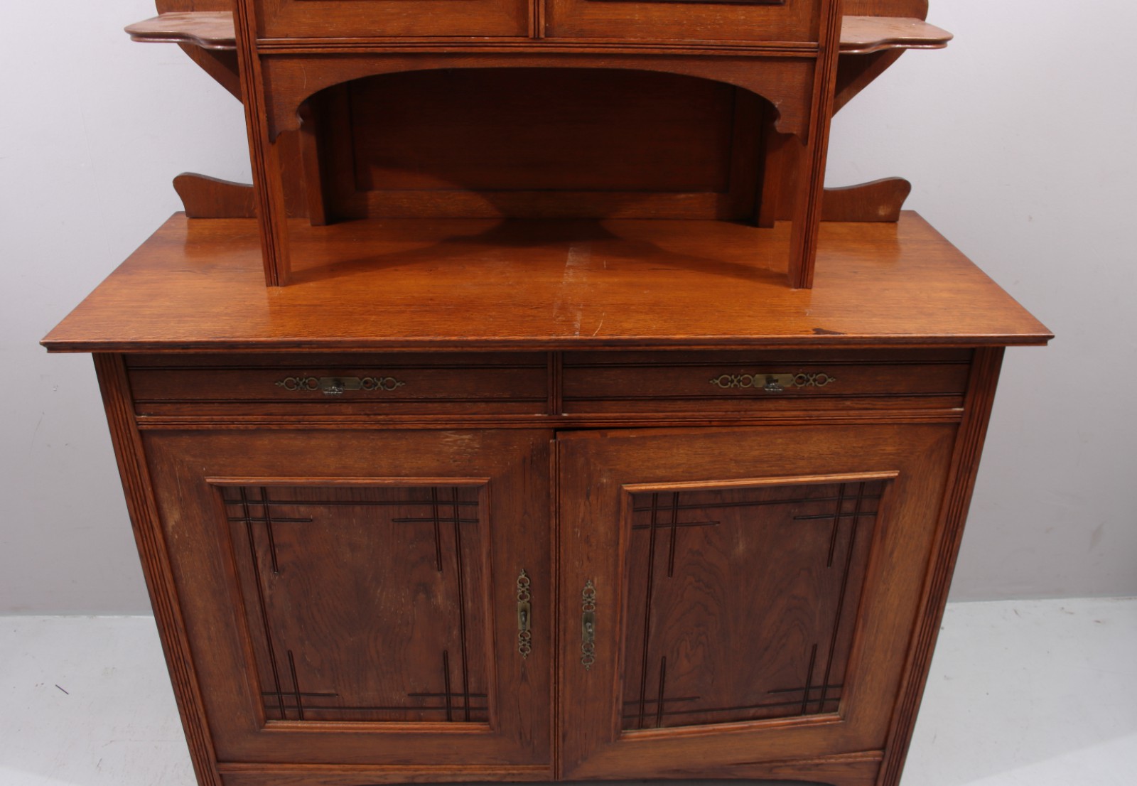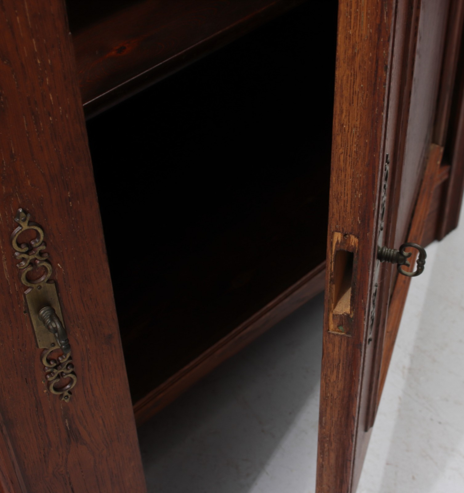 Ek, jugend, infattat glas, 2-delat, senare beslag, låskistor saknas, åldersrelaterat slitage, H.222 (100+122), B.140, Dj.58 cm. (vån1)