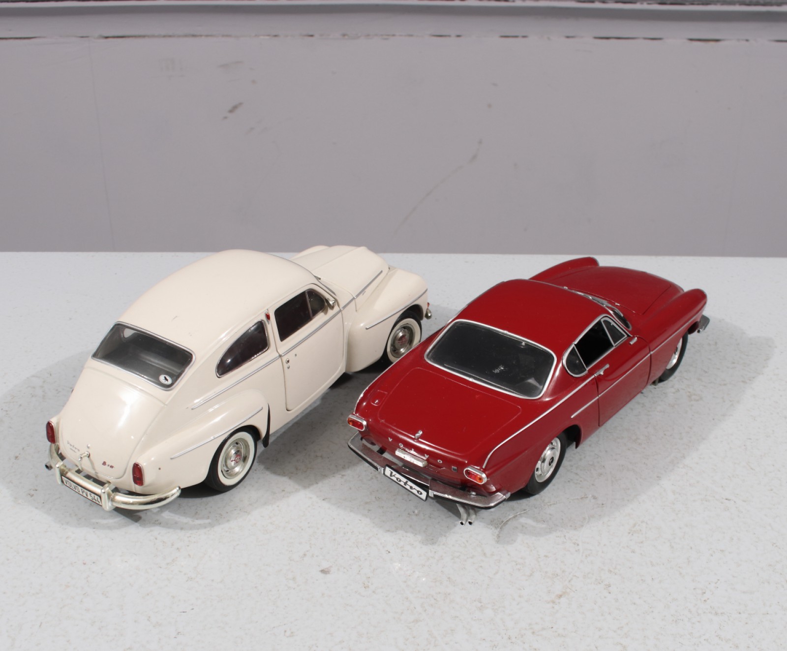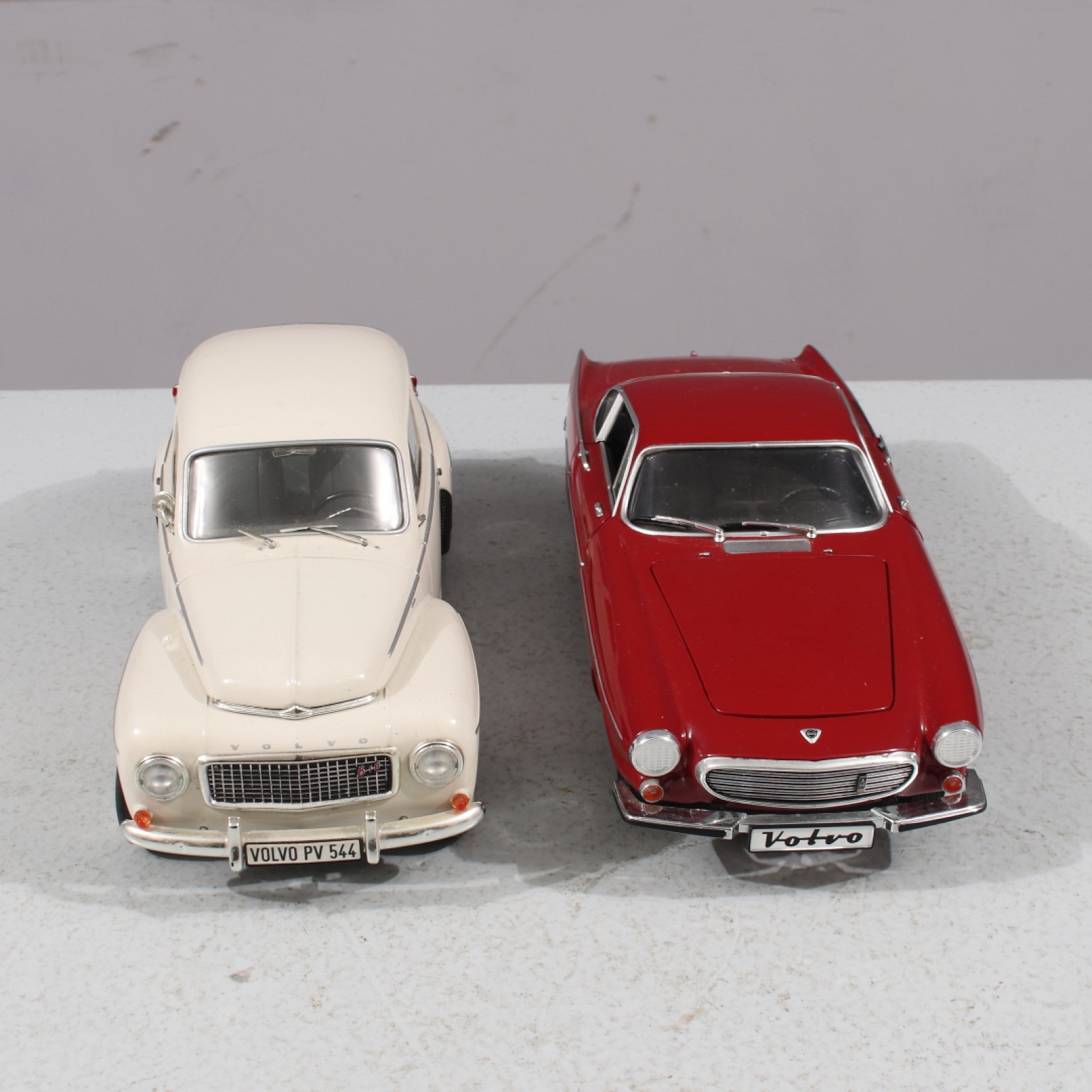2 stycken, metall och plast, 1st Volvo PV544 samt 1st P1800S, 19,2000-tal, skala 1/18, Kina, PV saknar dörrhantag, 1st sidospegel samt avbruten torkare, längd 24 cm. (vån3)