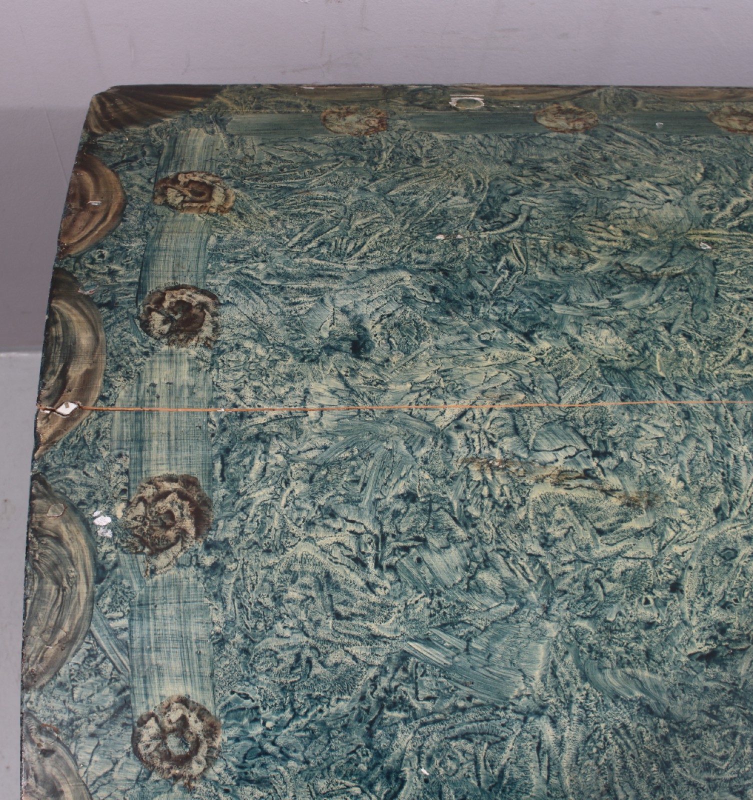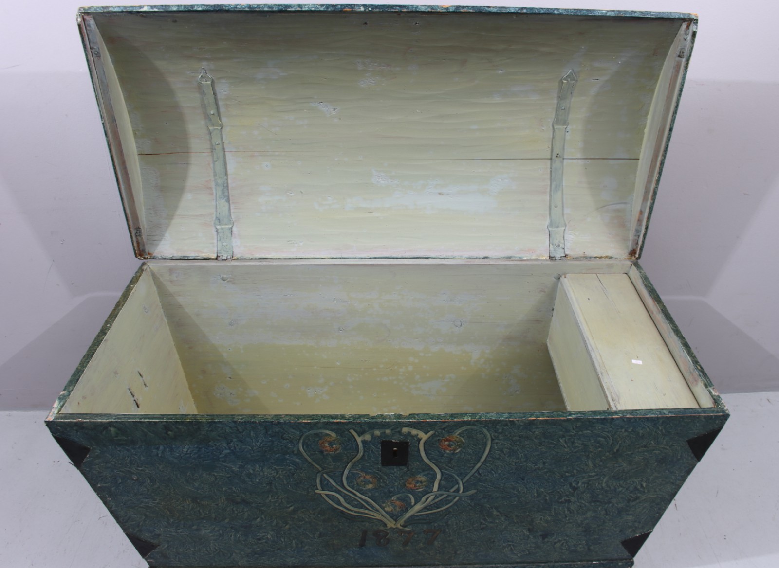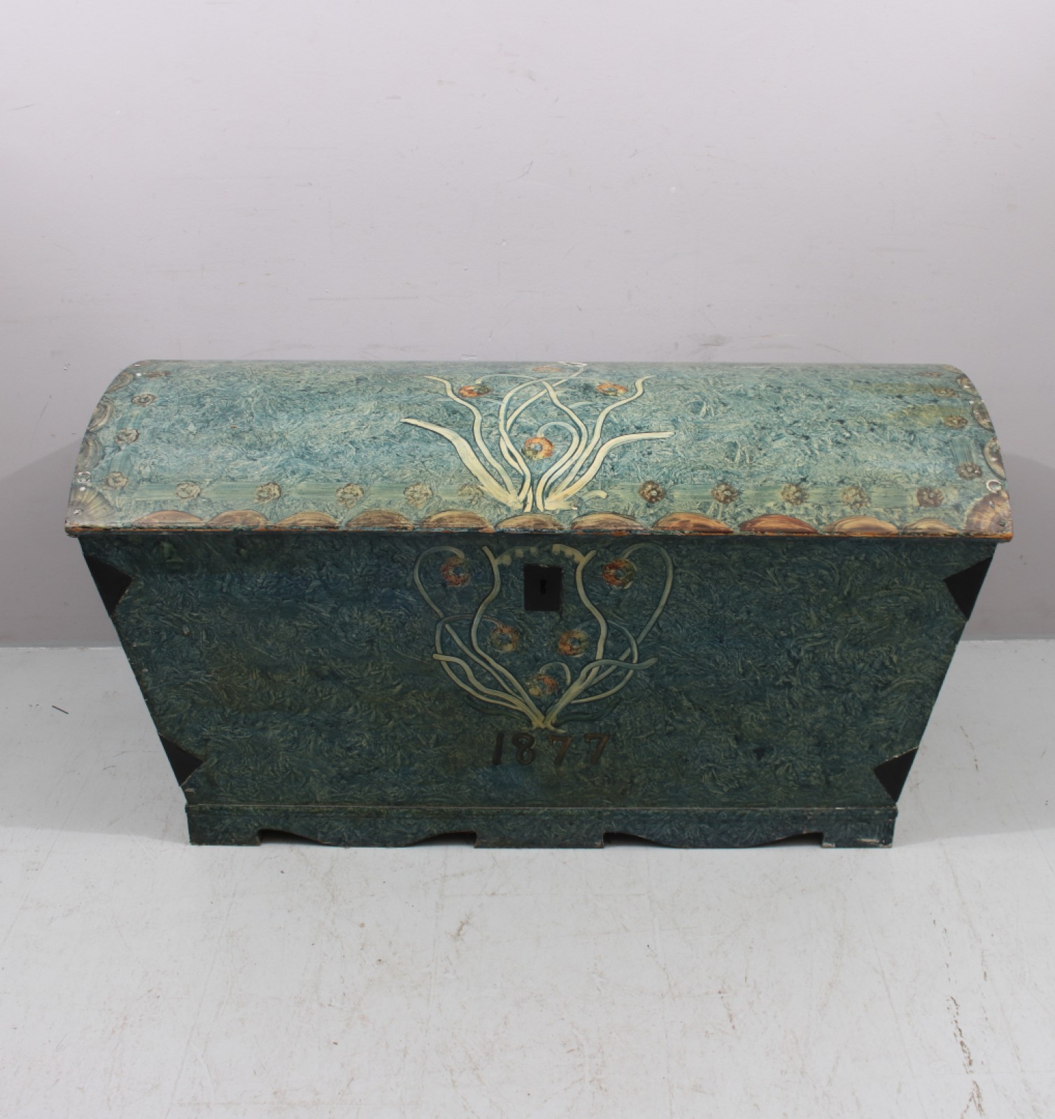Datering 1877, senare bemålning, låskista saknas, lock med torrspricka, H.72, B.136, Dj.66 cm. (vån1)