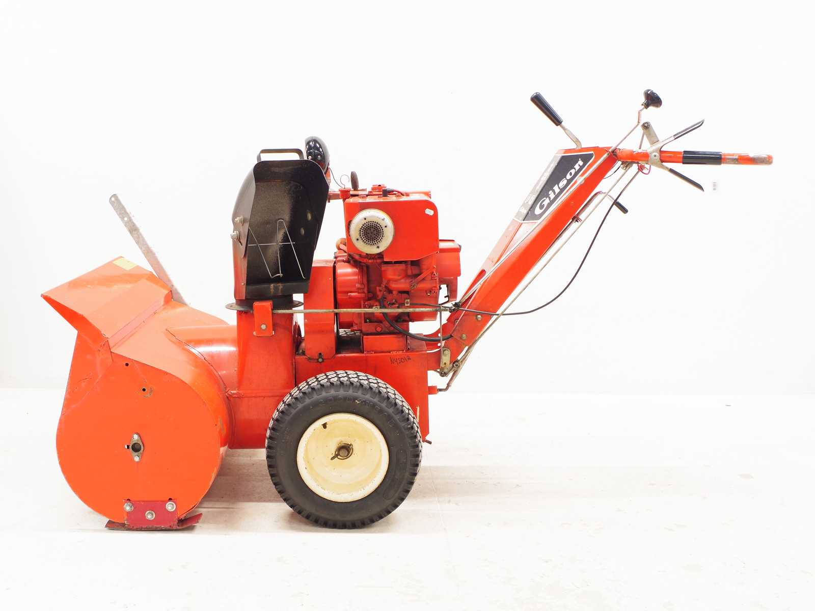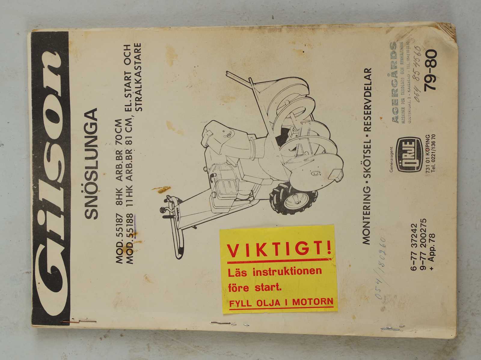 Auktioner SNÖSLUNGA, Gilson "55188", 11Hp, med elstart & strålkastare, snökedjor medföljer. Bredd:82cm (bruksslitage)