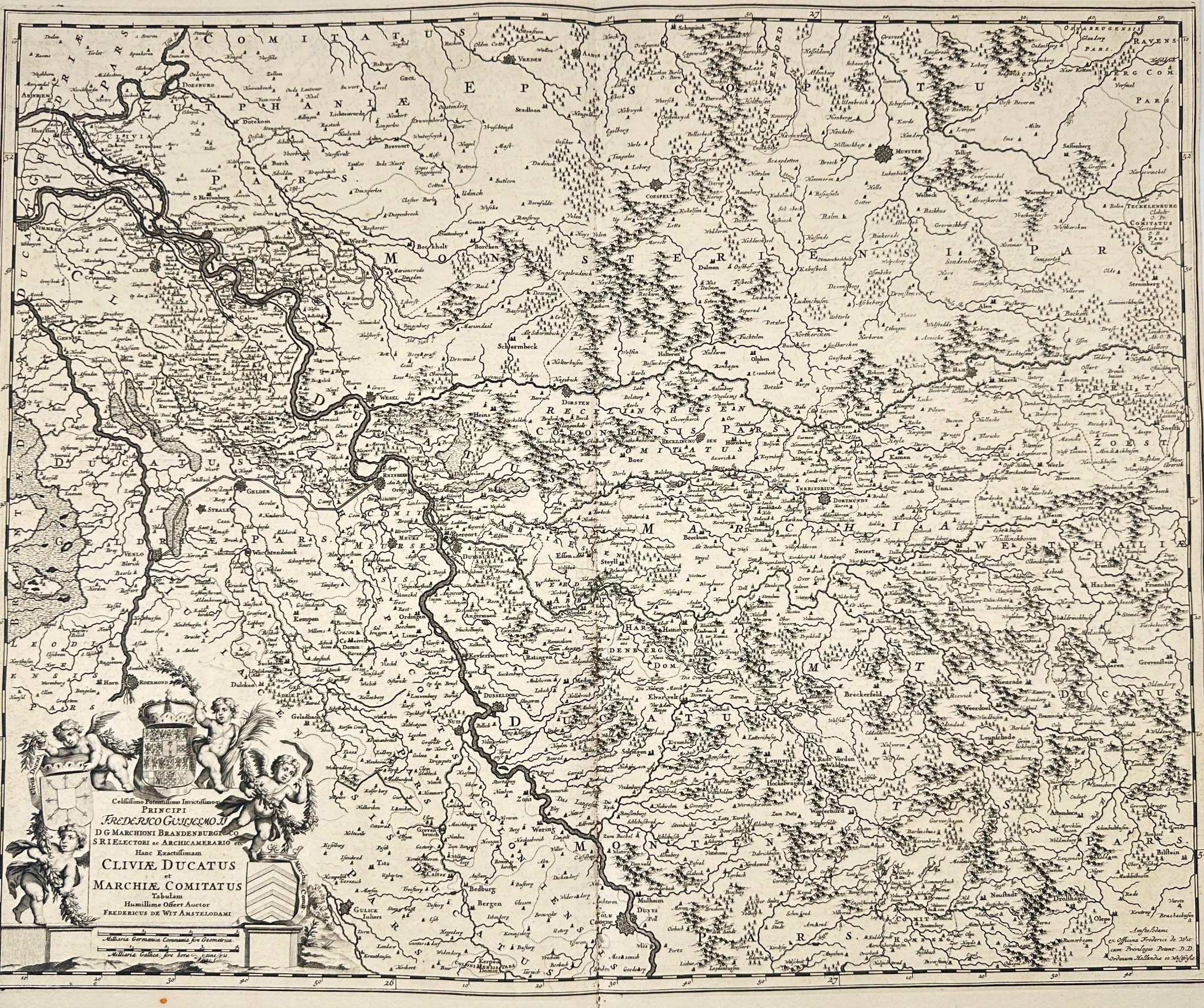 This finely engraved map by Frederik de Wit presents the Duchy of Cleves (Clivia Ducatus), the County of Mark, and the County of Ravensberg, regions in the Holy Roman Empire located near present-day western Germany and the Netherlands. The map illustrates detailed geographic and political boundaries, rivers, settlements, forests, and topographic features. A large baroque cartouche in the bottom left corner is flanked by putti and heraldic emblems, enhancing its decorative appeal.