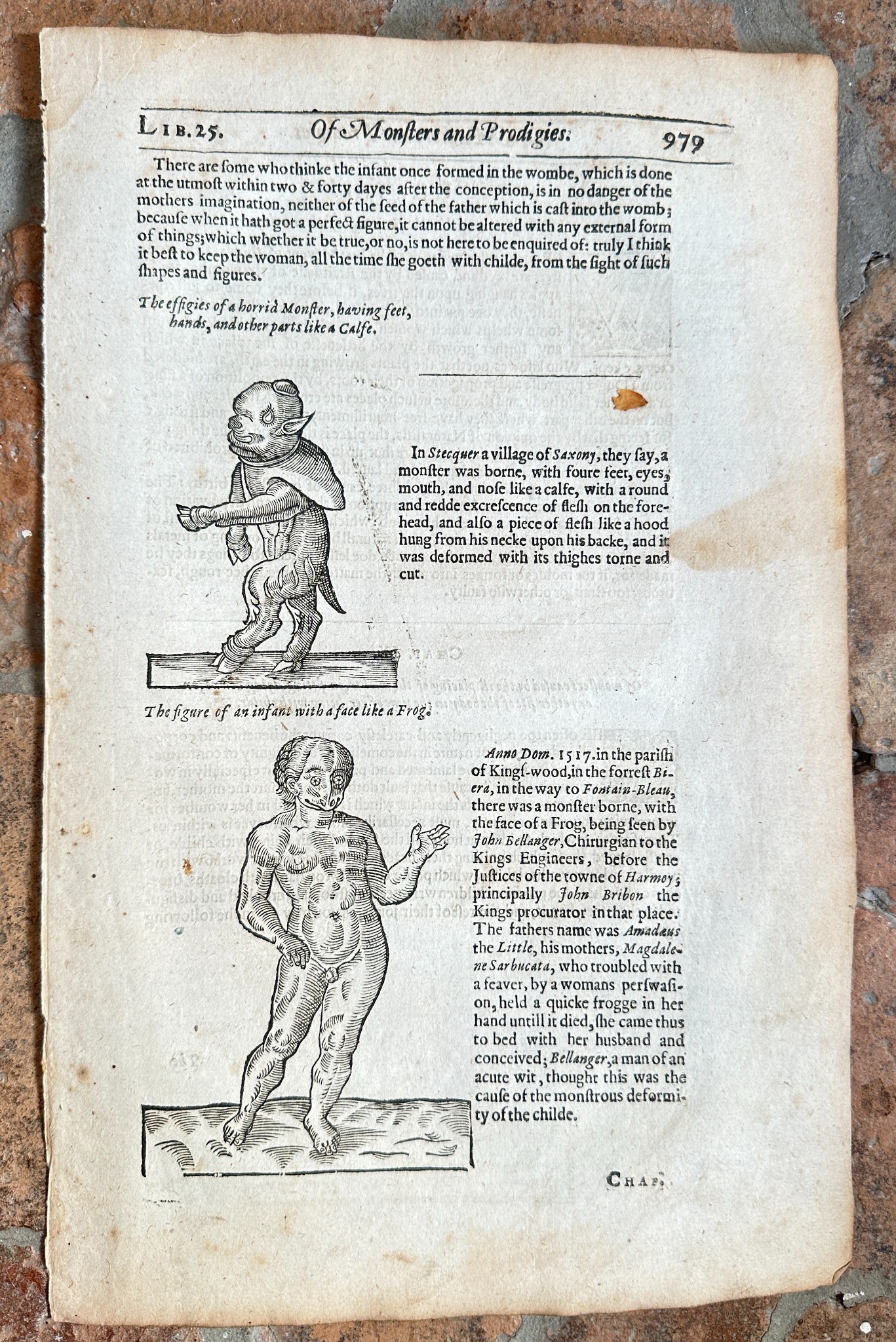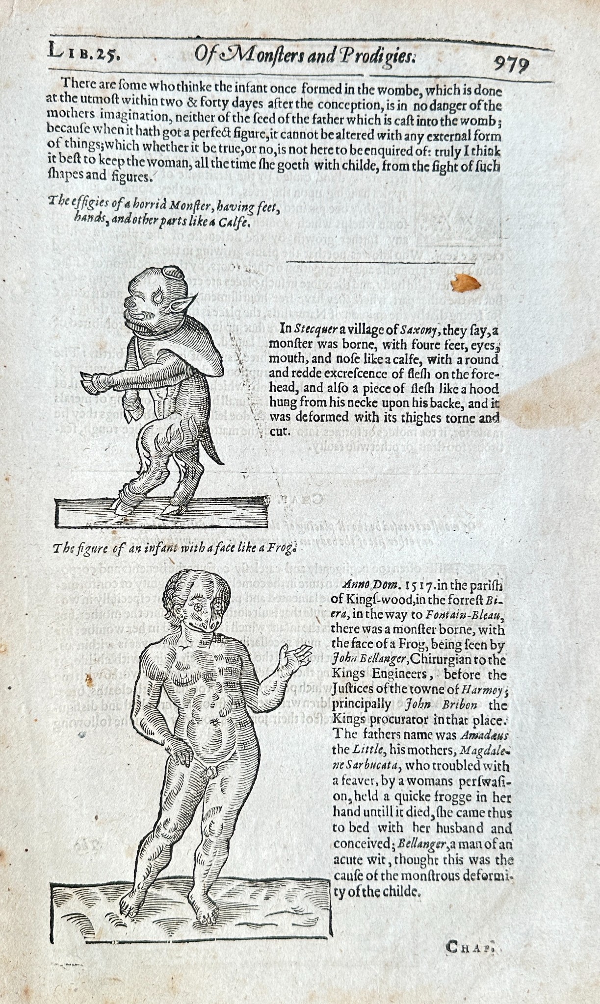 A woodcut print from a page of an old text, featuring two separate illustrations of monstrous creatures. The upper image depicts a being with a human body and a dog-like or pig-like head, while the lower image shows a nude human figure with the face of a frog. Both illustrations are accompanied by descriptive text in old English, which provides accounts of these unusual births in Saxony and France. The print serves as a document of early modern beliefs about natural abnormalities and is characteristic of the encyclopedic works of the period.