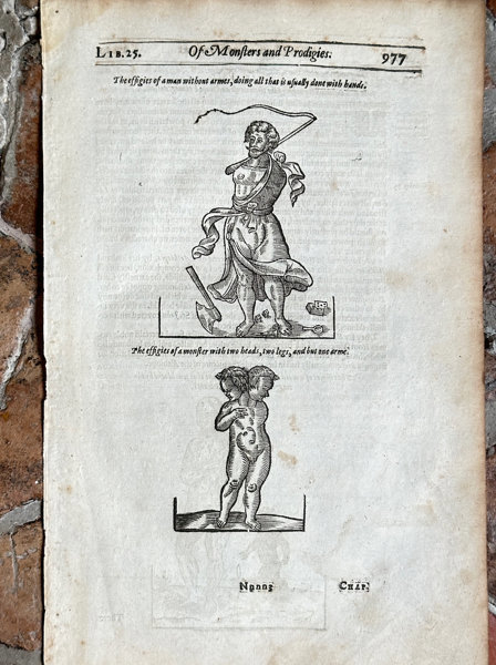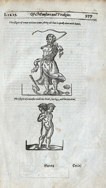 This woodcut, from the English translation of Ambroise Paré's Des Monstres et Prodiges, features two illustrations of human anomalies. The top woodcut depicts a figure described as a man without arms who uses his feet to perform tasks, a subject of medical curiosity during the period. The lower illustration shows a figure with two heads and two legs, but only one arm. These images are from the section of the work titled "Of Monſters and Prodigies," and they reflect the historical medical and scientific efforts to document and categorize physical variations, which were a topic of fascination in the 17th century.