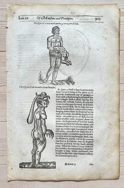 This striking woodcut print originates from Ambroise Paré's famous work, On Monsters and Prodigies. This specific English edition was published in 1634. The print features two distinct illustrations of human anomalies: the upper image depicts "The effigies of a man with a master growing out of him", while the lower panel shows "The effigies of the horned or headed monster". These illustrations reflect 17th-century medical and cultural perspectives on congenital anomalies, serving as a historical record of observations and beliefs surrounding such "prodigies."