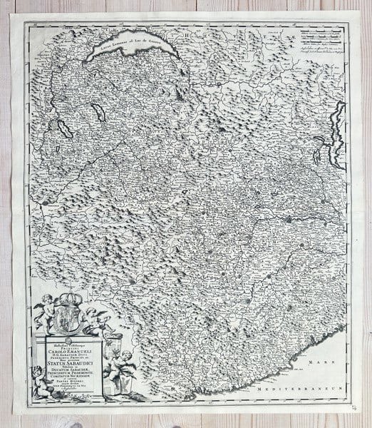 This detailed engraved map, titled "CHARTE DELLE ALPI, E DE REGIONI VICINE, OGLIE STATVS SABAUDIÆ ET MONTISFERRATI." (Map of the Alps, and Nearby Regions, of the States of Savoy and Montferrat), was created by Guillaume Sanson, Royal Geographer. Published circa 1690s, this map provides an intricate representation of the mountainous terrain of the Alps, along with the historical territories of Savoy and Montferrat (now parts of France and Italy). It meticulously details rivers, numerous towns and settlements, and political boundaries, reflecting the advanced cartographic knowledge and refined engraving style of the late 17th century.