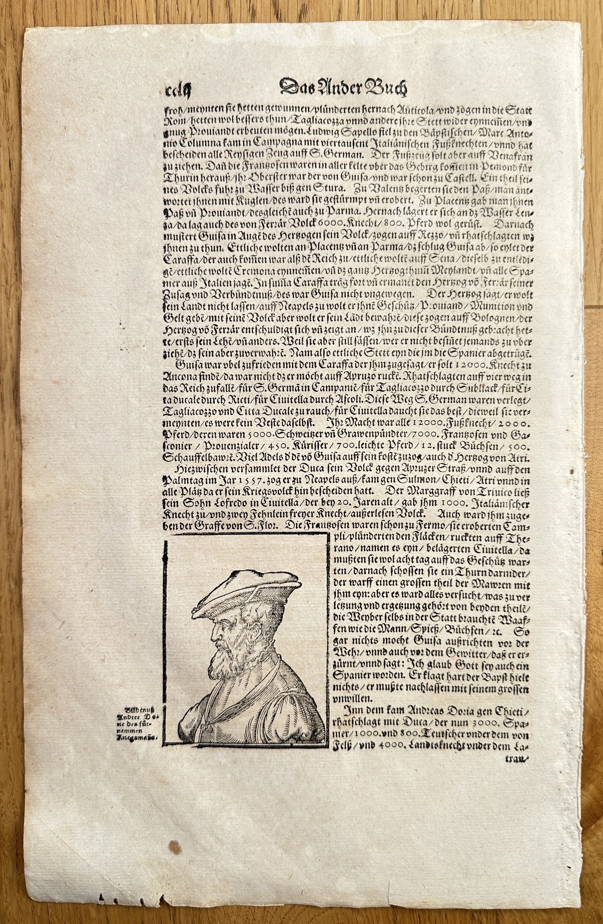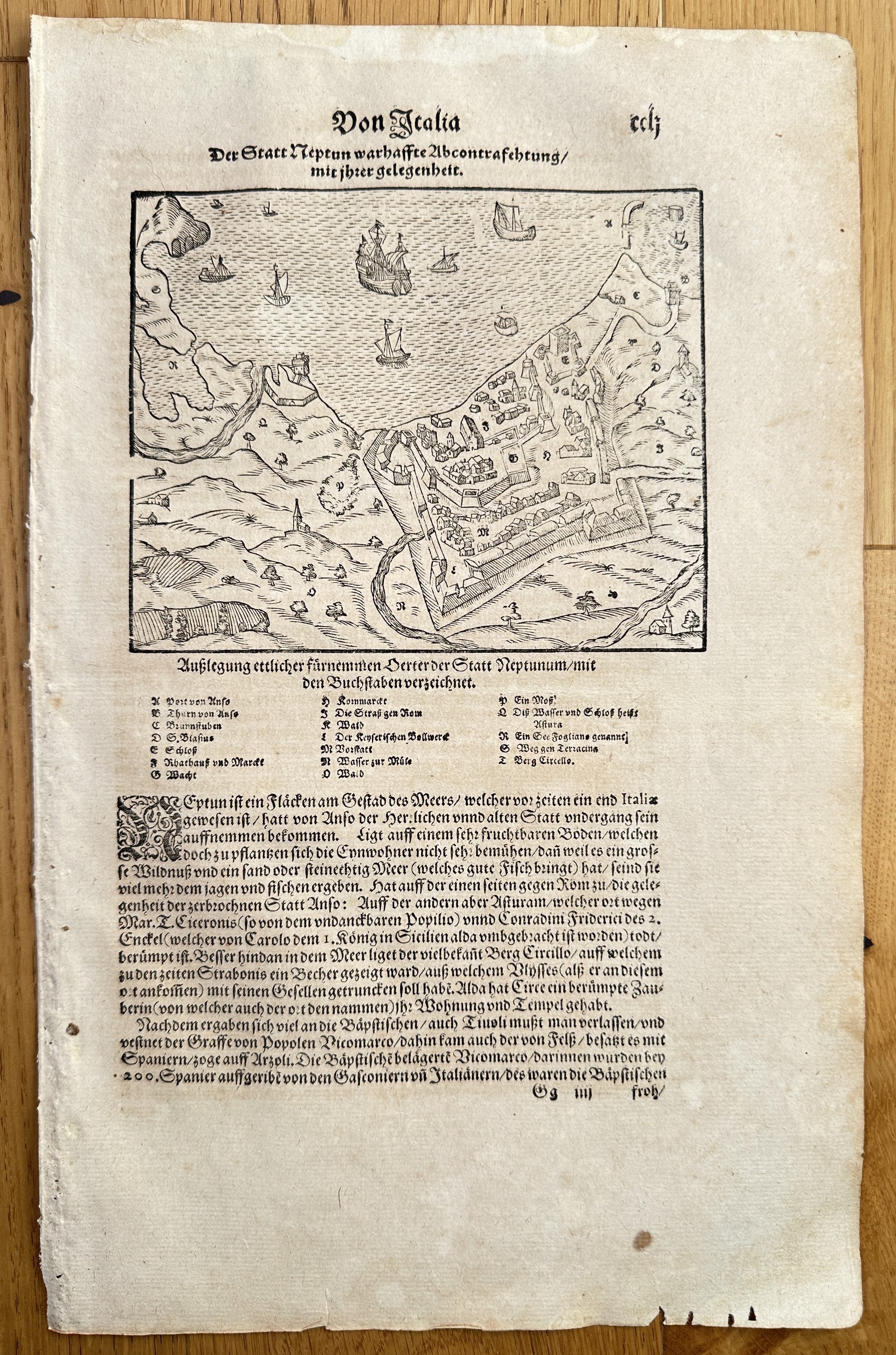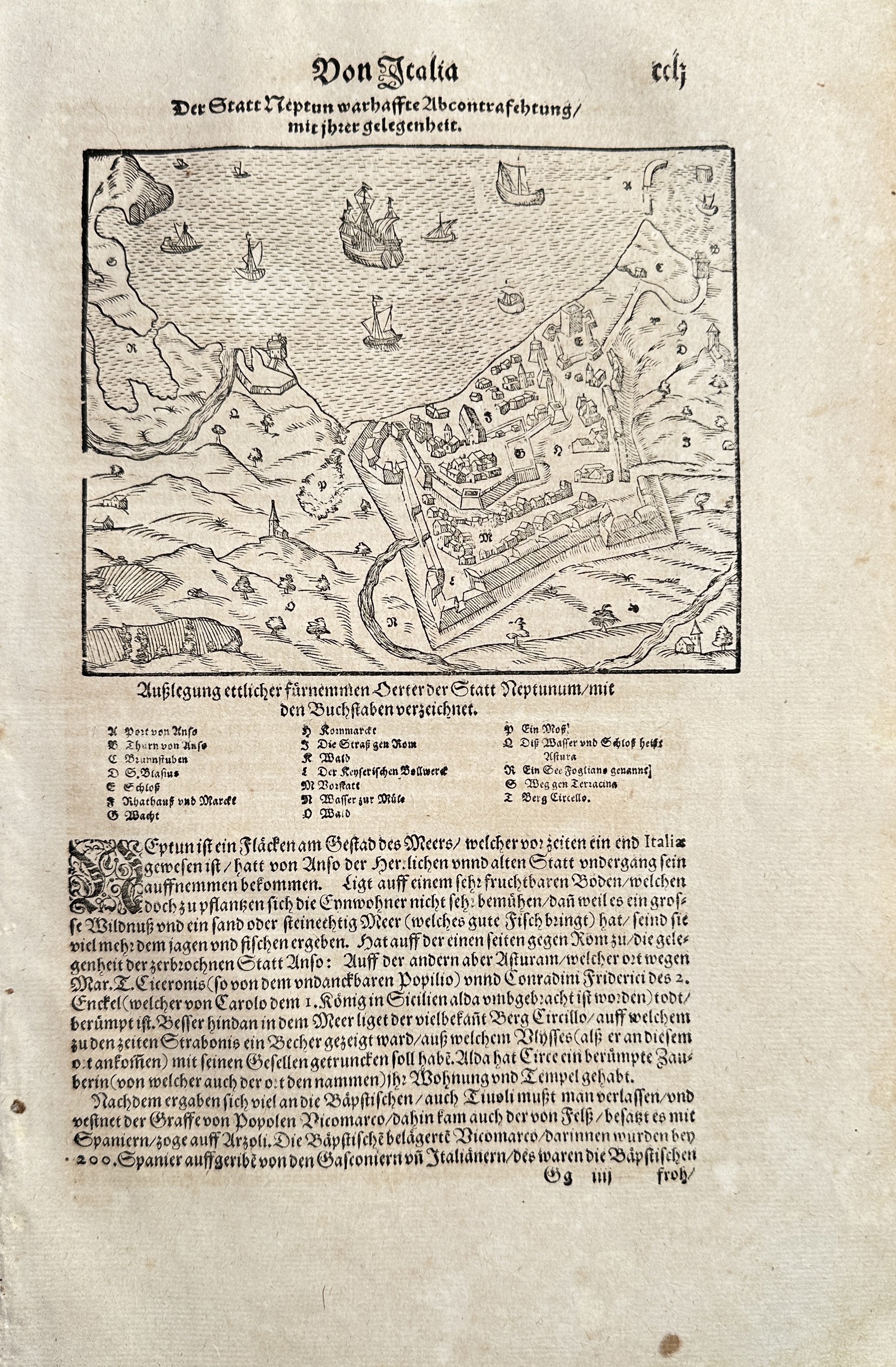 This sheet is an original map and text page, taken from a section titled "Von Italia" (Concerning Italy). The page features a woodcut bird's-eye view of the city of Naples, Italy, which is labeled as "Die Statt Neptun" (The City of Neptune). The view clearly depicts the coastline, the harbor filled with ships, the city's fortifications, and the surrounding topography. A small legend below the image identifies key locations within the city. The German letterpress text discusses the geography and historical significance of the region. This topographical and map work originates from a posthumous edition of Sebastian Münster’s renowned Cosmographia, the pivotal 16th-century compendium of world geography, which helped define the Renaissance understanding of European cities.