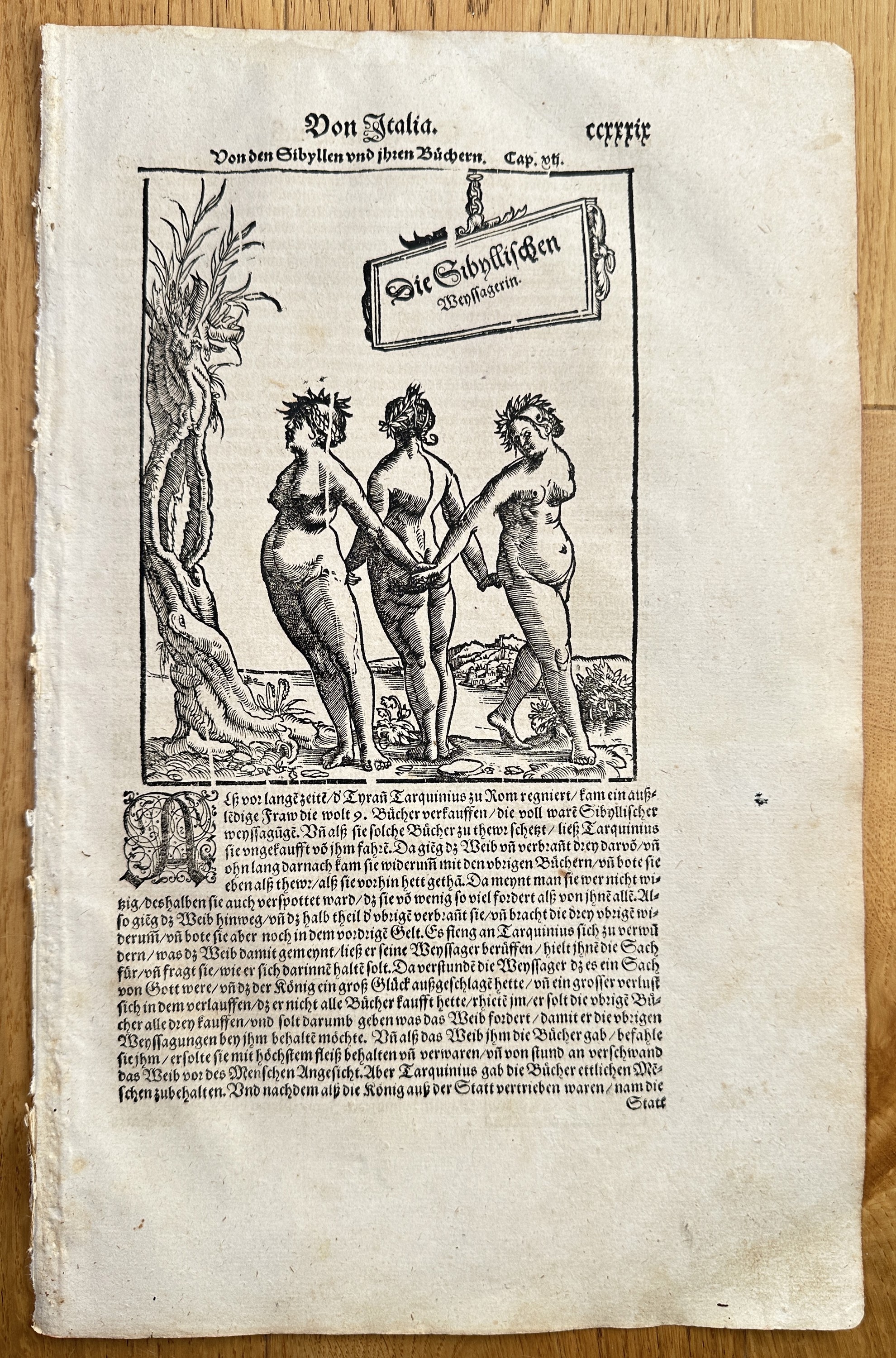 This sheet is an original text and woodcut page, taken from a section titled "Von Italia" (Concerning Italy). The main image is an allegorical woodcut titled "Die Sibyllischen Weissägerin" (The Sibylline Prophetesses). The scene depicts three nude or semi-nude female figures holding hands and dancing around a tree, representing the Sibyls associated with the ancient Roman prophetic books. The surrounding German letterpress text discusses the origin and history of the Sibylline Books in Rome and Italy. This illustration originates from a posthumous edition of Sebastian Münster’s renowned Cosmographia, the pivotal 16th-century compendium of world history and mythology, which incorporated both classical history and contemporary geography.