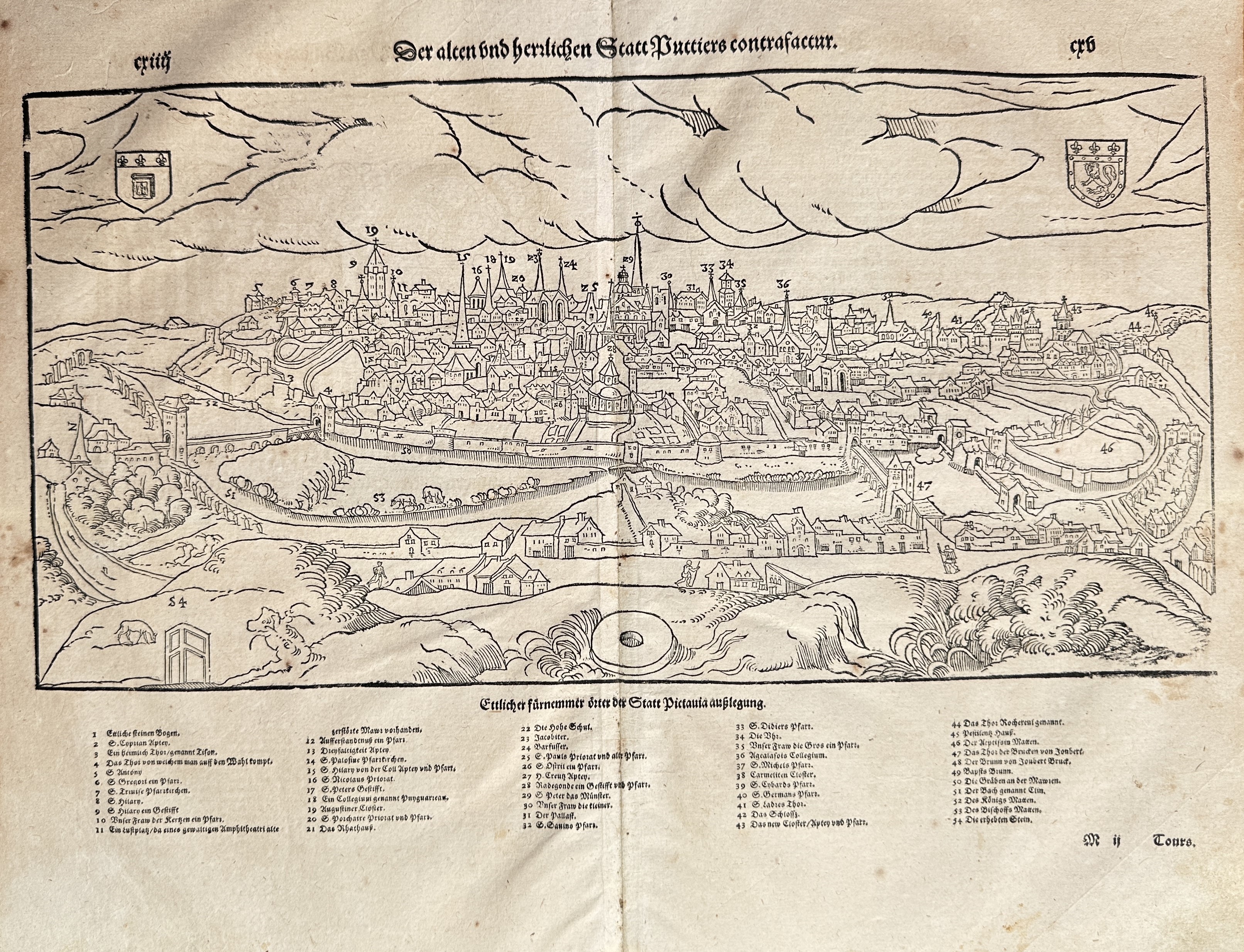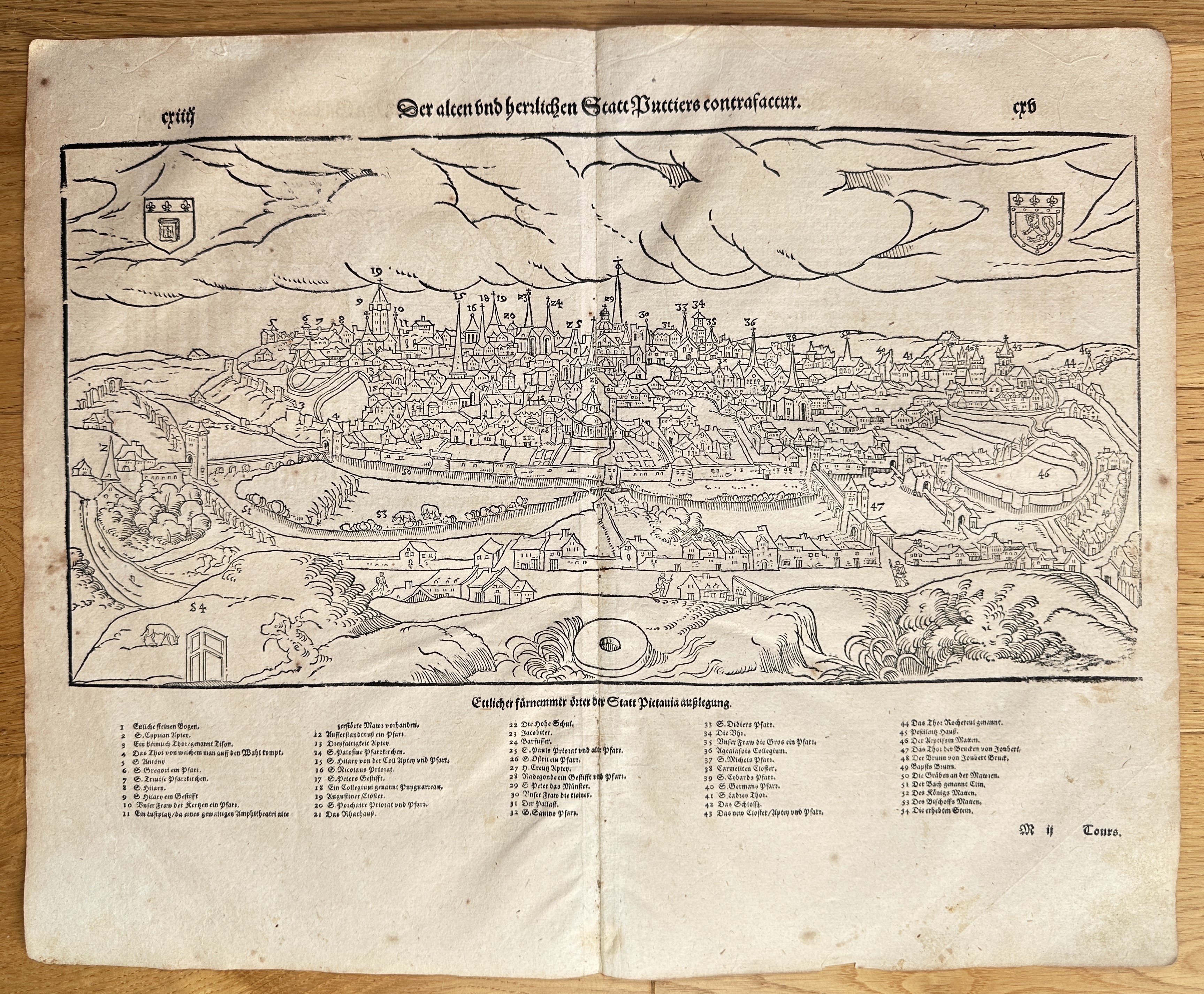 This sheet is an original double-page map and text spread, titled "Der Alten und Herrlichen Statt Spirae Contrafactur" (Representation of the Ancient and Glorious City of Speyer). The dominant feature is a detailed, panoramic bird's-eye city view of Speyer, Germany, located on the River Rhine. The view depicts the walled city, its major religious and municipal buildings, and the surrounding fields and topography. The top corners feature two coats of arms, and a detailed numbered legend beneath the image identifies numerous key landmarks of the city. This topographical map originates from a posthumous edition of Sebastian Münster’s renowned Cosmographia, the pivotal 16th-century compendium of world geography, which was essential in visually documenting the cities of the Holy Roman Empire.