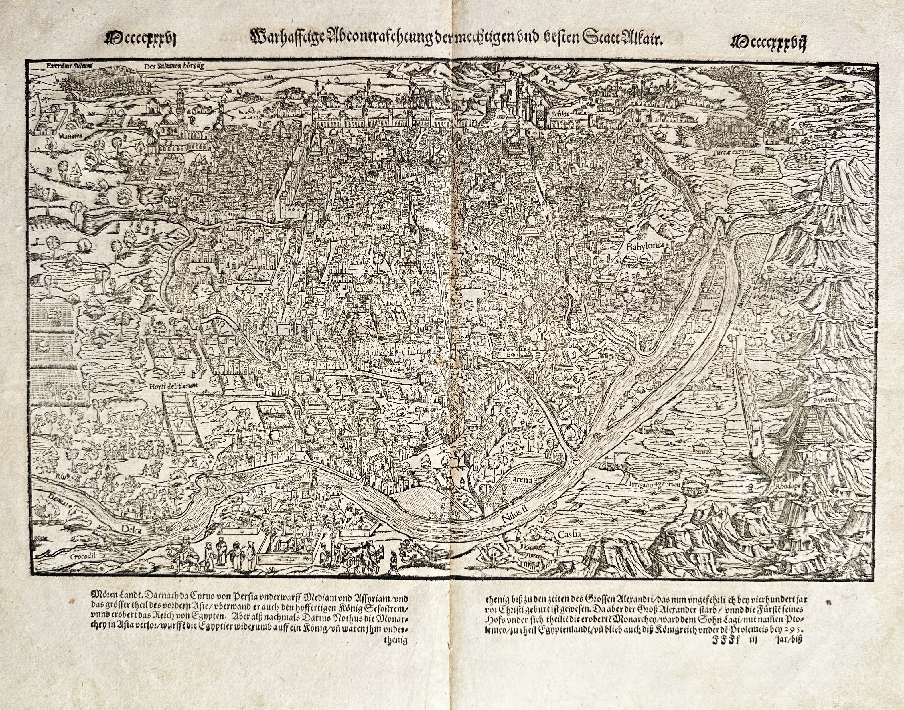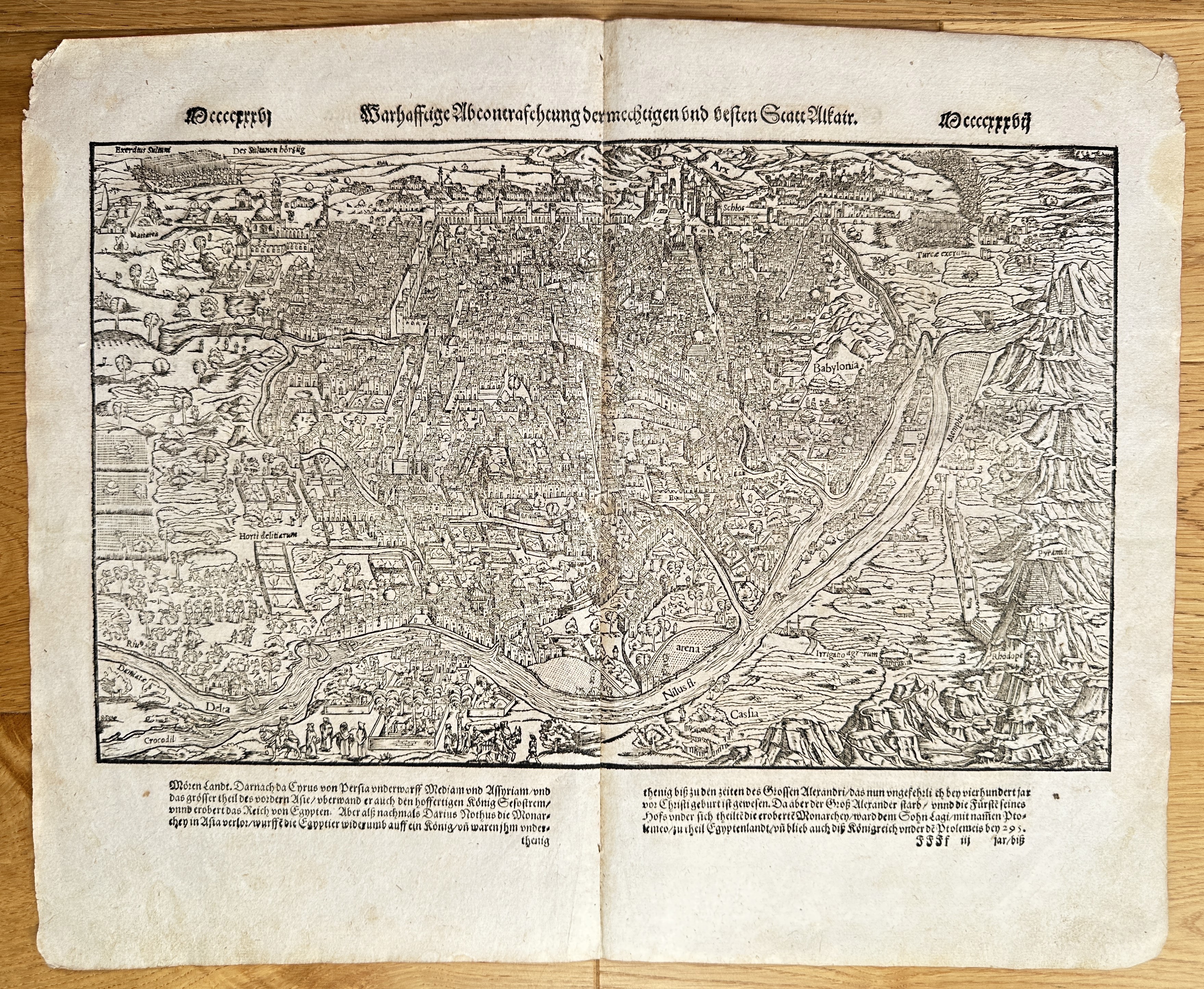 This sheet is an original double-page map and text spread, titled "Warhafftige Abconterfactung der Herrlichen und Besten Statt Mäcker" (True Representation of the Glorious and Best City of Mâcon). The dominant feature is a highly detailed, panoramic bird's-eye city map of Mâcon, France, situated along a wide bend of the Saône River. The view captures the urban density, fortifications, and the cultivated and hilly landscape surrounding the city. Below the main image, German letterpress text discusses the city's historical significance and surrounding territories. This topographical and map work originates from a posthumous edition of Sebastian Münster’s renowned Cosmographia, the pivotal 16th-century compendium of world geography, which visually documented many important European cities.