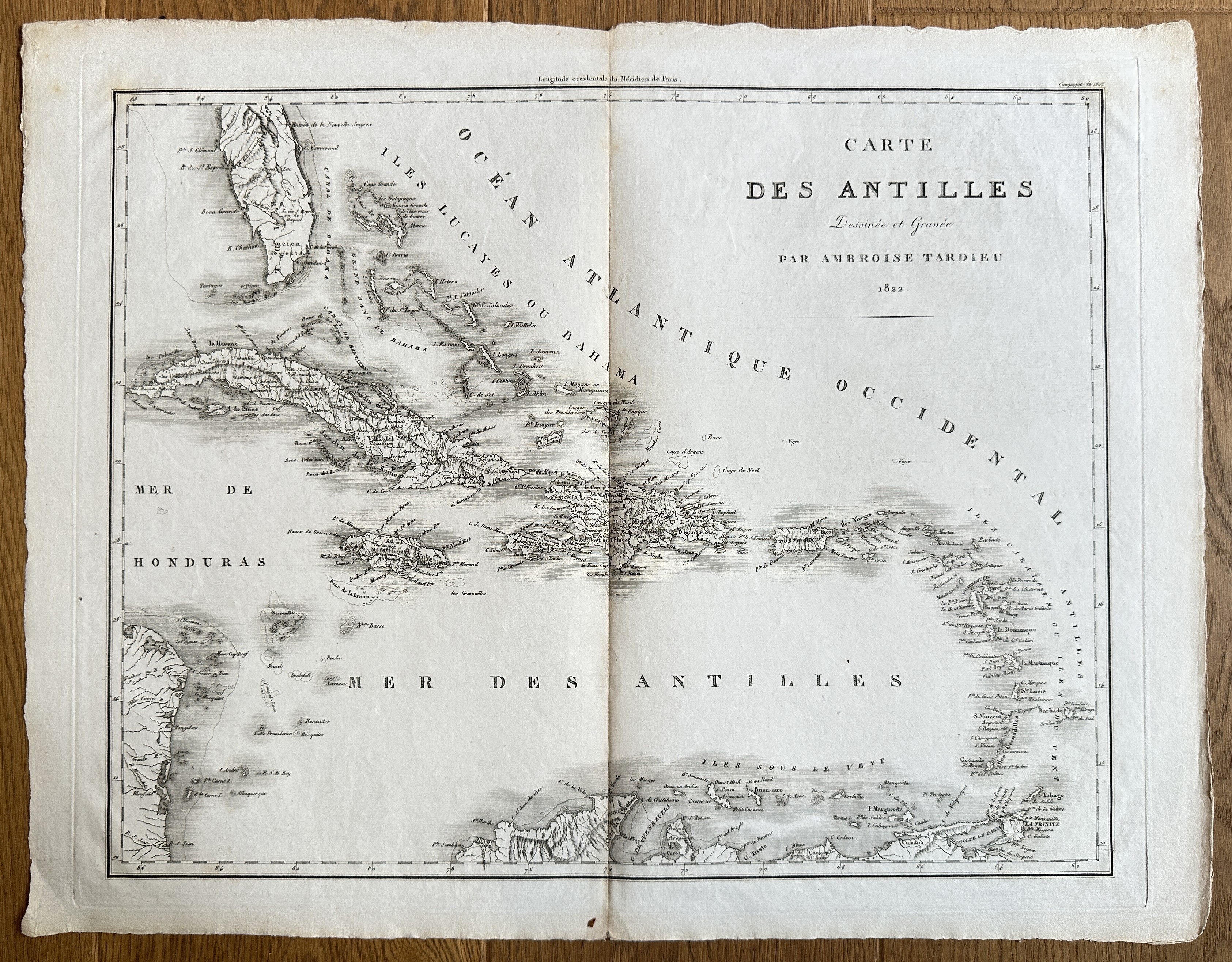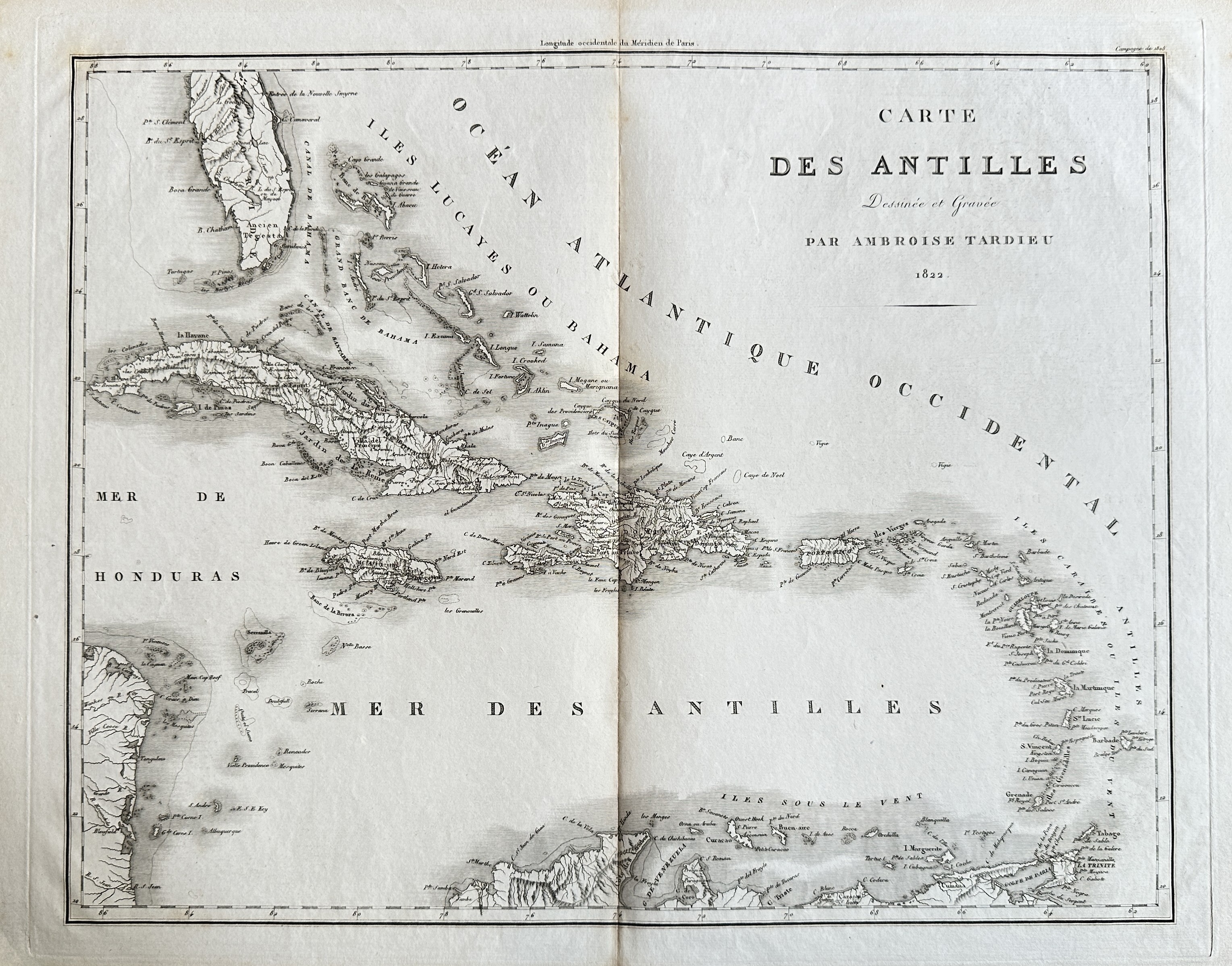 This finely engraved historical map, titled "Carte des Antilles" (Map of the Antilles), depicts the entire arc of the Caribbean islands, the Bahamas (Iles Lucayes ou Bahama), the western Atlantic Ocean (Océan Atlantique Occidental), the Caribbean Sea (Mer des Antilles), and portions of the adjacent mainland coastlines, including Honduras and the northern edge of South America. The map is clearly legible and detailed, providing an accurate representation of the region's geography, including the delineation of island chains and coastal profiles, from the perspective of early 19th-century French cartography. The map was both drawn and engraved by Tardieu and is a prime example of his work for various government bodies or large-scale atlases, such as the Atlas Universel de Géographie.