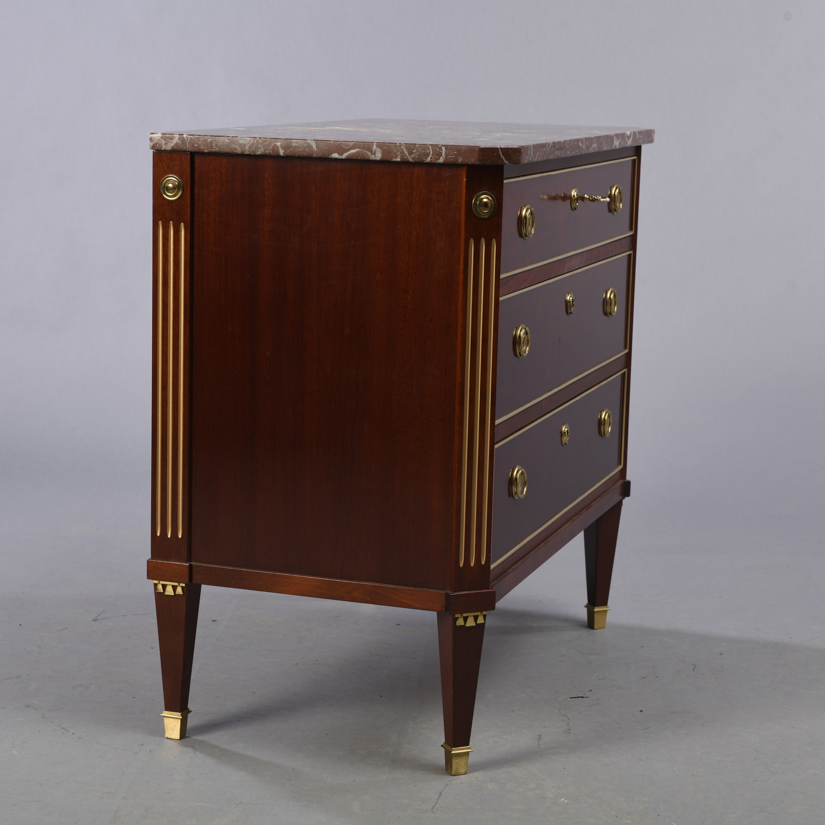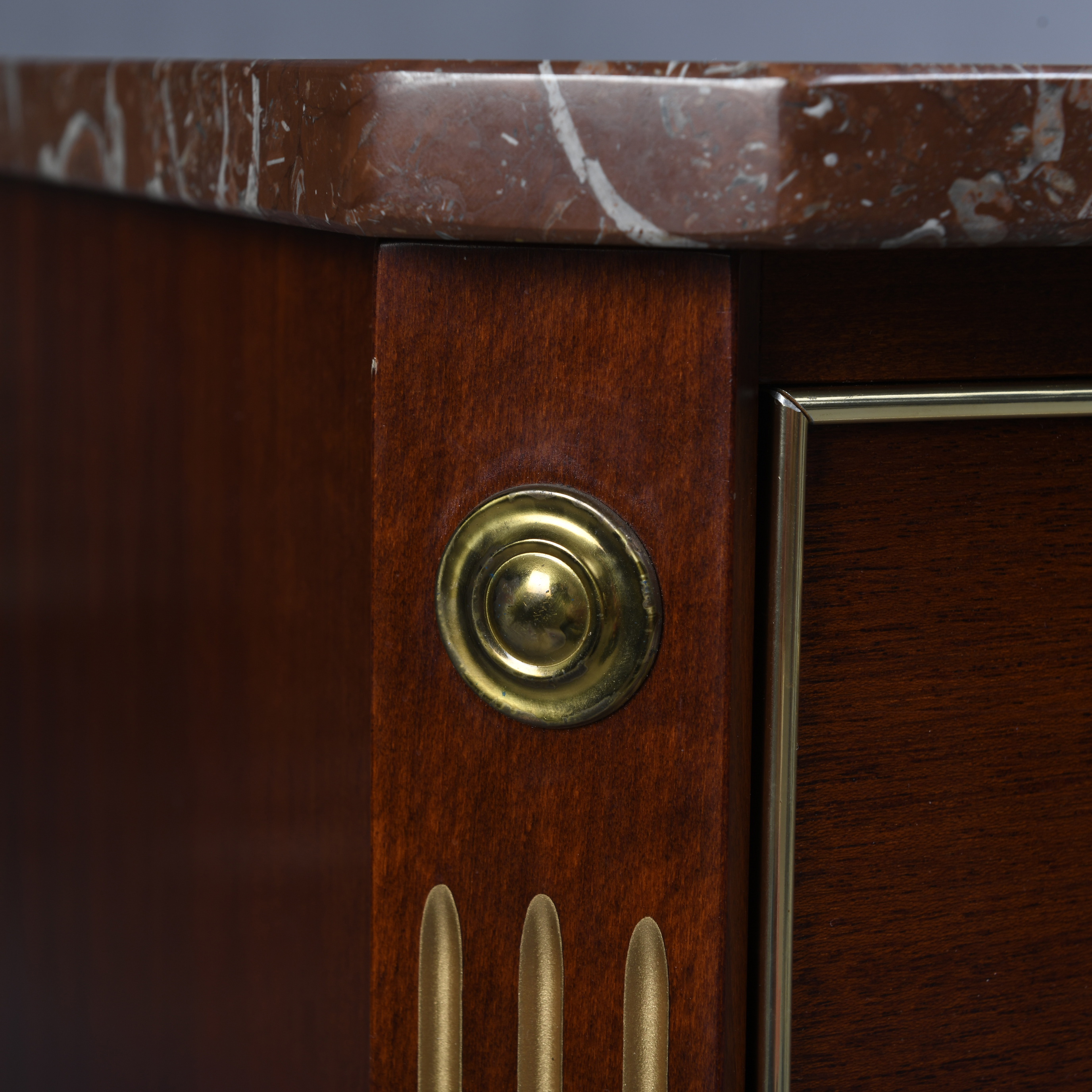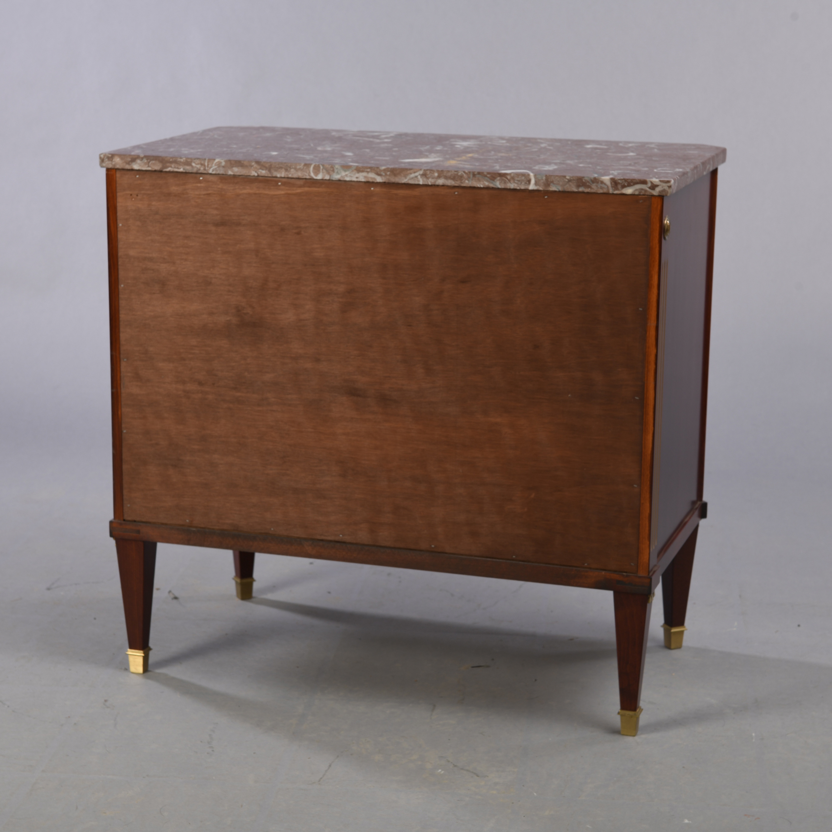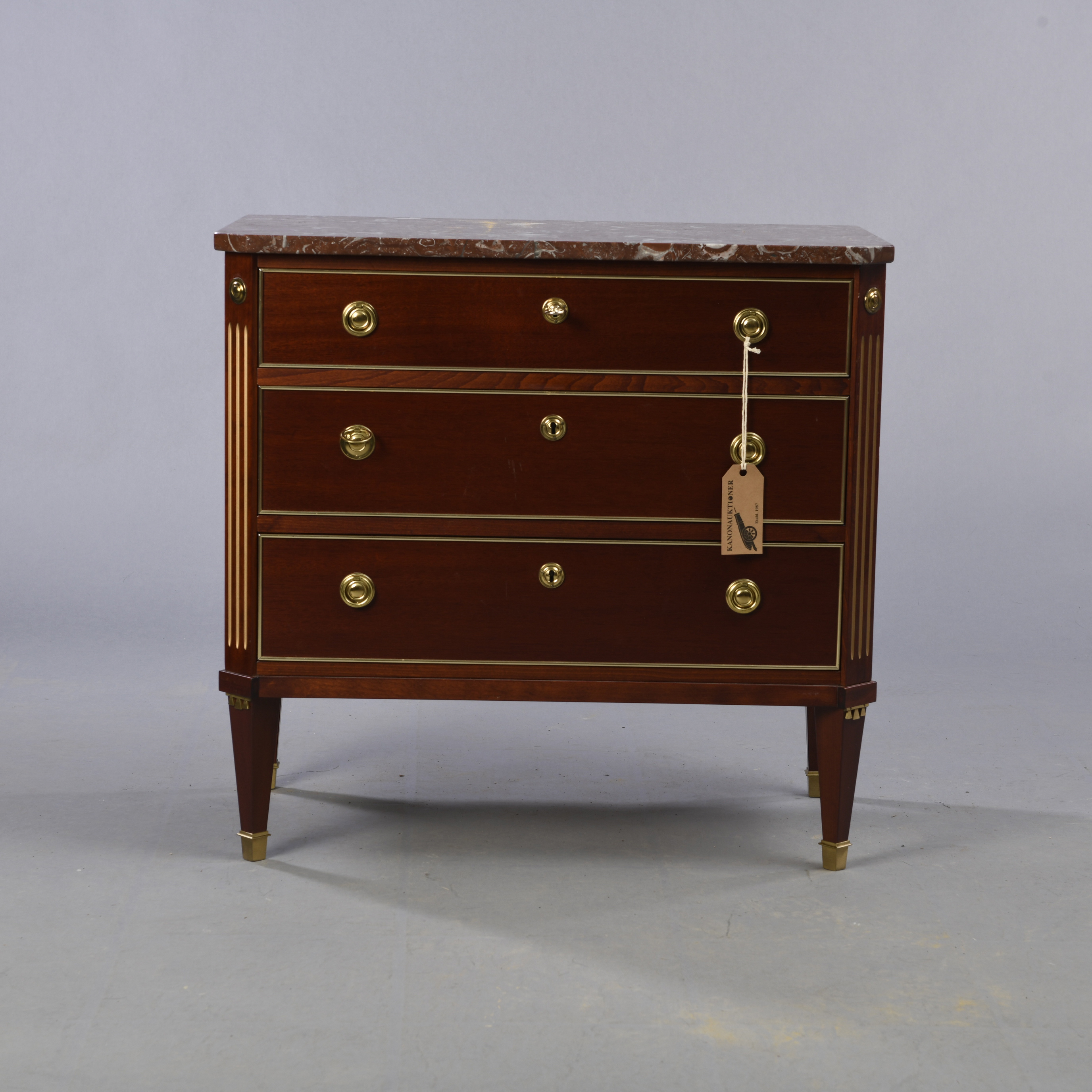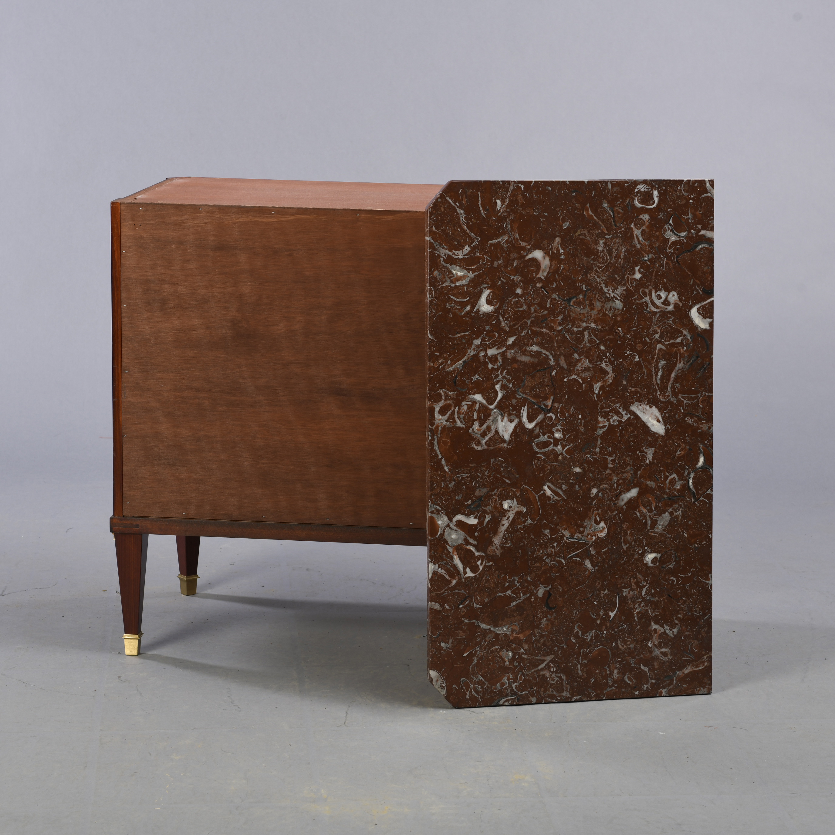 Fanerad i mahogny, skiva i marmor, beslat samt lister i mässing, höjd 75, 78 x 44 cm