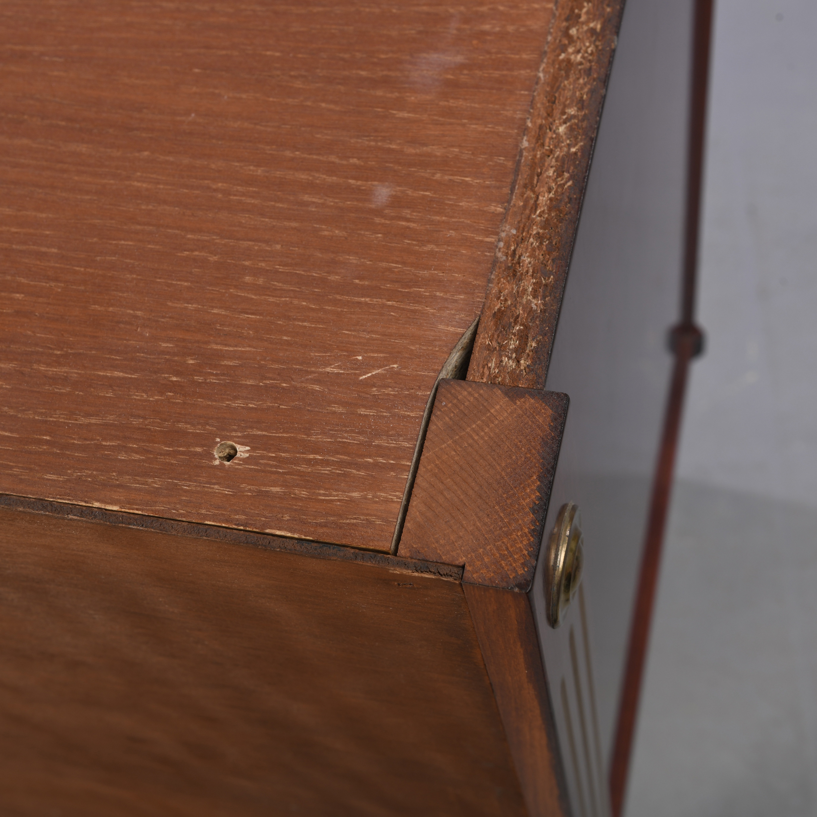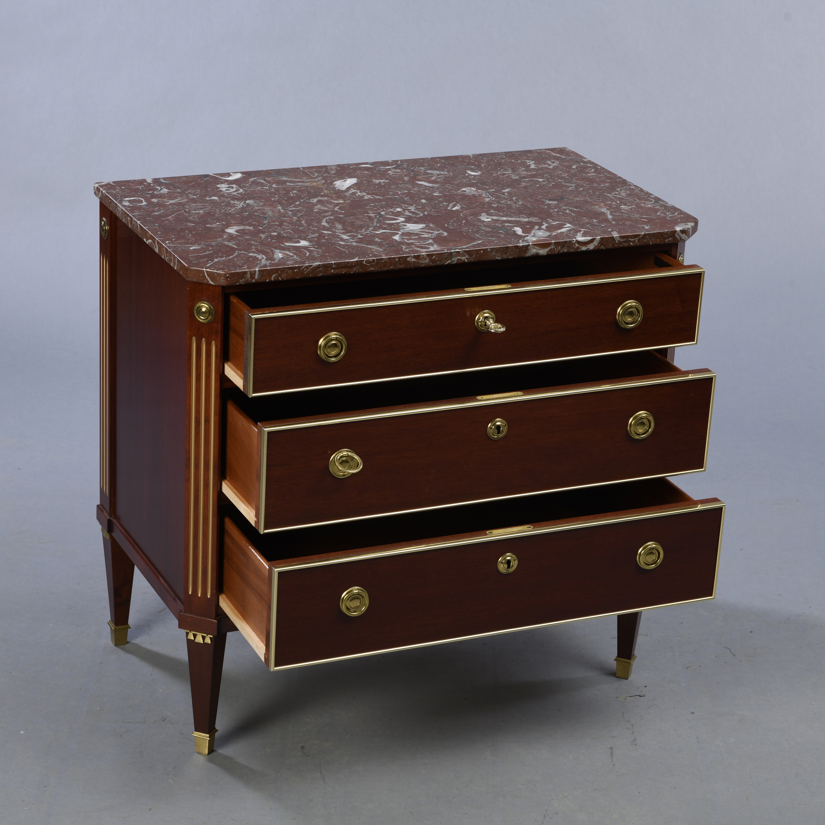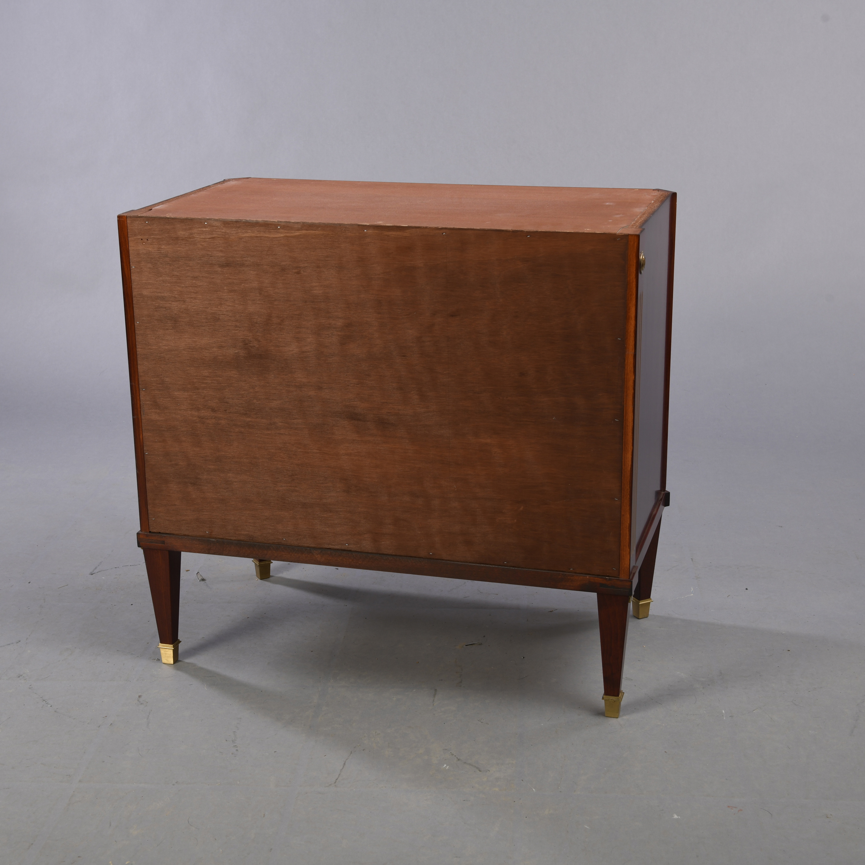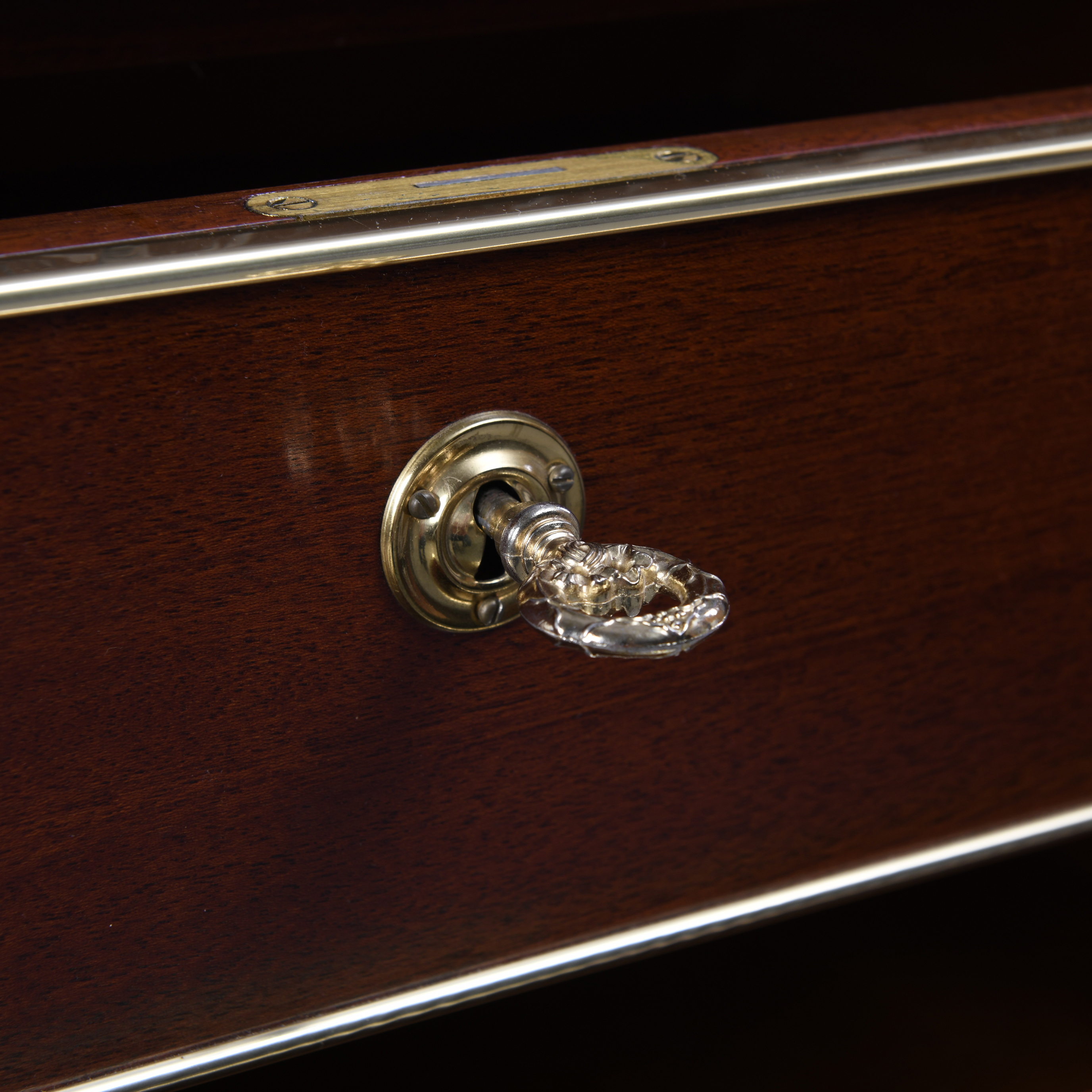 Fanerad i mahogny, skiva i marmor, beslat samt lister i mässing, höjd 75, 78 x 44 cm
