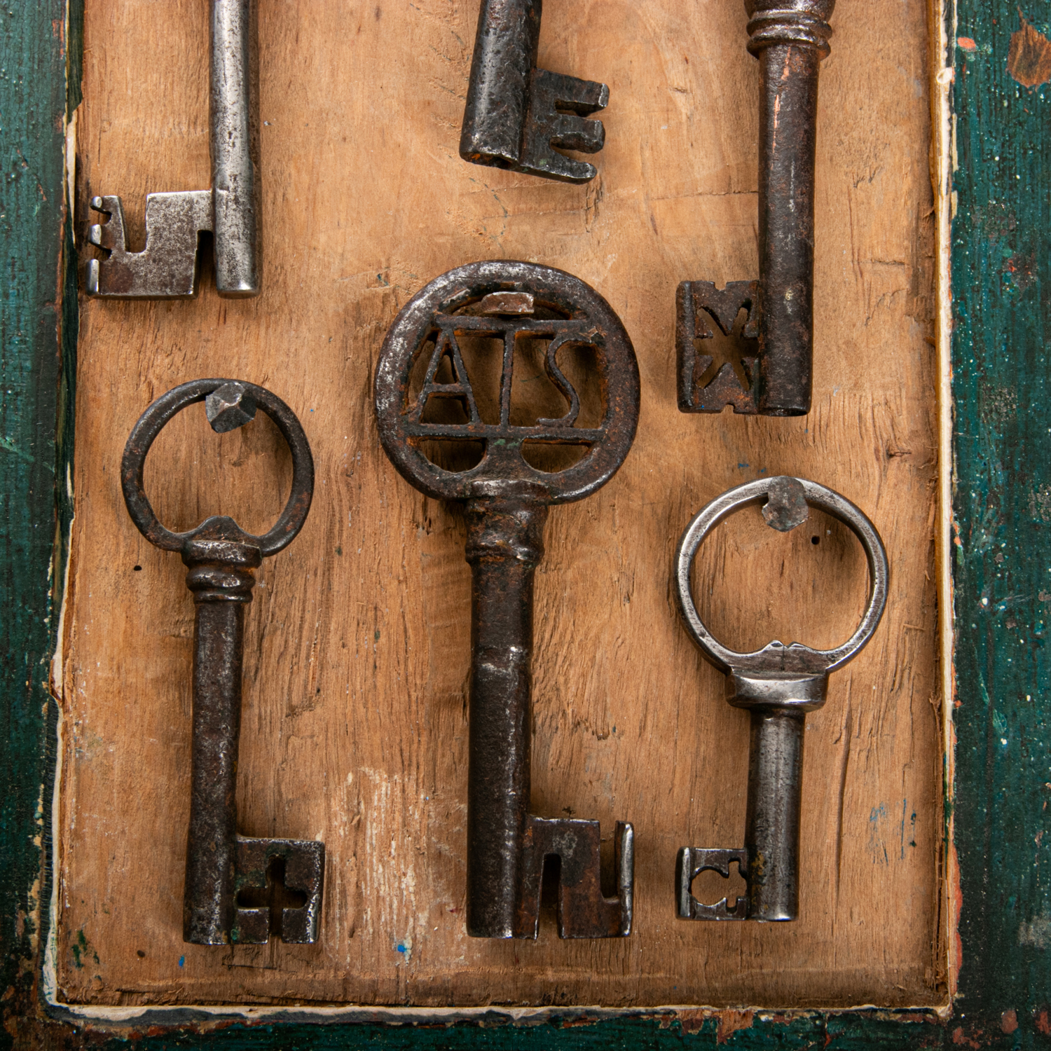 NYCKELTAVLA, bemålad, allmoge, innehållande 6 st nycklar, 17/1800-tal