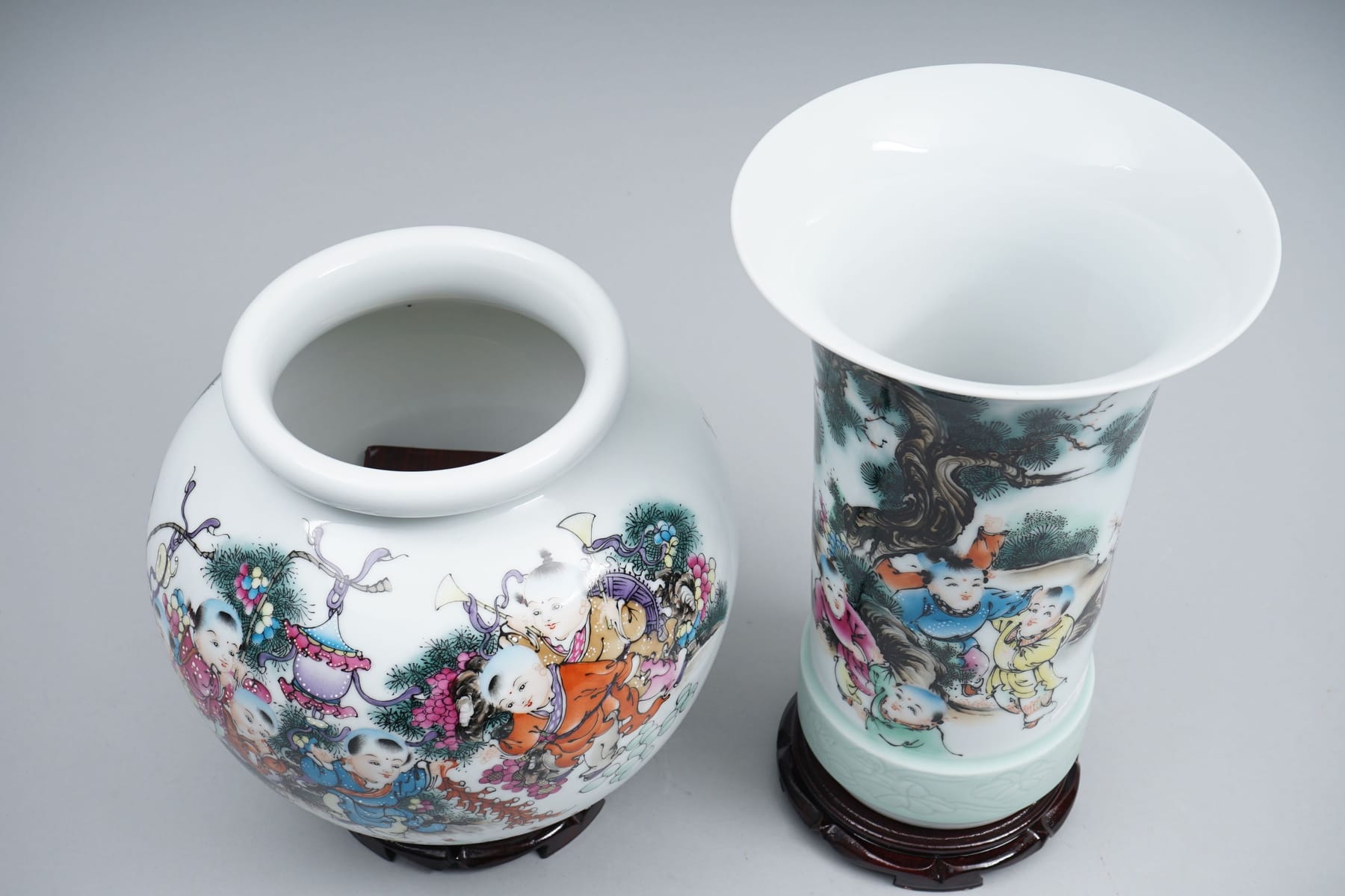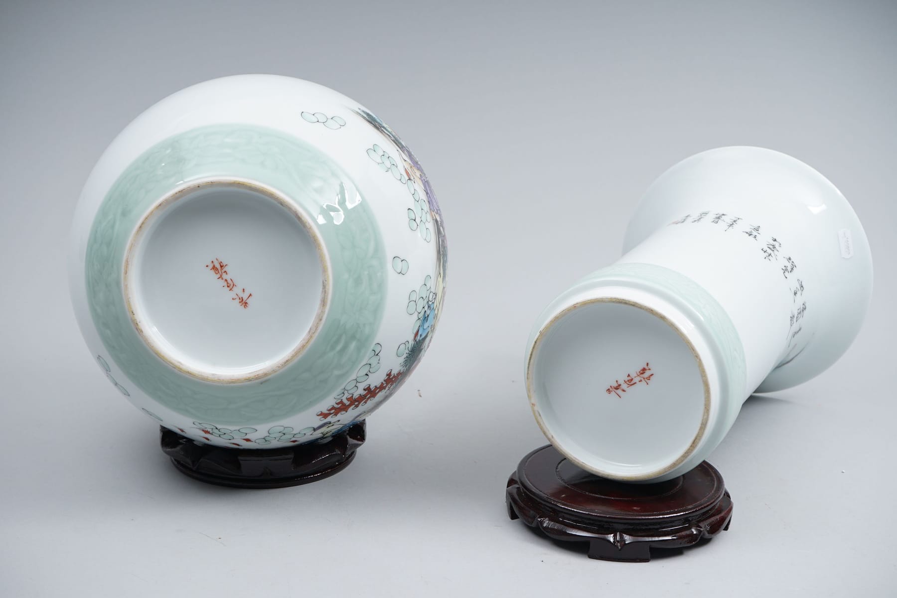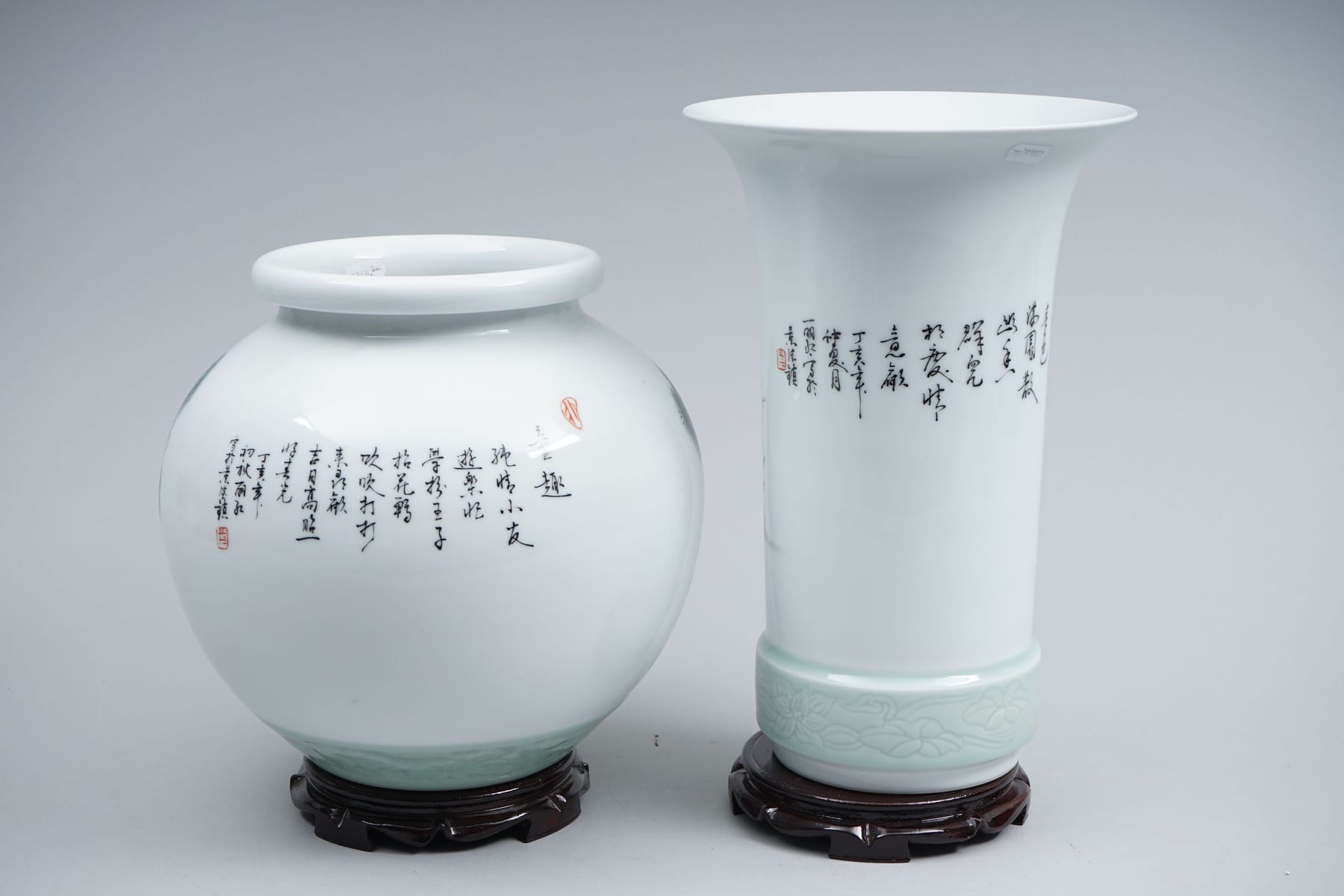 Bilder 2 kpl Kiinalaisia keramiikkamaljakoita puujalustoilla