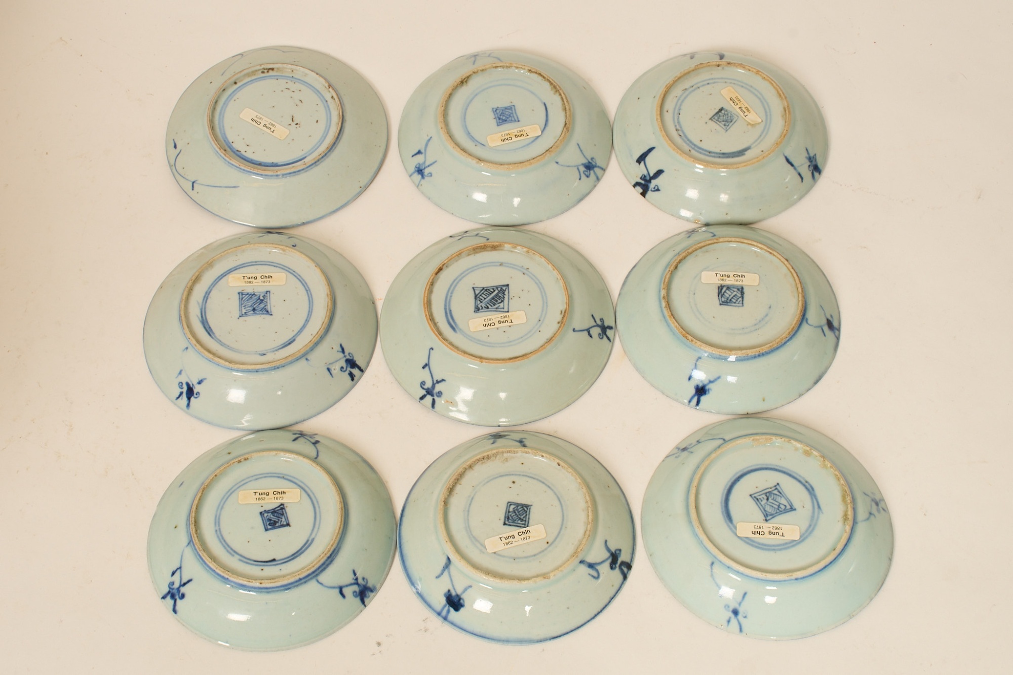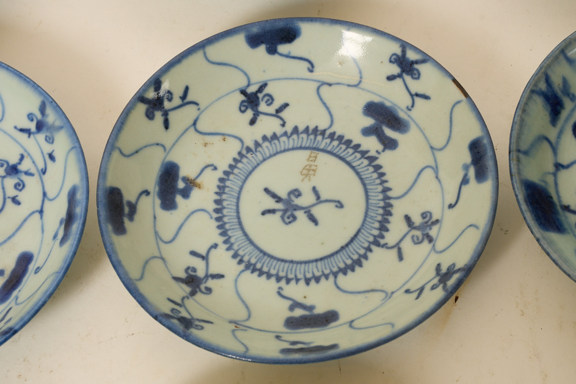 9 st, snarlika, dekor i underglasyrblått, diam ca 14 cm, tillverkningsdefekter, nagg förekommer.