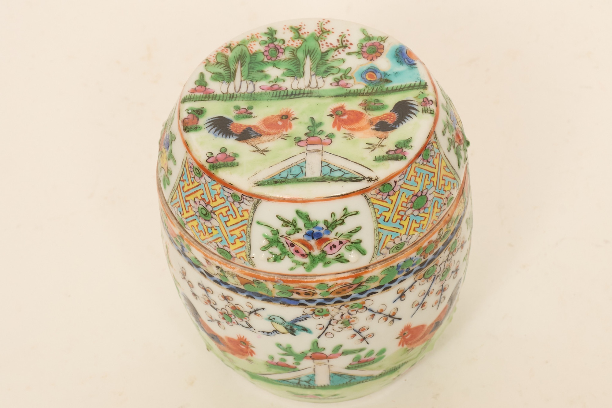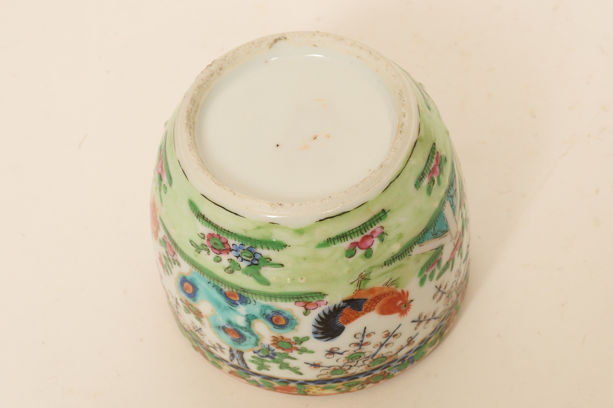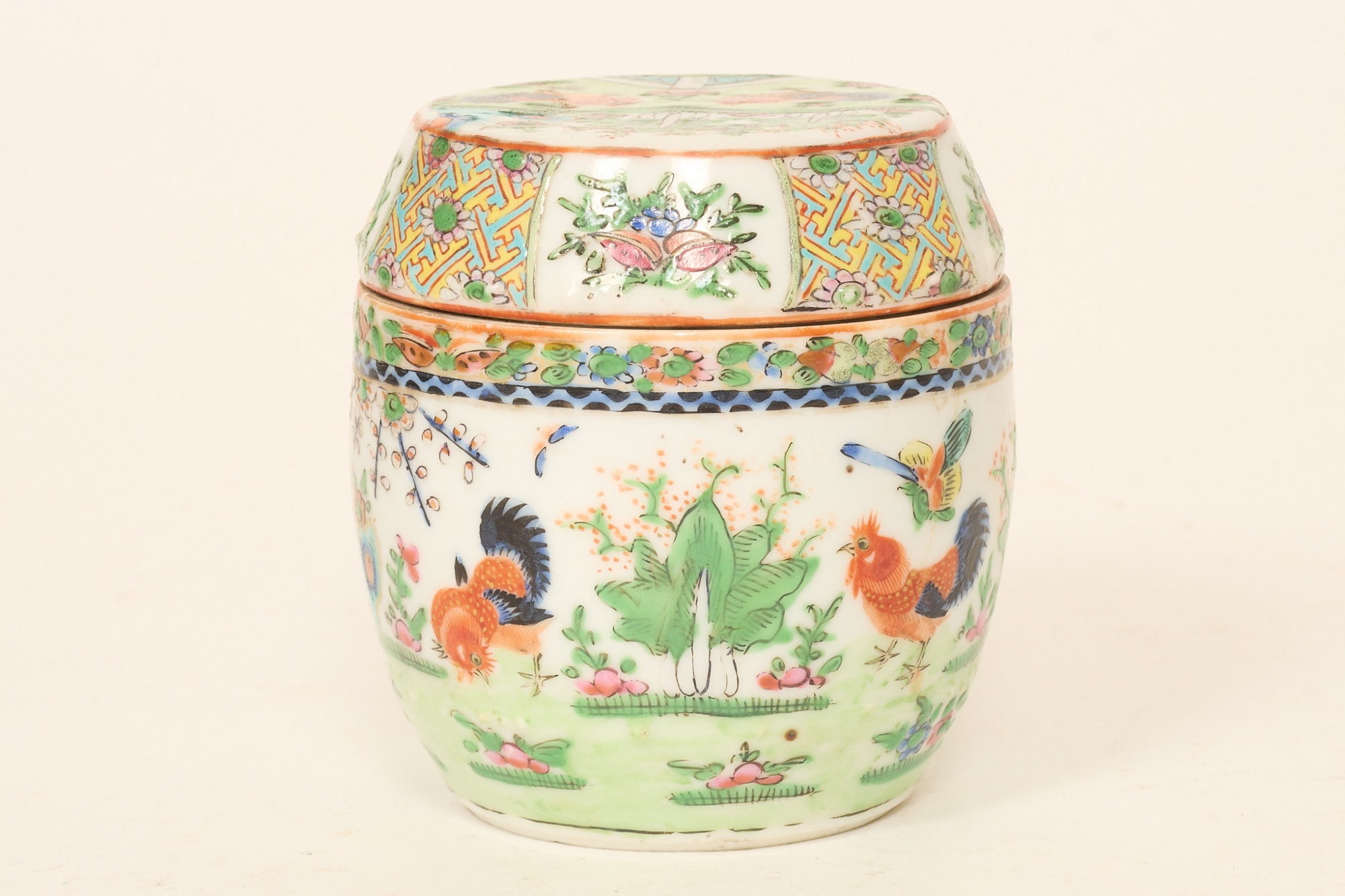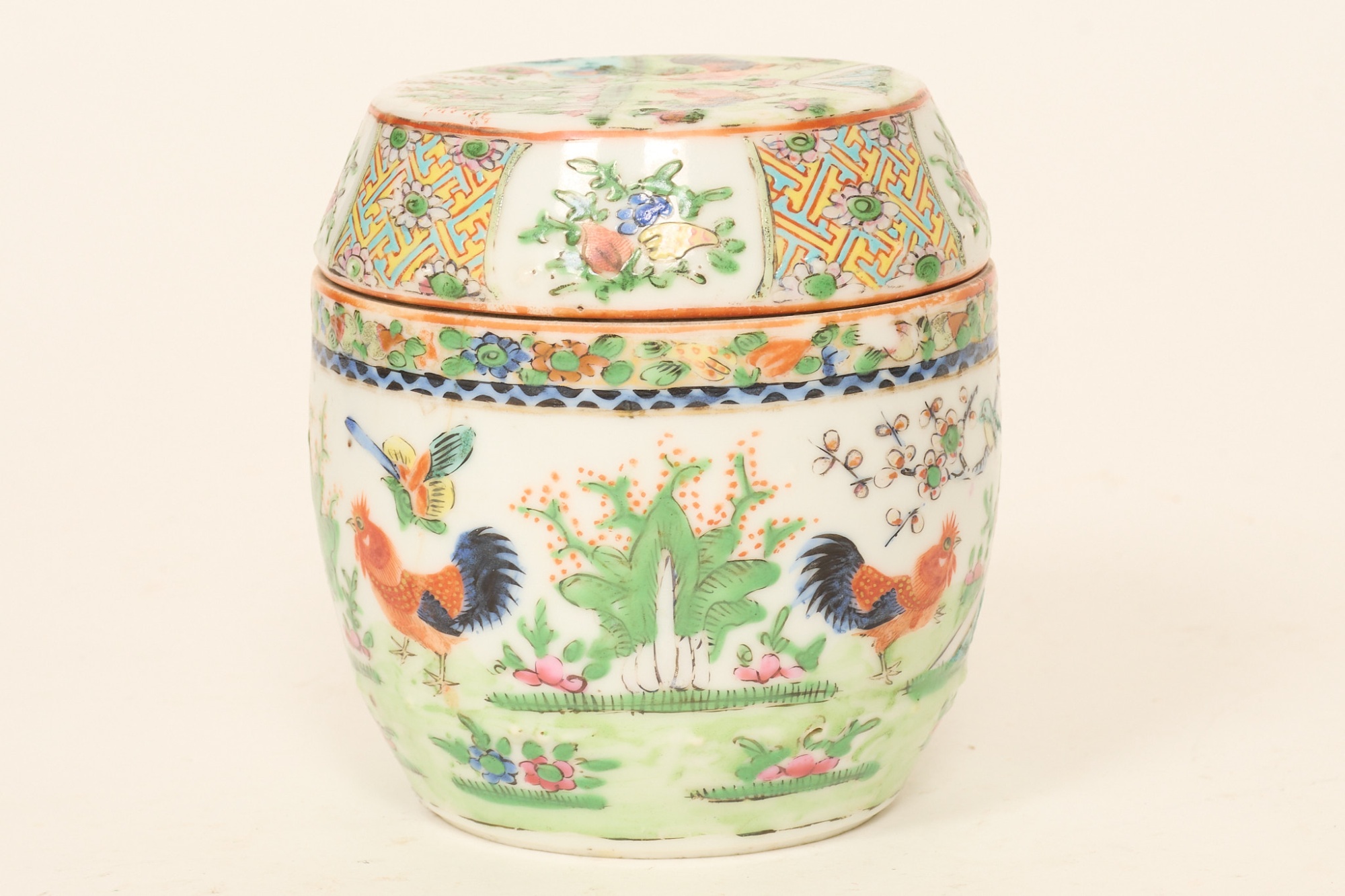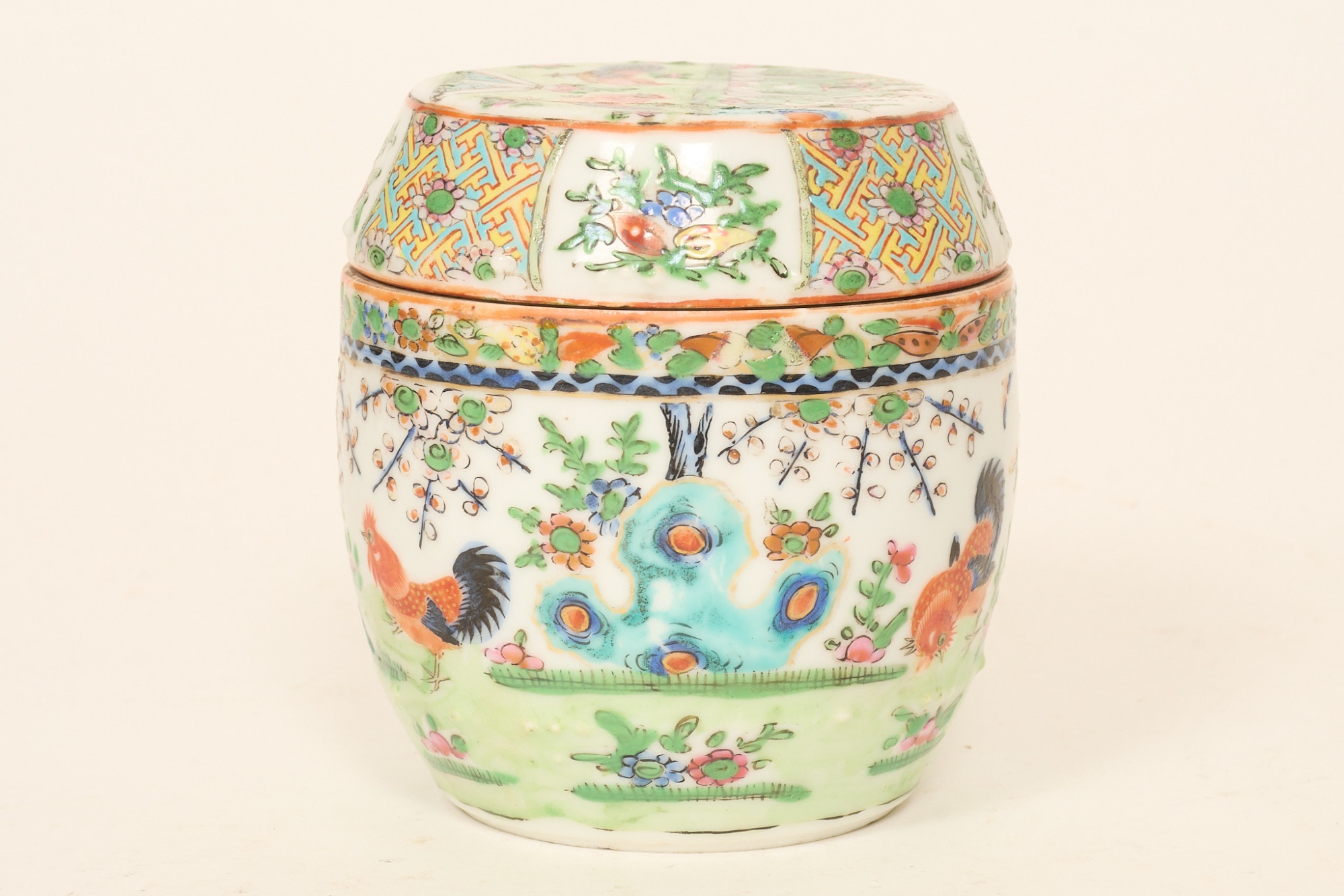 Polykrom dekor, med tuppar och växtlighet, höjd 11 cm. Hårsprickor, annars smärre bruksslitage.