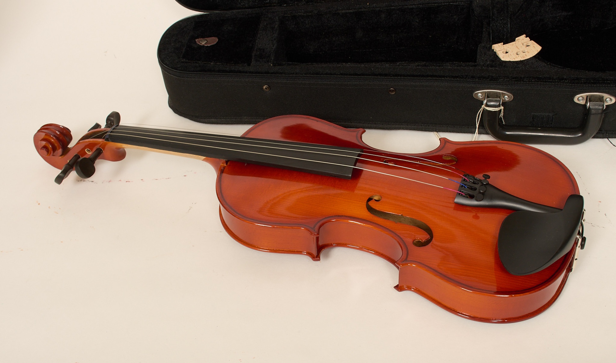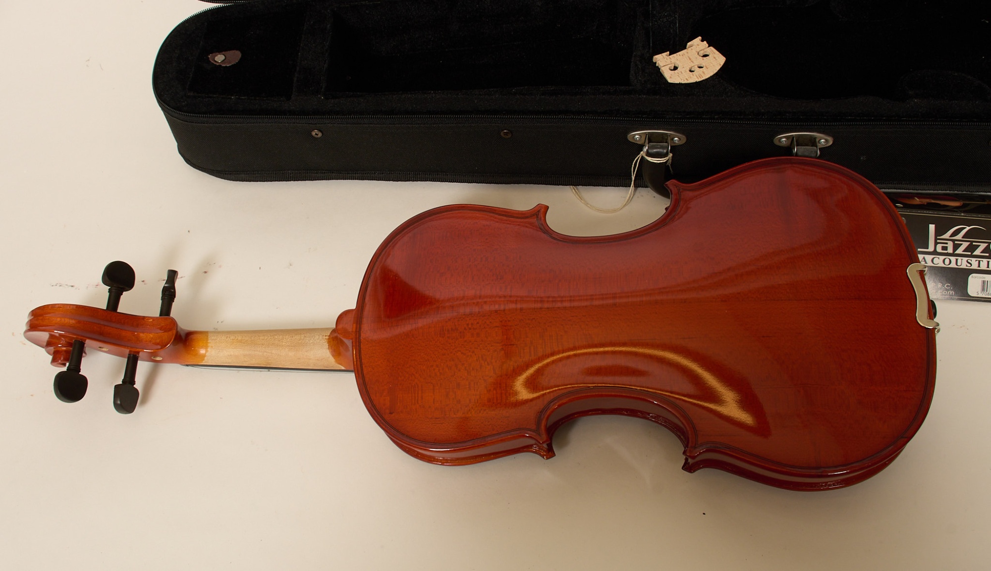 Förefaller oanvänd i fodral, stråke medföljer. Längd 59 cm.