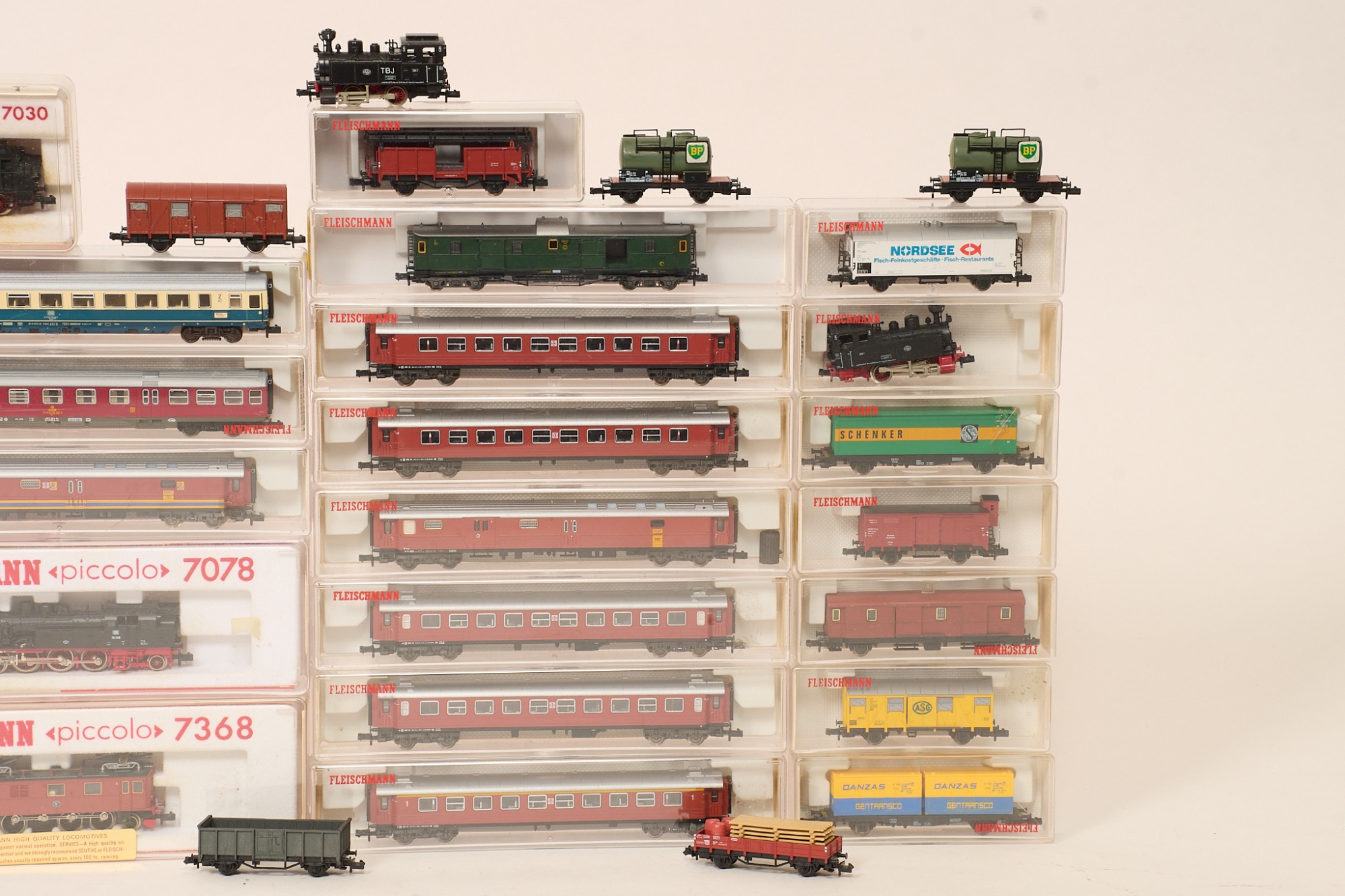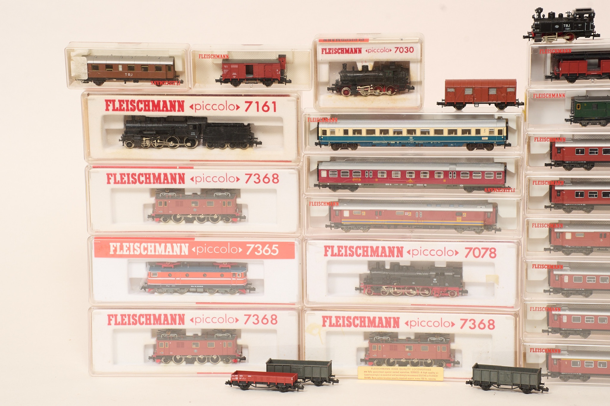 Fleischmann piccolo, 9 st lok, samt 26 vagnar. Bruksslitage.