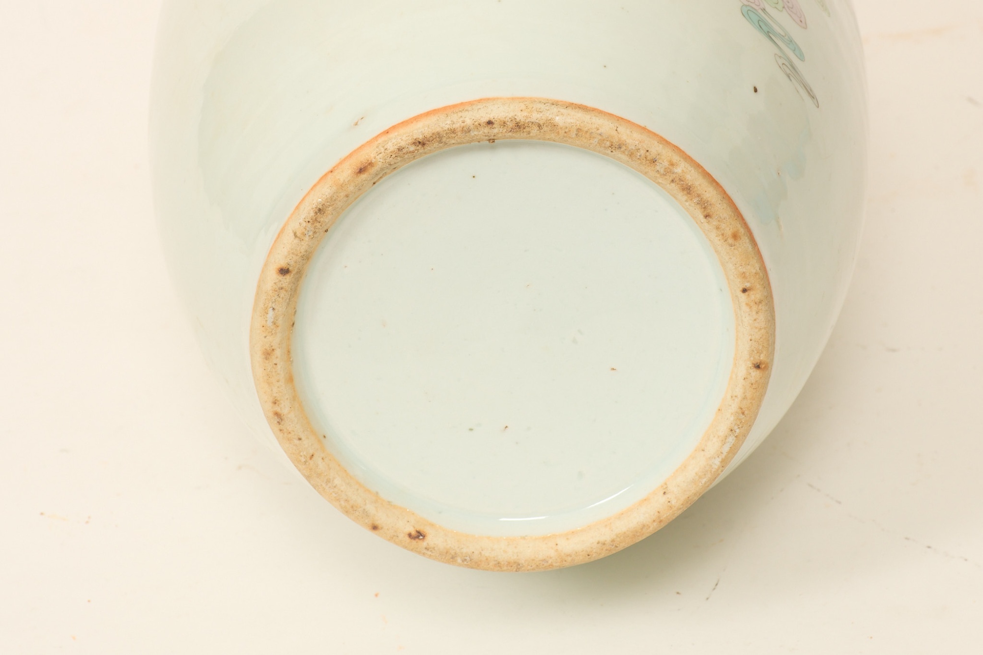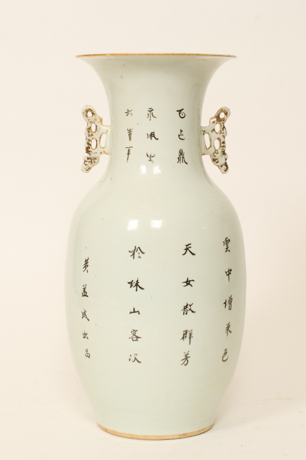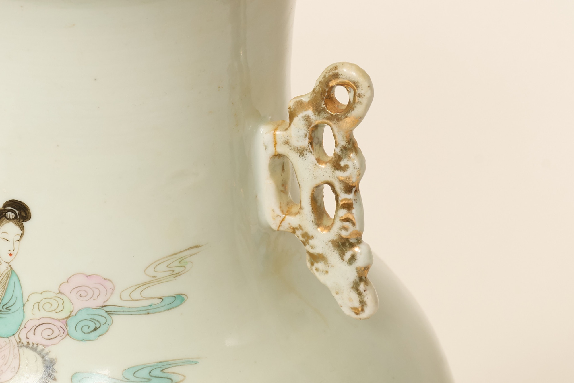 Polykrom dekor, med figurscen samt kalligrafi, höjd 43 cm. Lagning, nagg samt glasyrmistor.