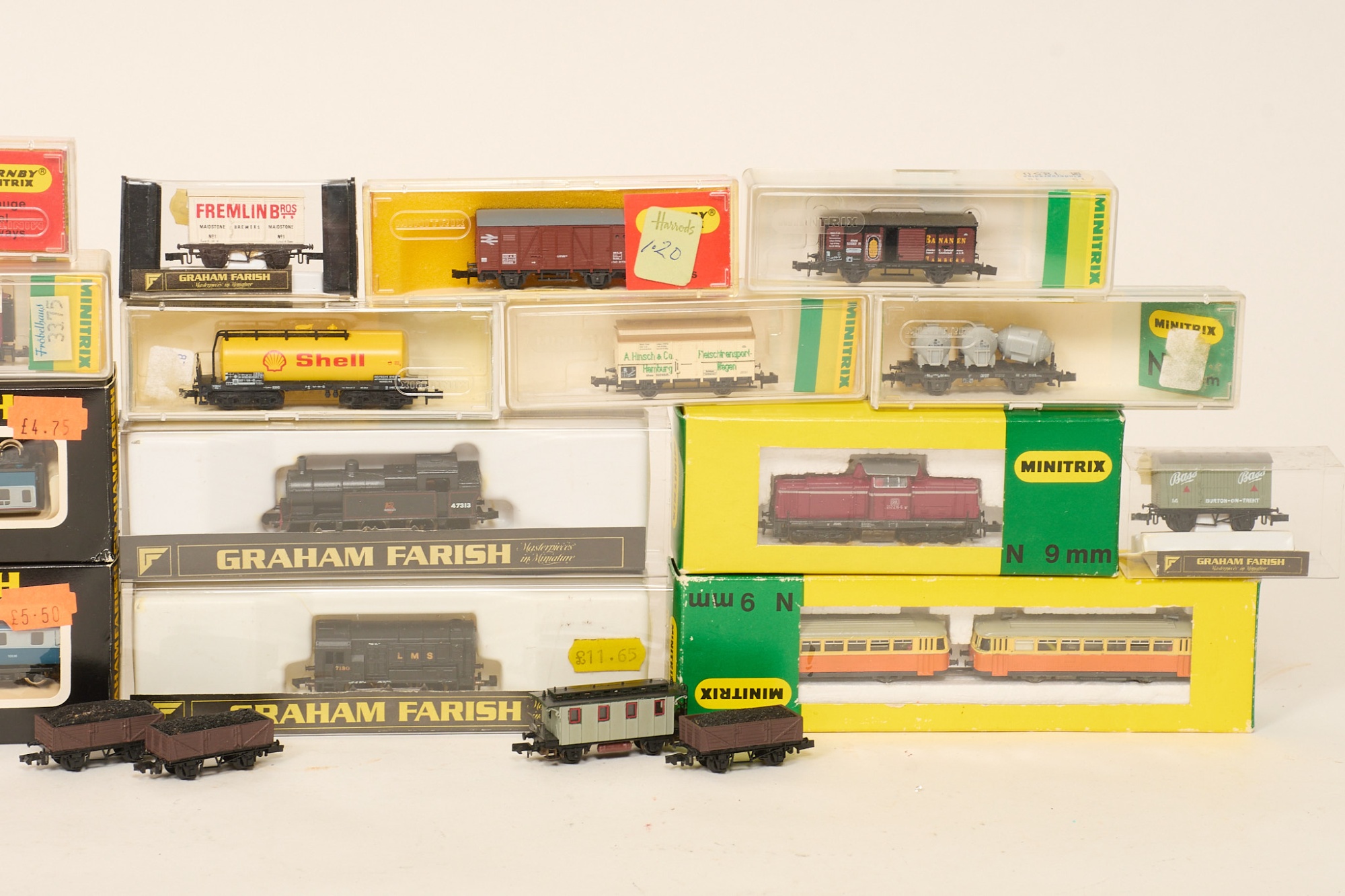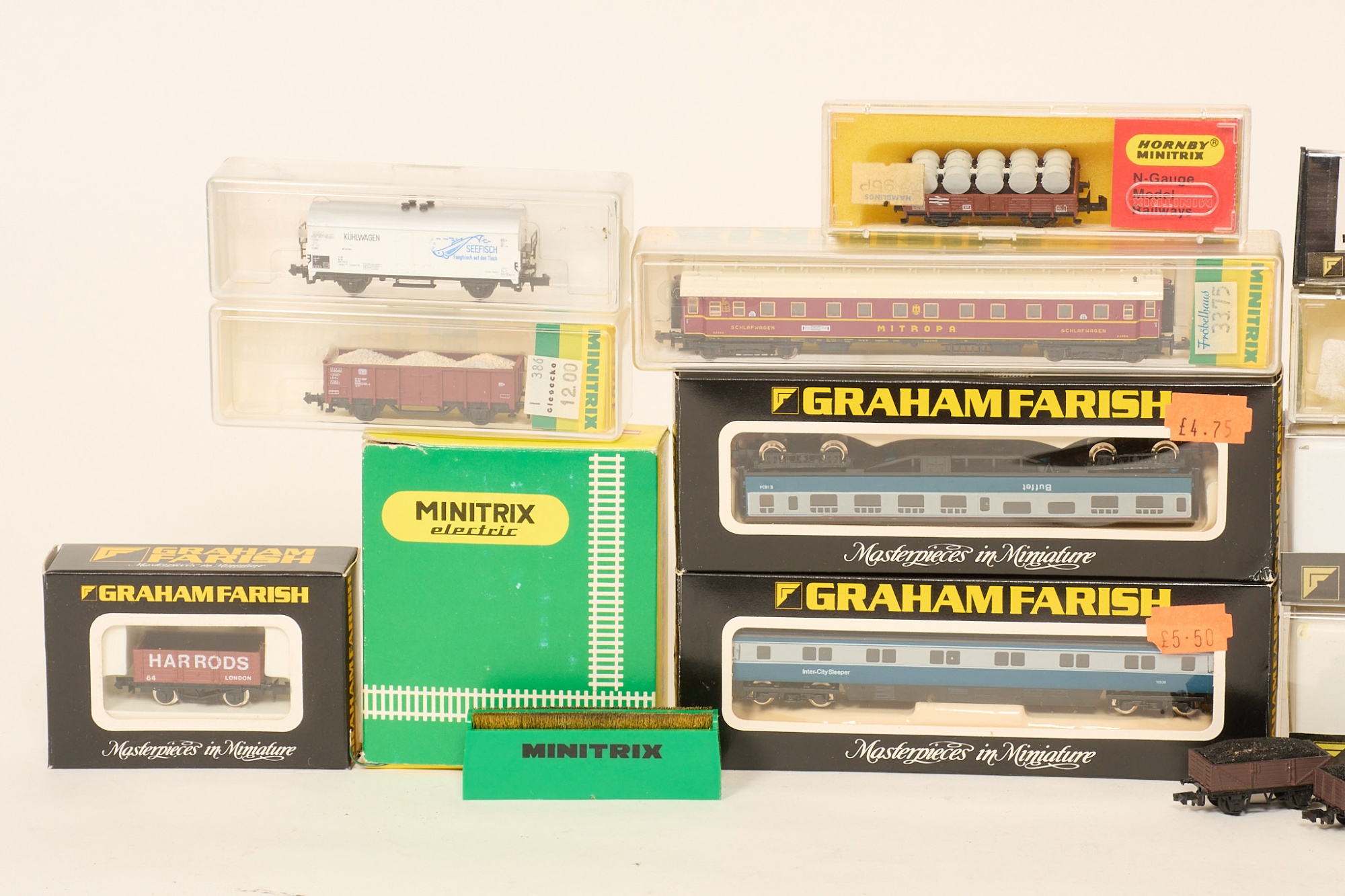 Minitrix, N-skala, ett lok, två vagnar. Graham Farish, två lok, samt 9 vagnar.