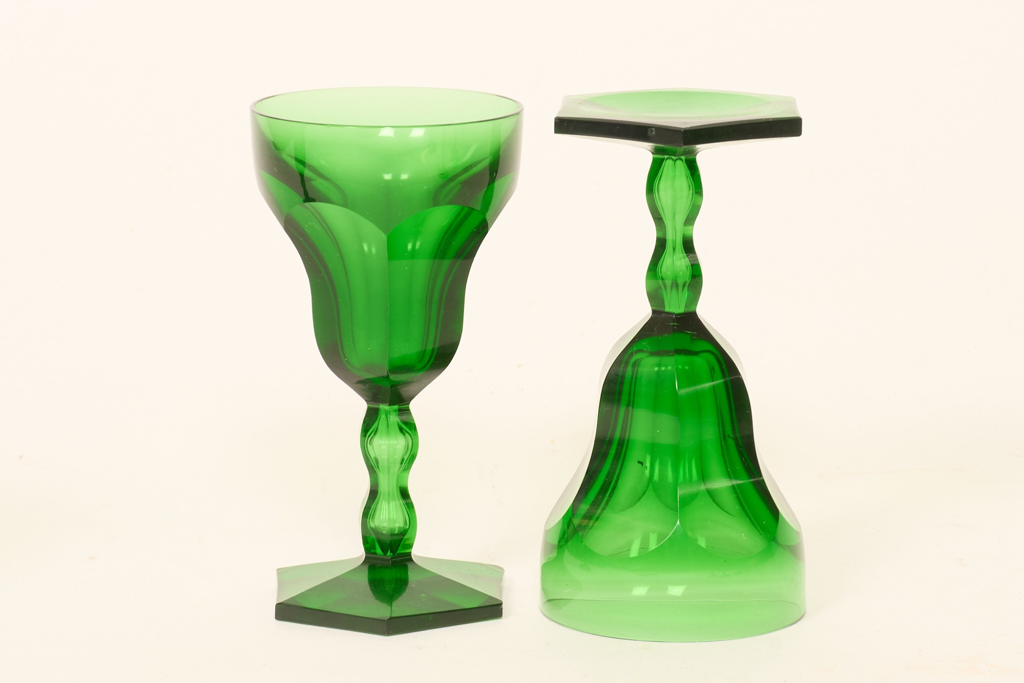 8 st, grönt glas, höjd 13 cm, bruksslitage.