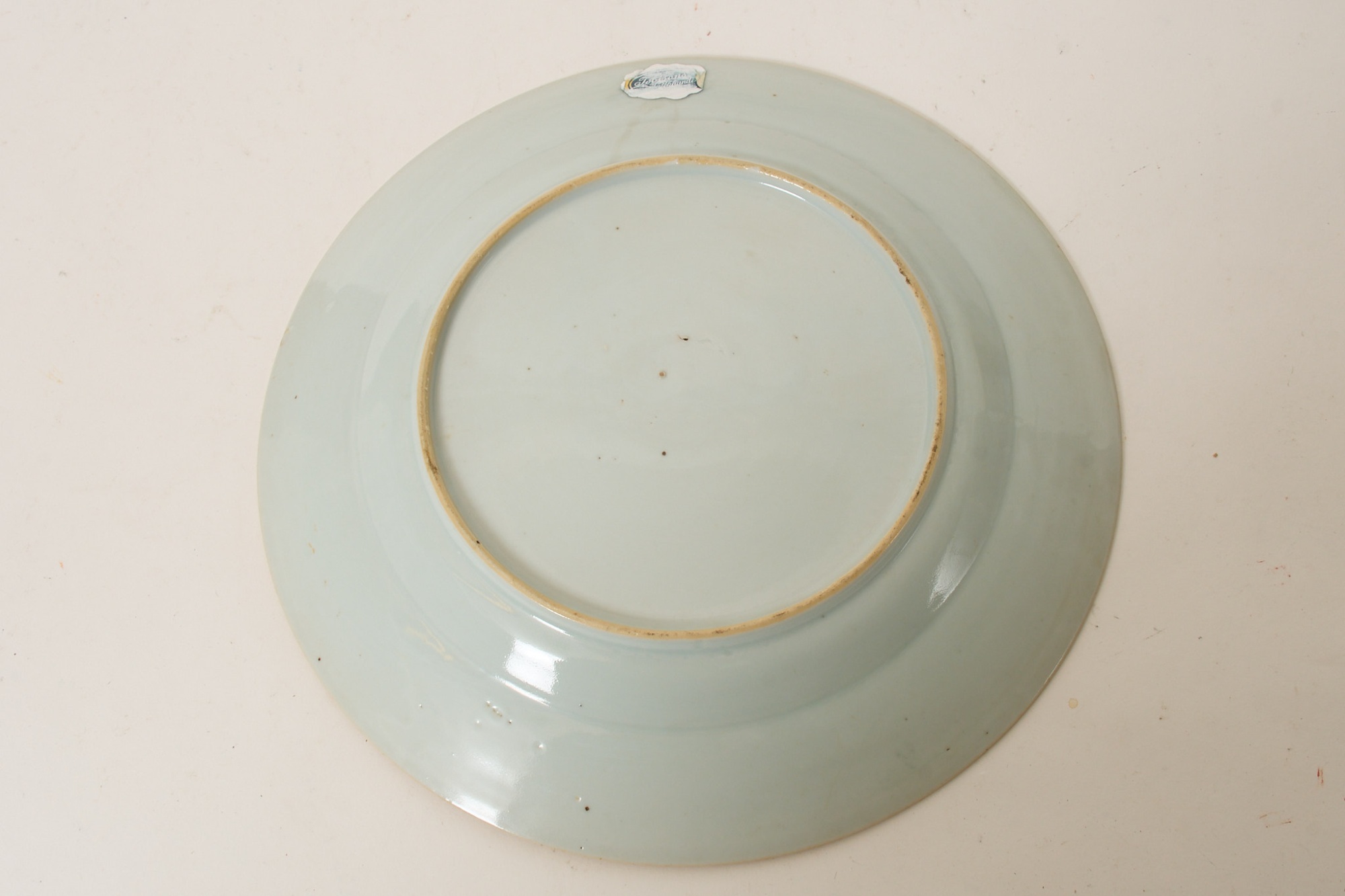 Dekor i underglasyrblått med figurscen, diam. 28 cm, kantlagningar, glasyrkrackeleringar