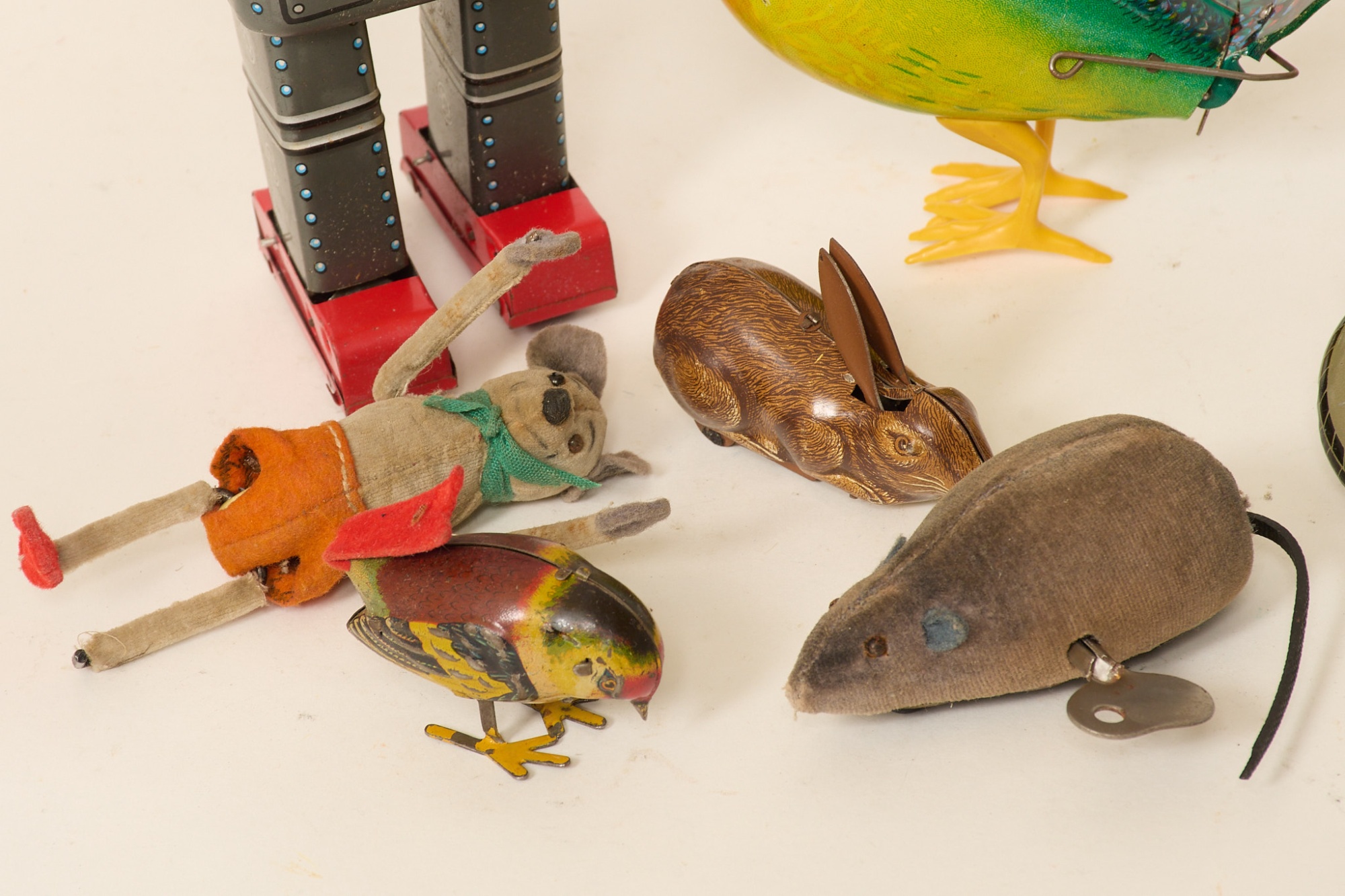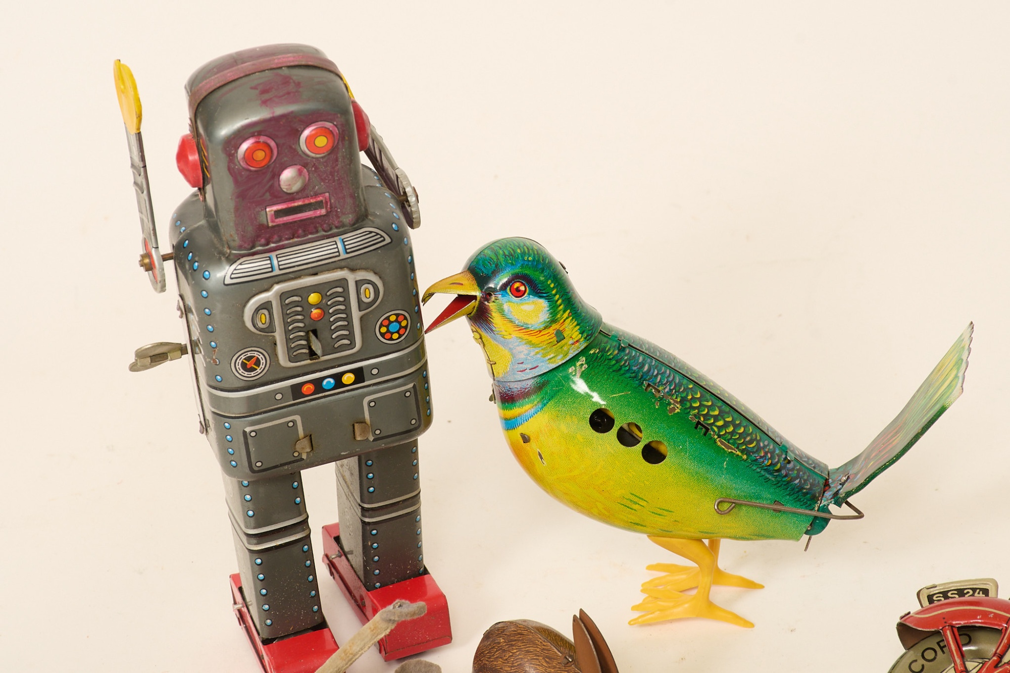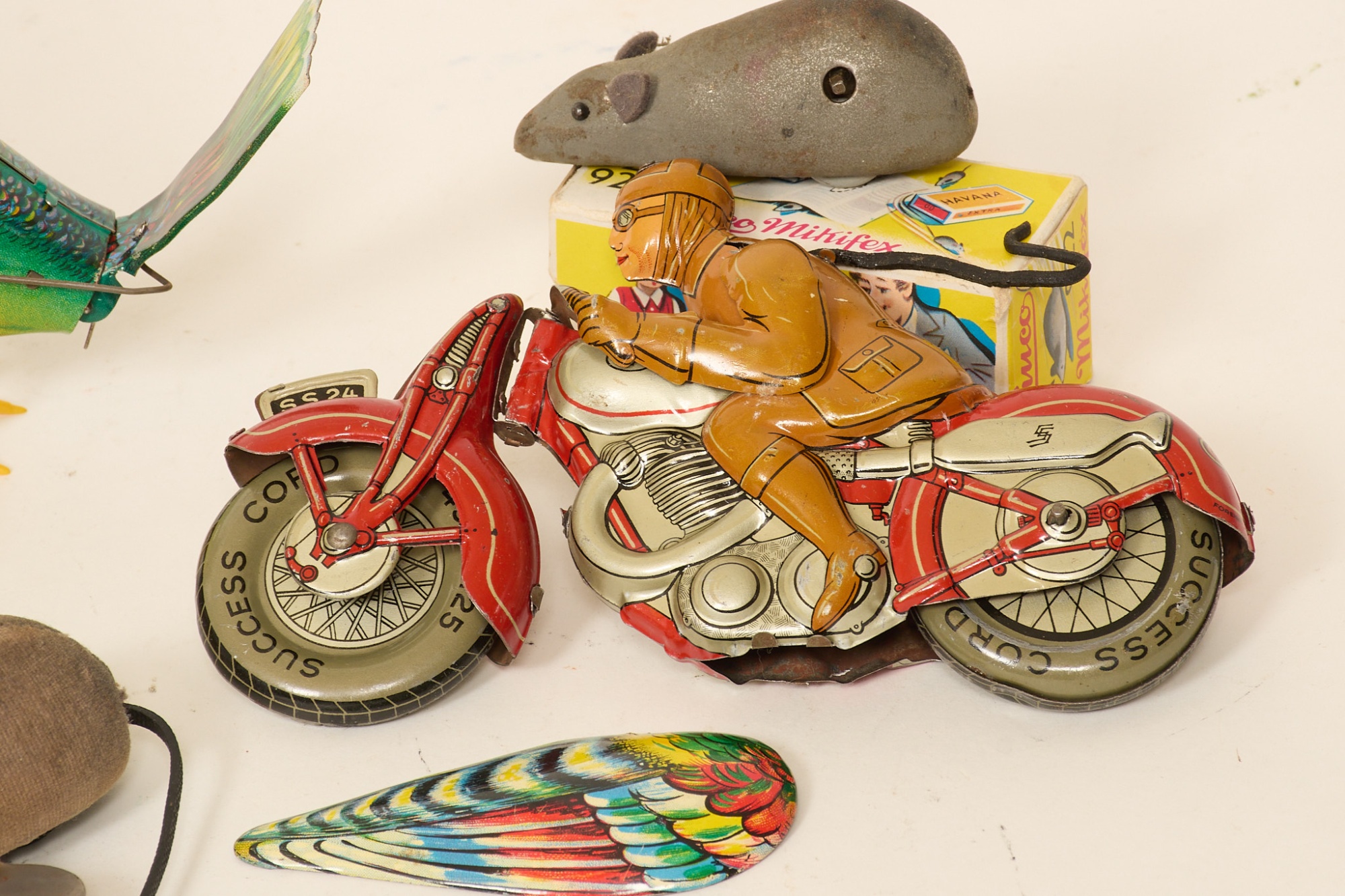 Mekaniska, bl.a. robot "Space Man", björn som slår kullerbyttor, Schuco, båda fungerar, MC, 2 råttor. Slitage.