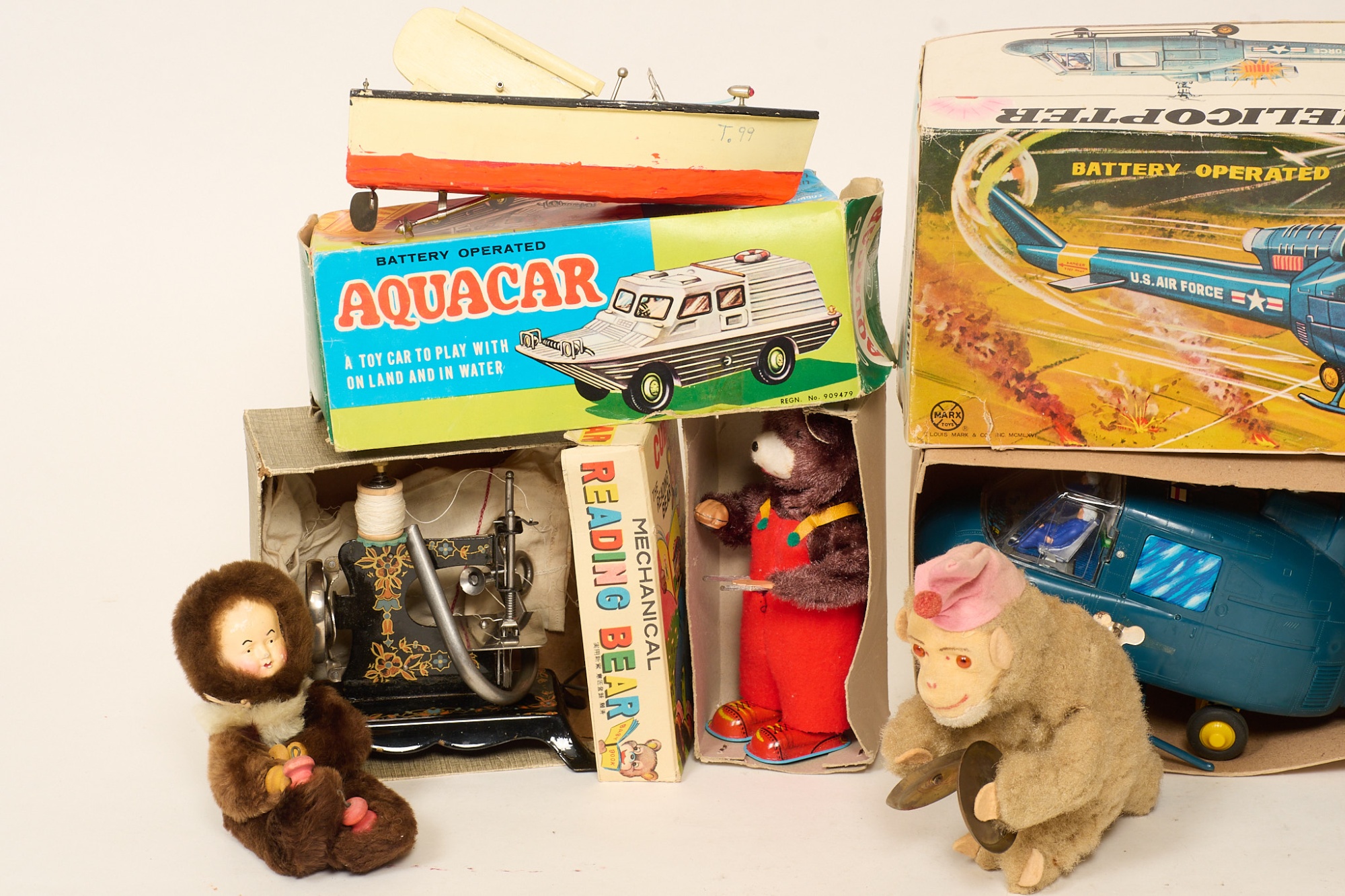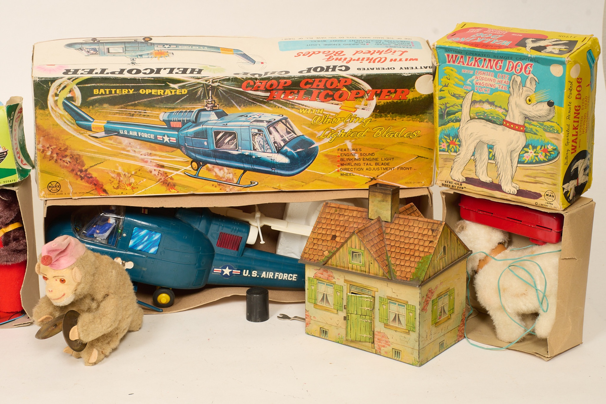Mekaniska djur, helikopter, symaskin, plåthus m.m. Slitage, skador.