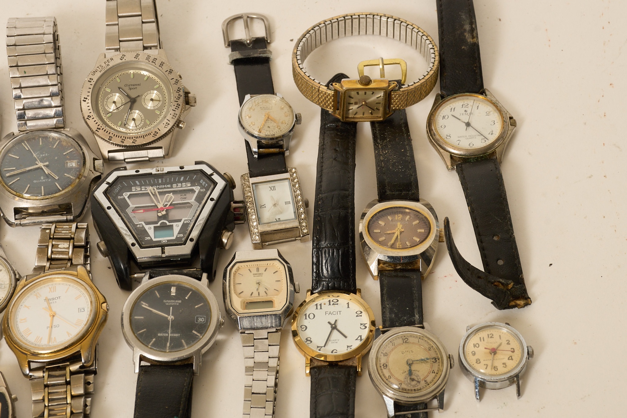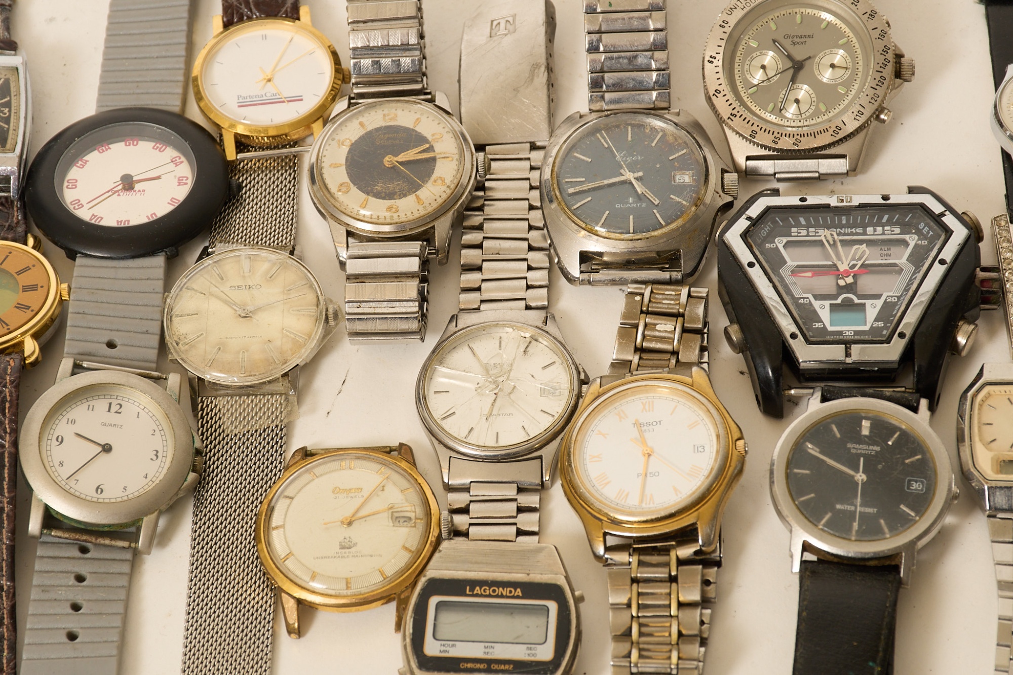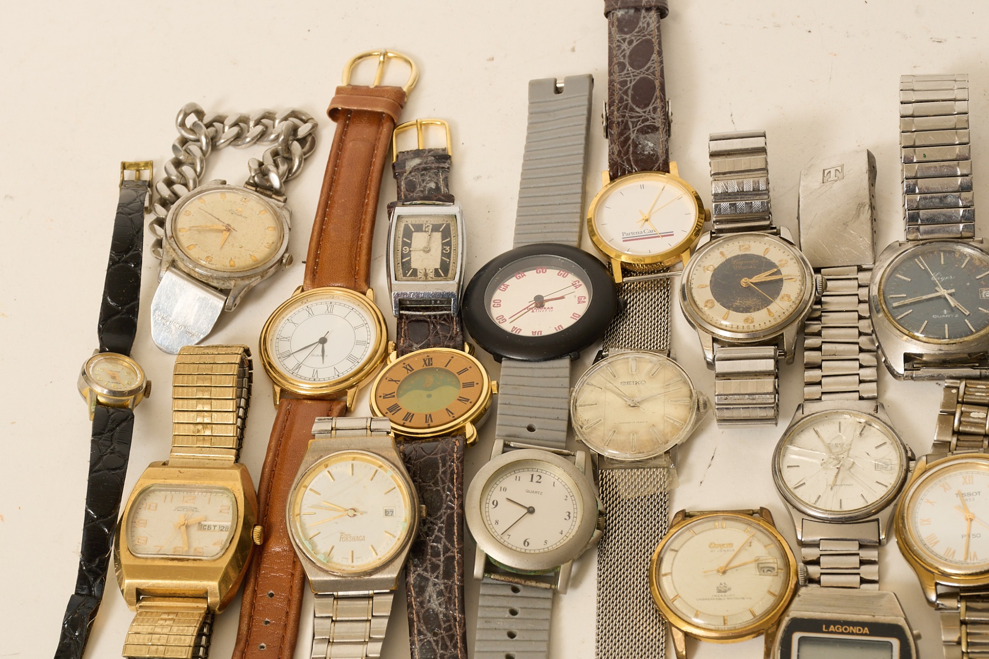 Bl.a. Helvetia Prestige automatic, Eiger, Lagonda, Geneve, Onyxa, Tissot, Alpina, Seiko m.m. Slitage, skador.