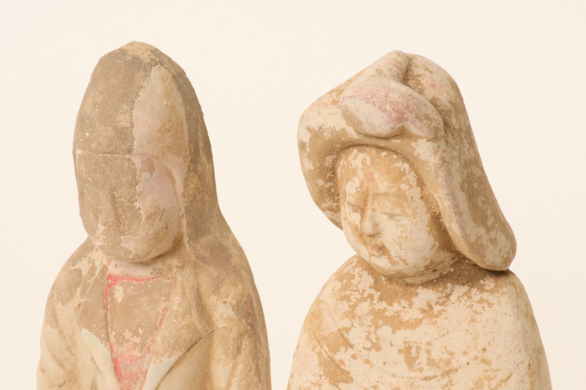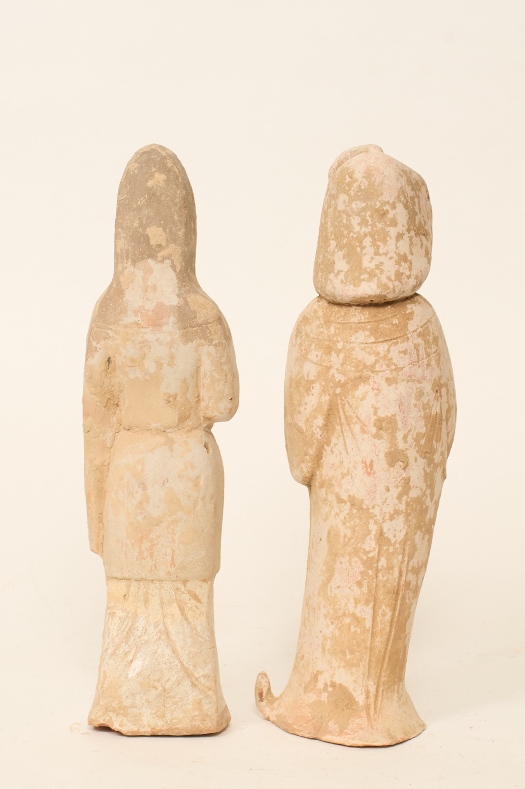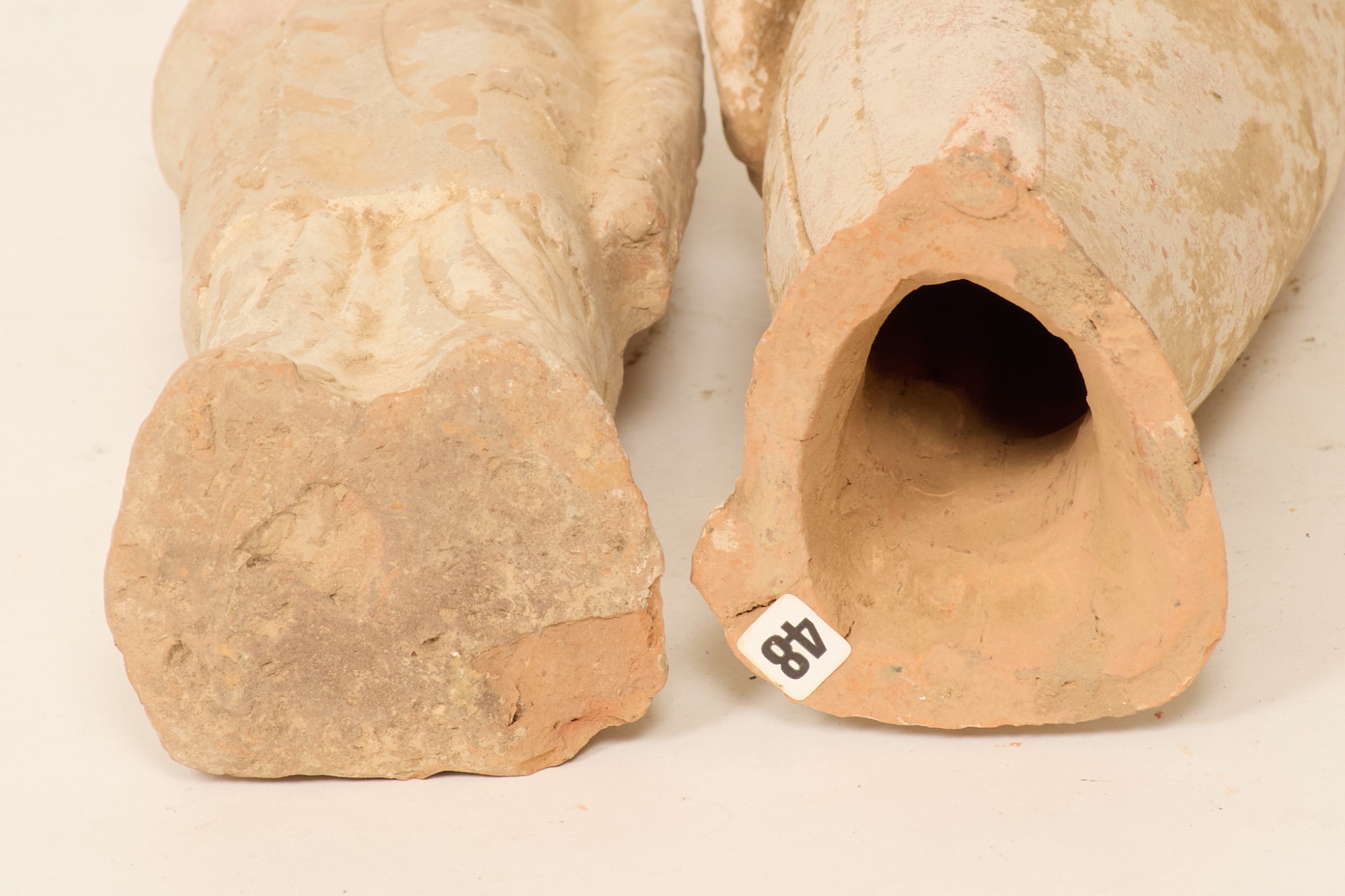 2 st, lergods, höjd 33 cm, smärre ytslitage, mindre dekorelement saknas.