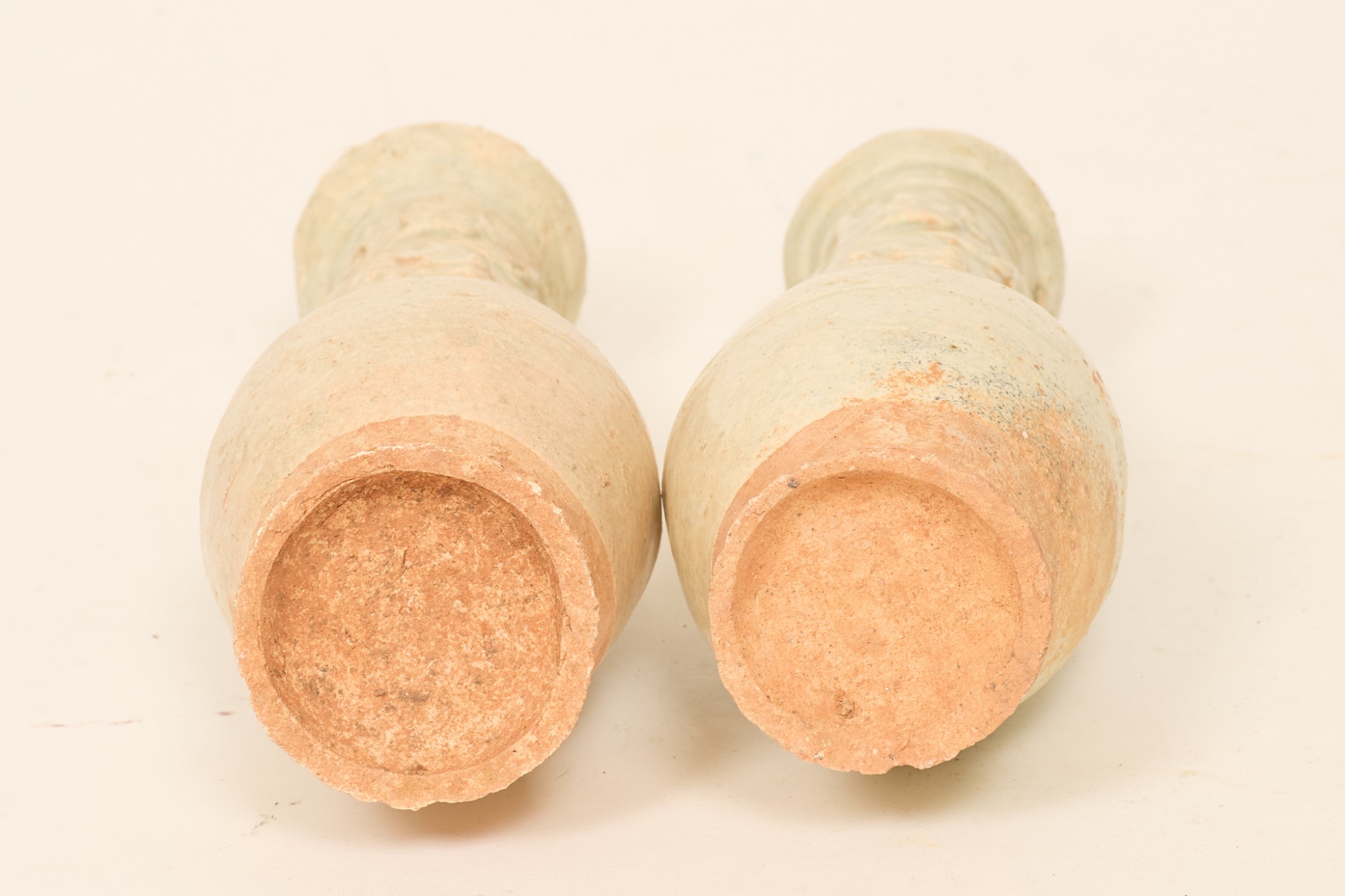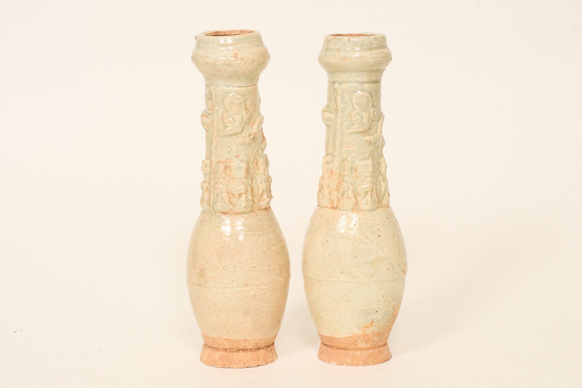 Ett par, glaserat lergods, höjd ca 33 cm, skador, dekorelement saknas.