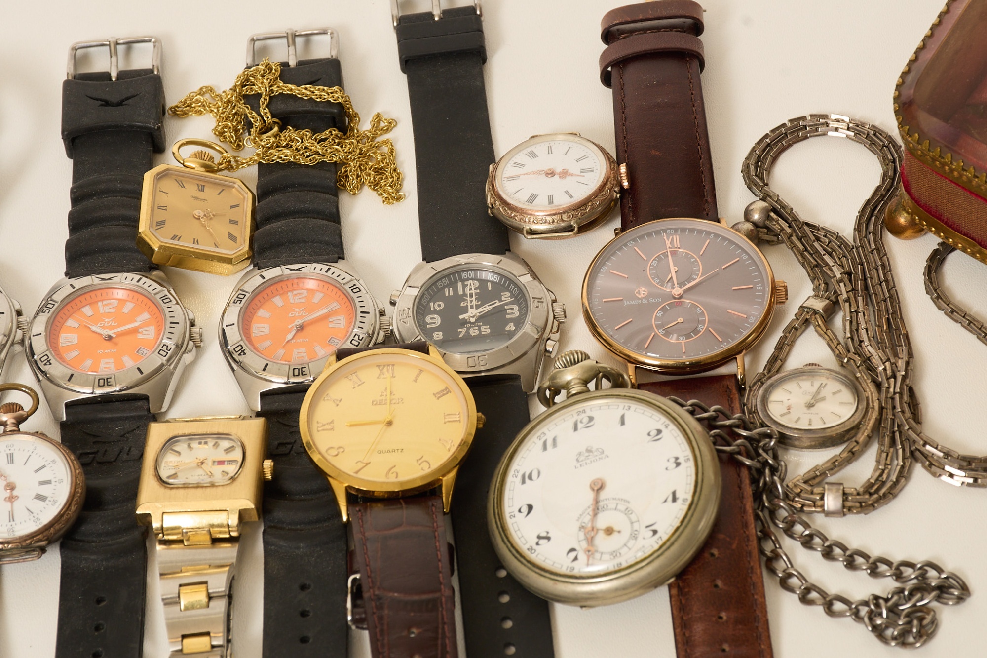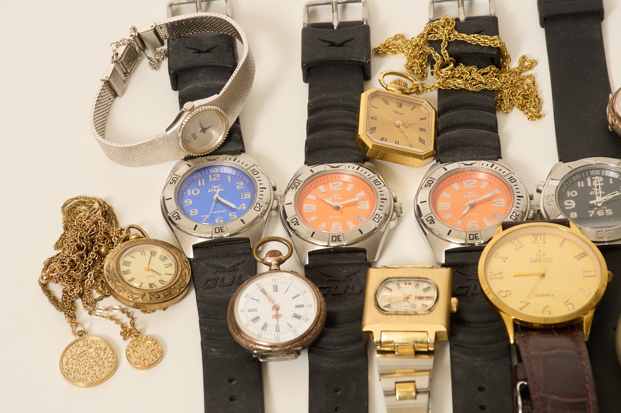Div. dam- samt herrarmbandsur, bl.a. Seiko, Gul, Leijona, Uhlman m.m. Samt klockgömma.