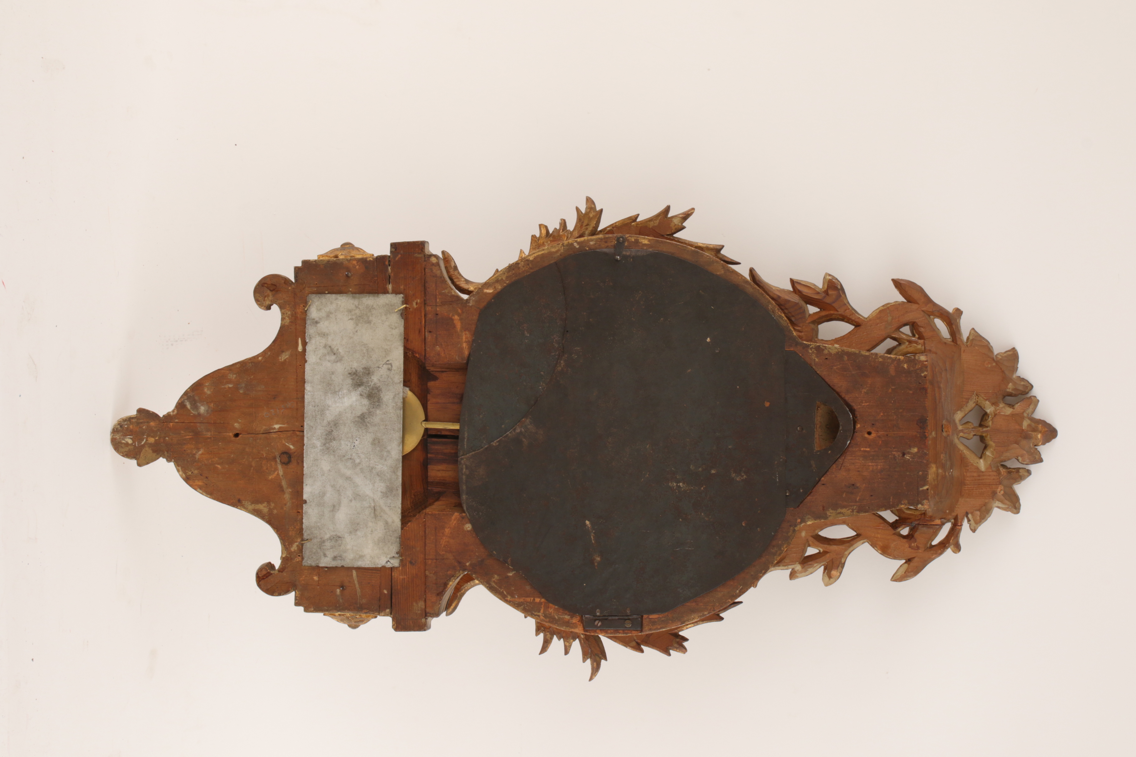 Bronserad och förgylld. Bemålad urtavla. Pendel finns.