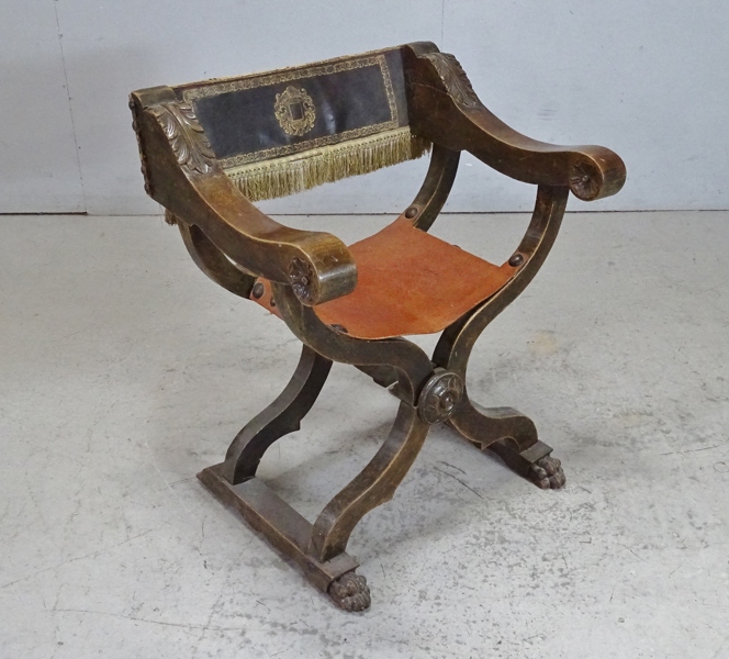 betsat trä, sits samt rygg av läder, skuren dekor av bl. a. lejontassar