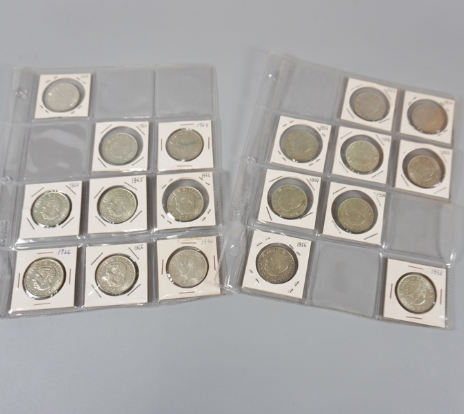 Bilder 18 st svenska silvermynt, 2 kr, 1940-1966