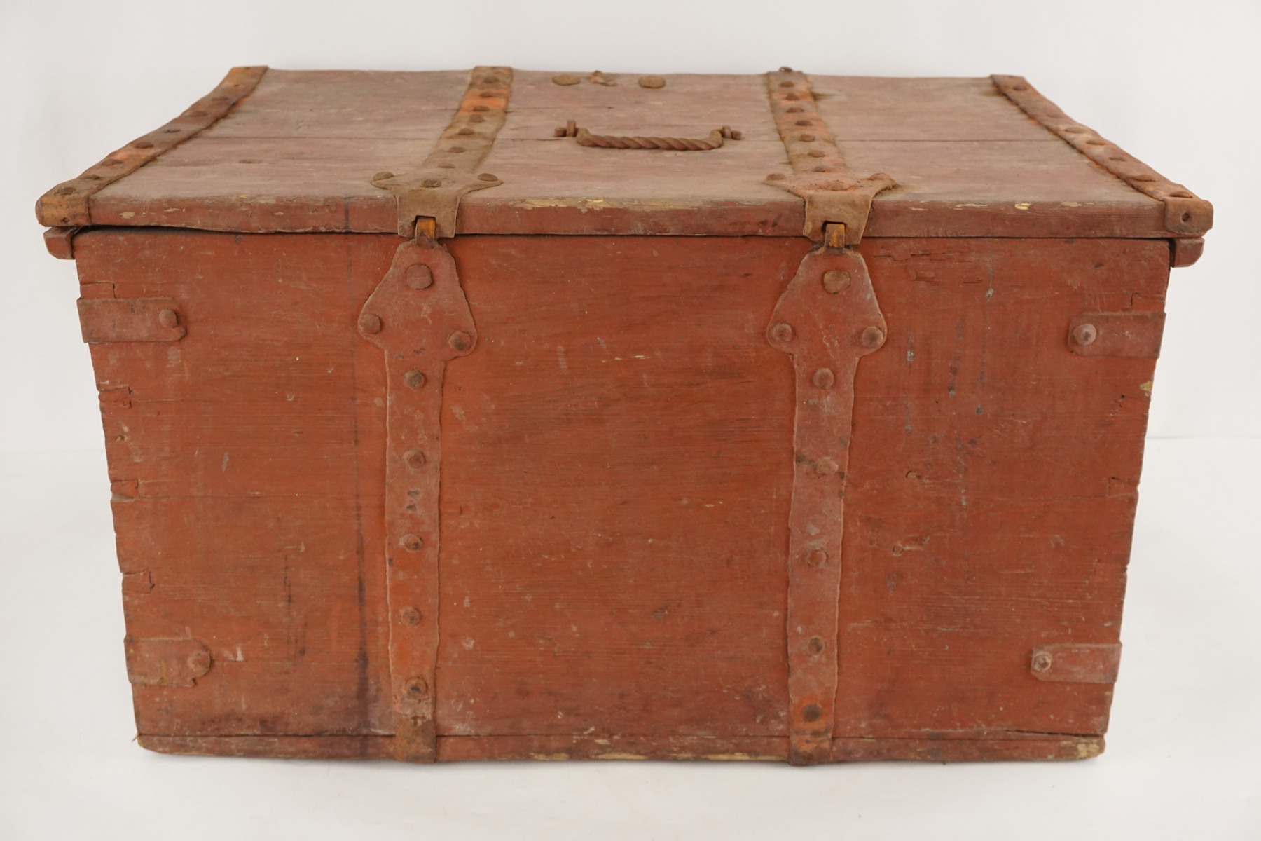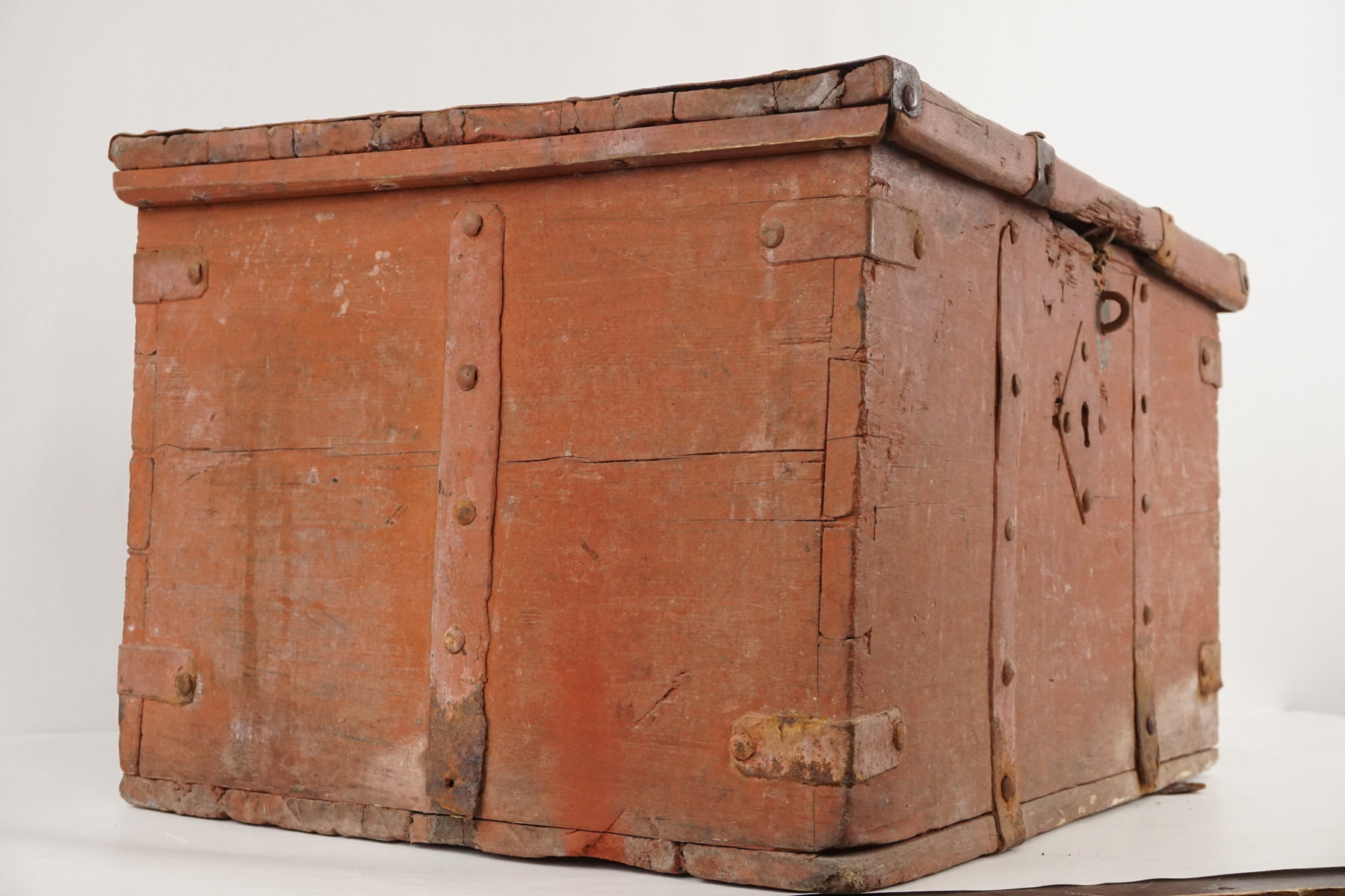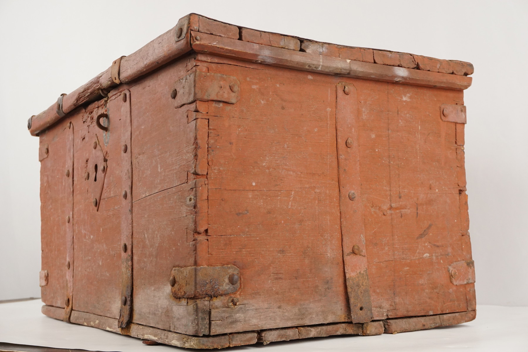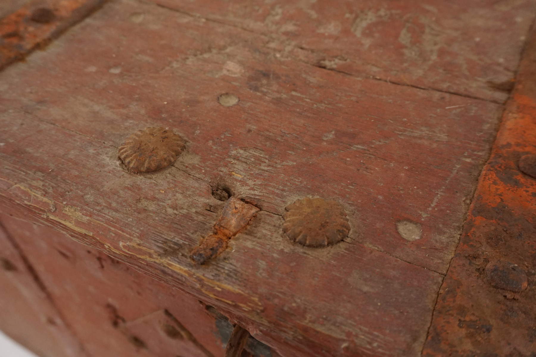 Träkista i röd färg. Om du tittar på bilderna ser du spikarna och banden som håller ihop materialet – detaljer som visar på allmogestilen och charmen hos detta föremål.