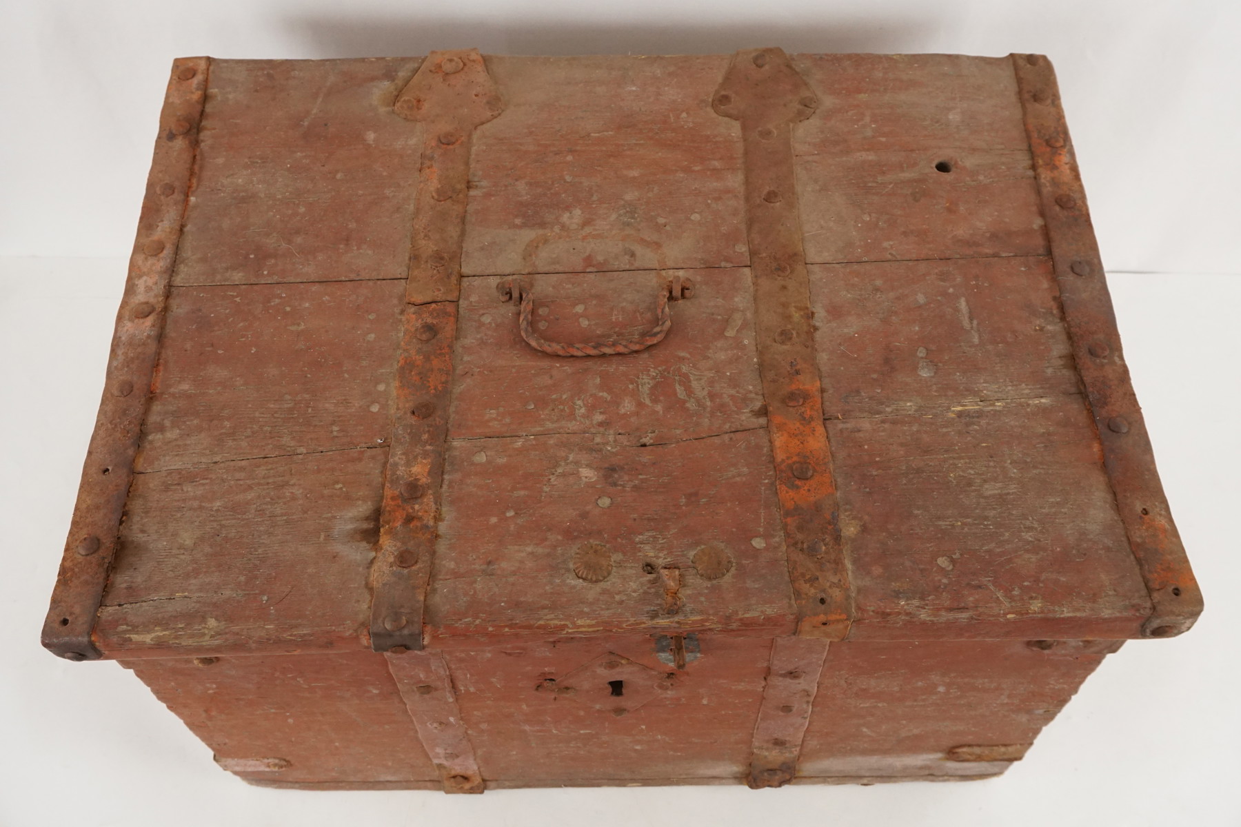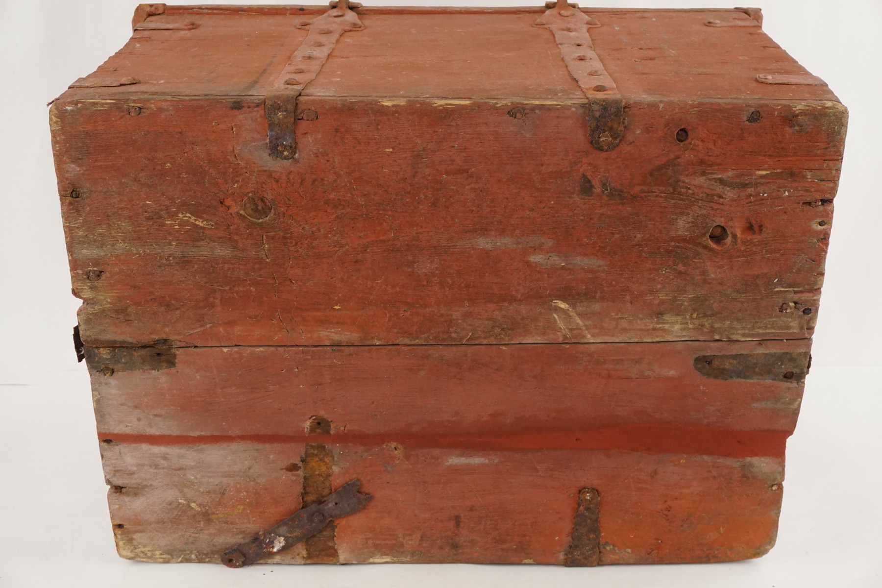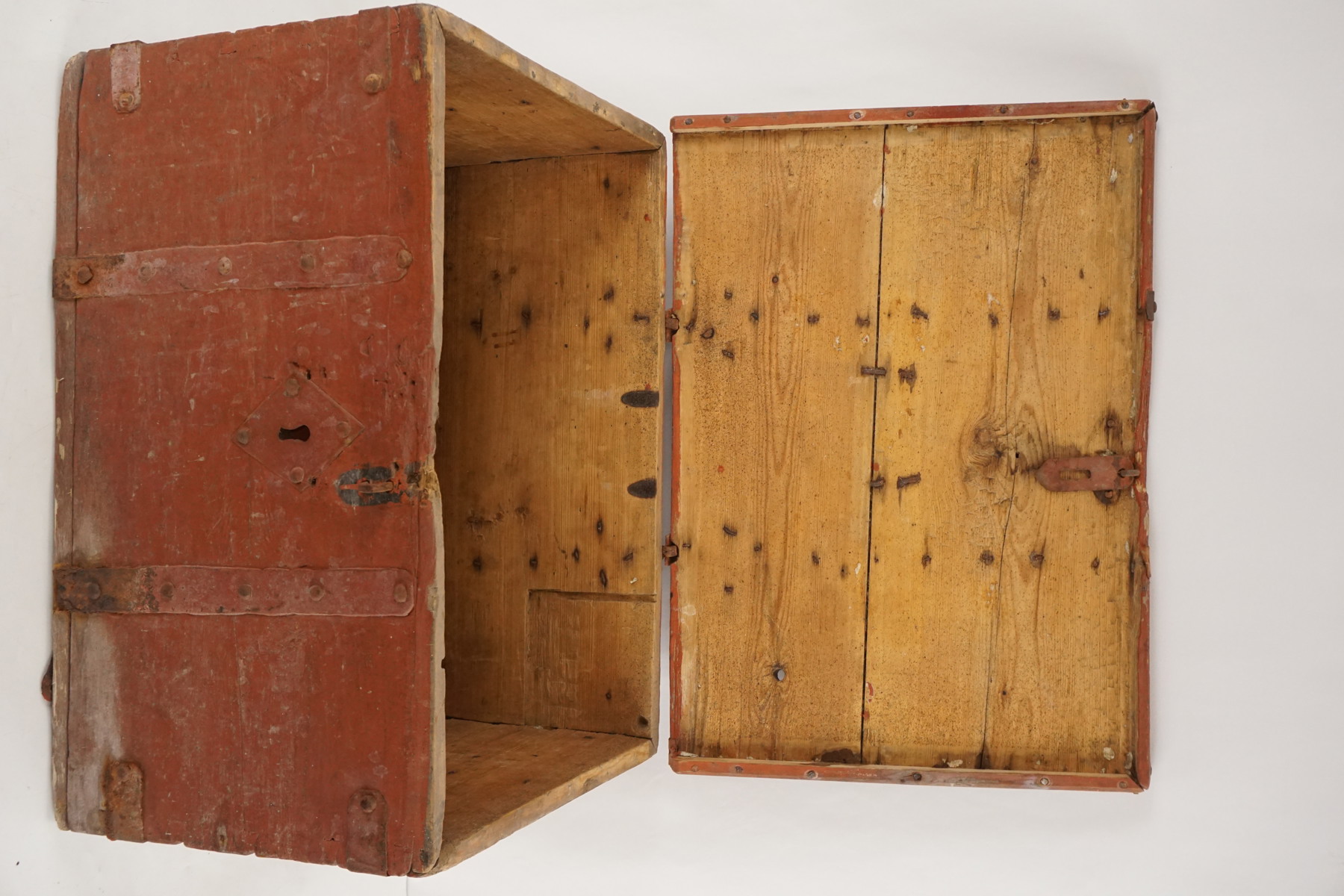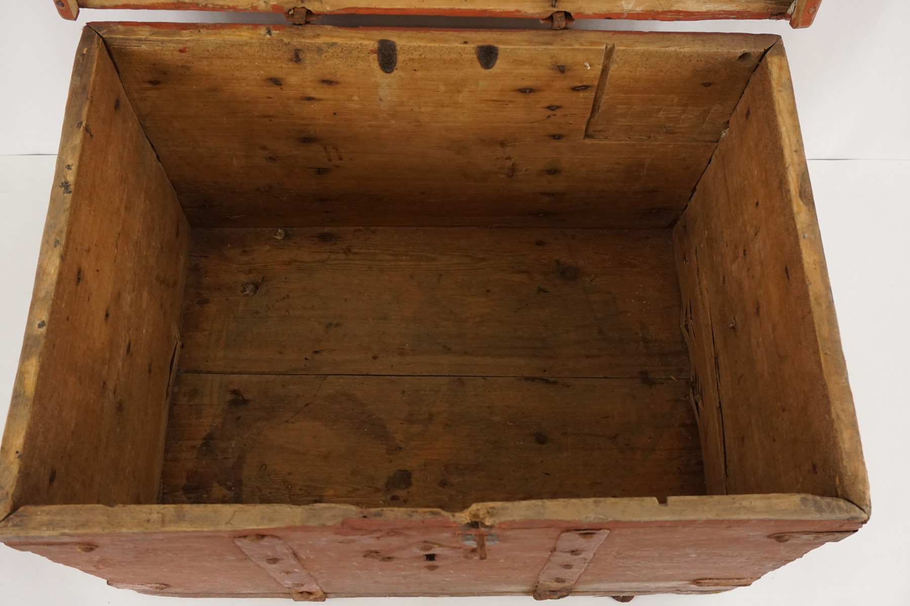 Träkista i röd färg. Om du tittar på bilderna ser du spikarna och banden som håller ihop materialet – detaljer som visar på allmogestilen och charmen hos detta föremål.