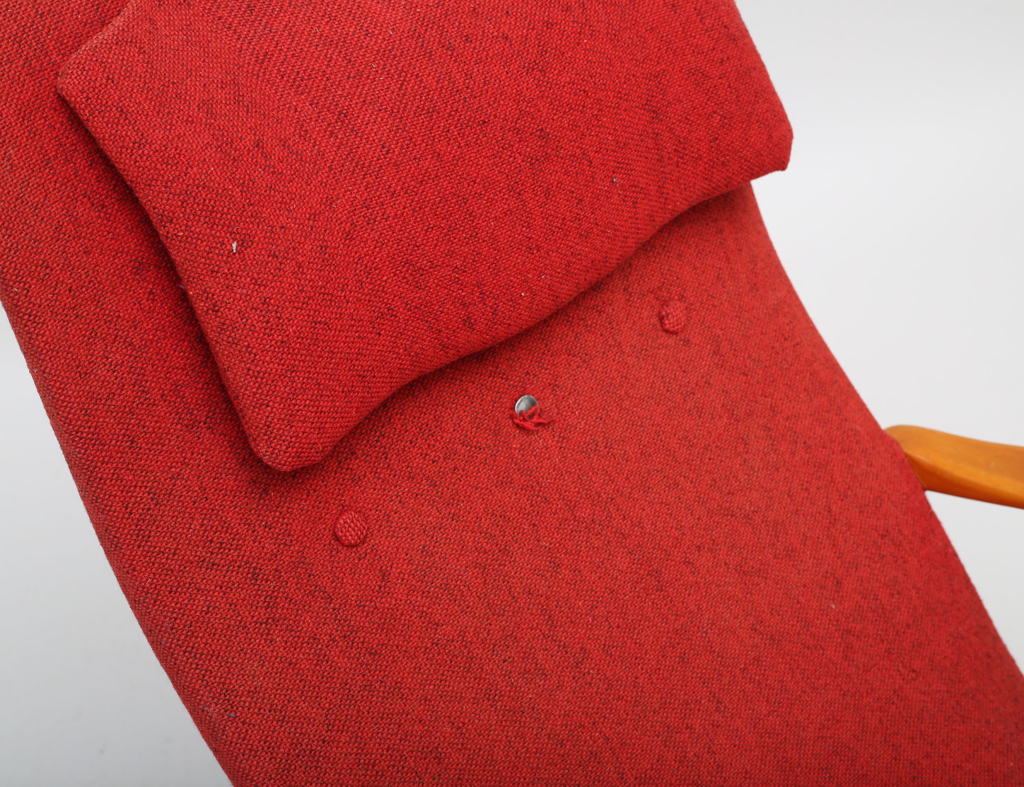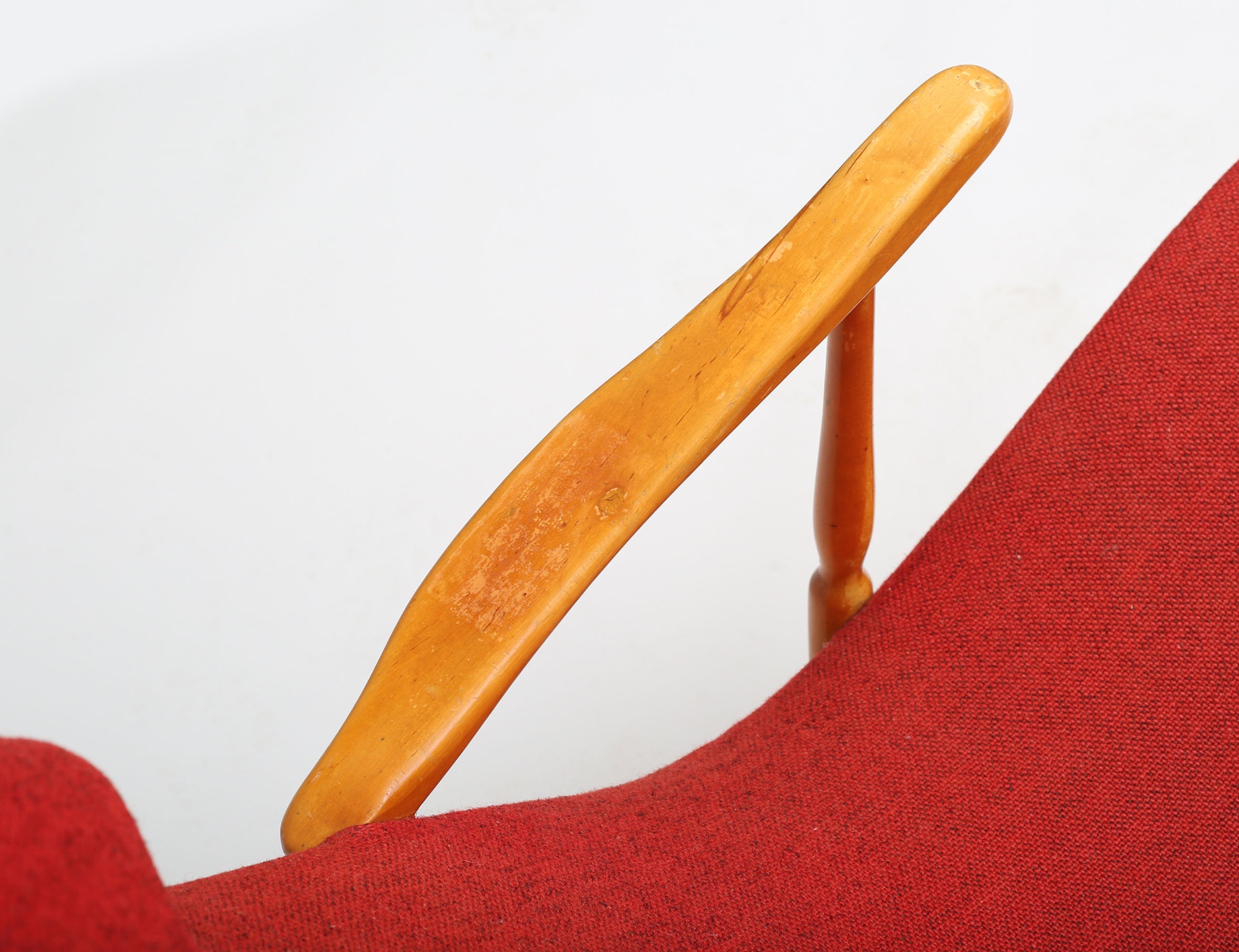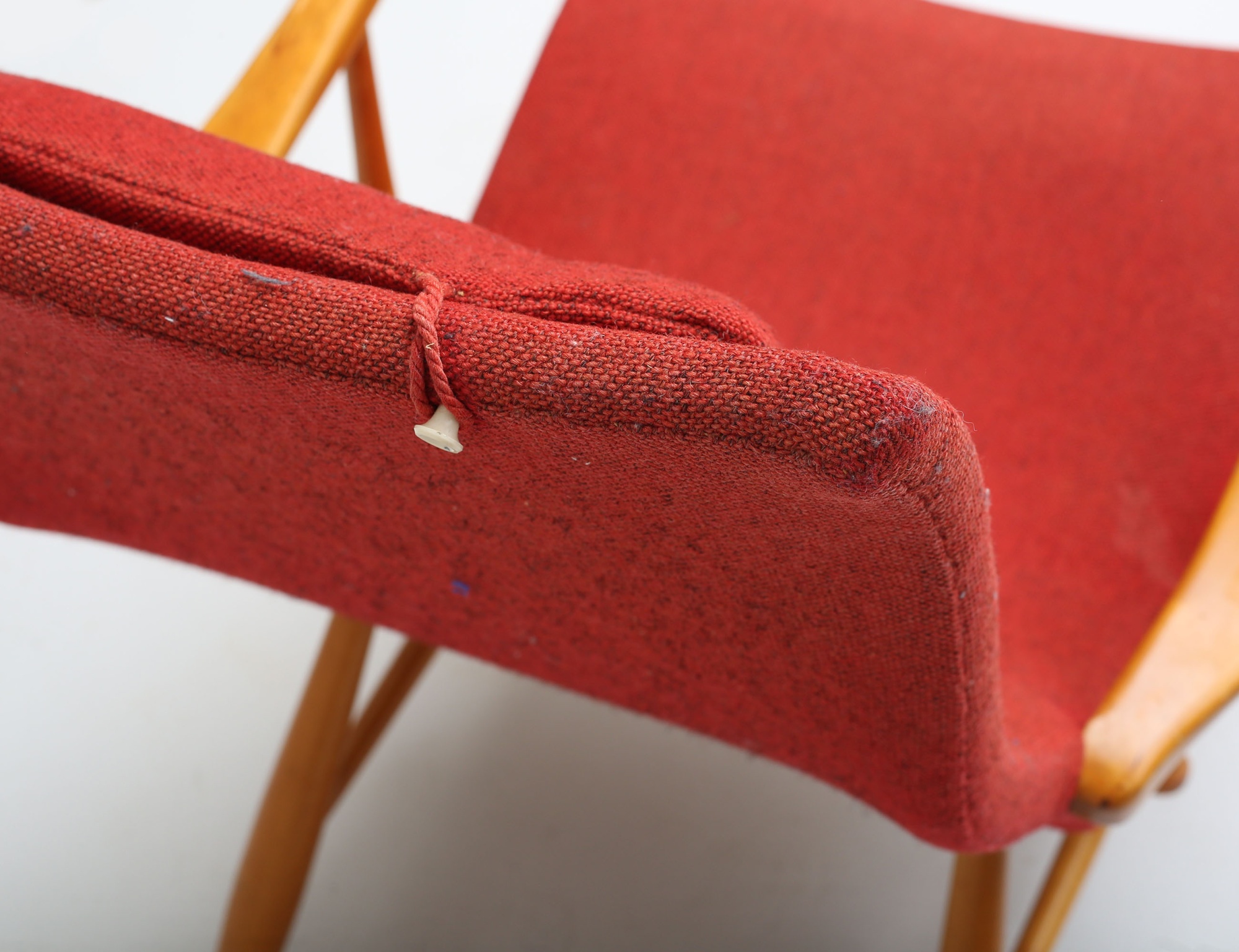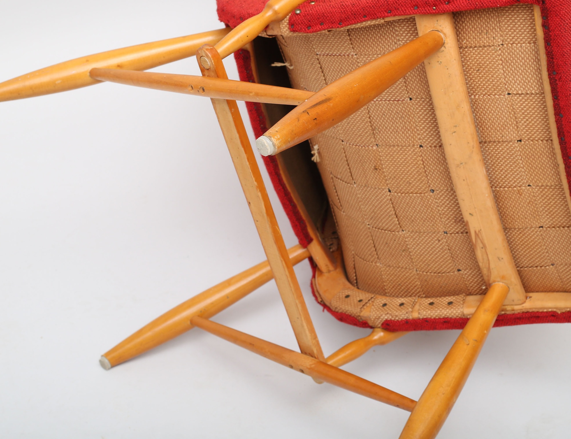 Yngve Ekström 1940/50-tal, stomme i björk, runda kopplade ben, röd klädsel i ylletyg, lös nackkudde, sadelgjord undertill, modellen formgiven 1945, sitthöjd 39, proveniens: Yngve Ekströms kvarlåtenskap (bruksslitage, fläckar, en knapp saknas)