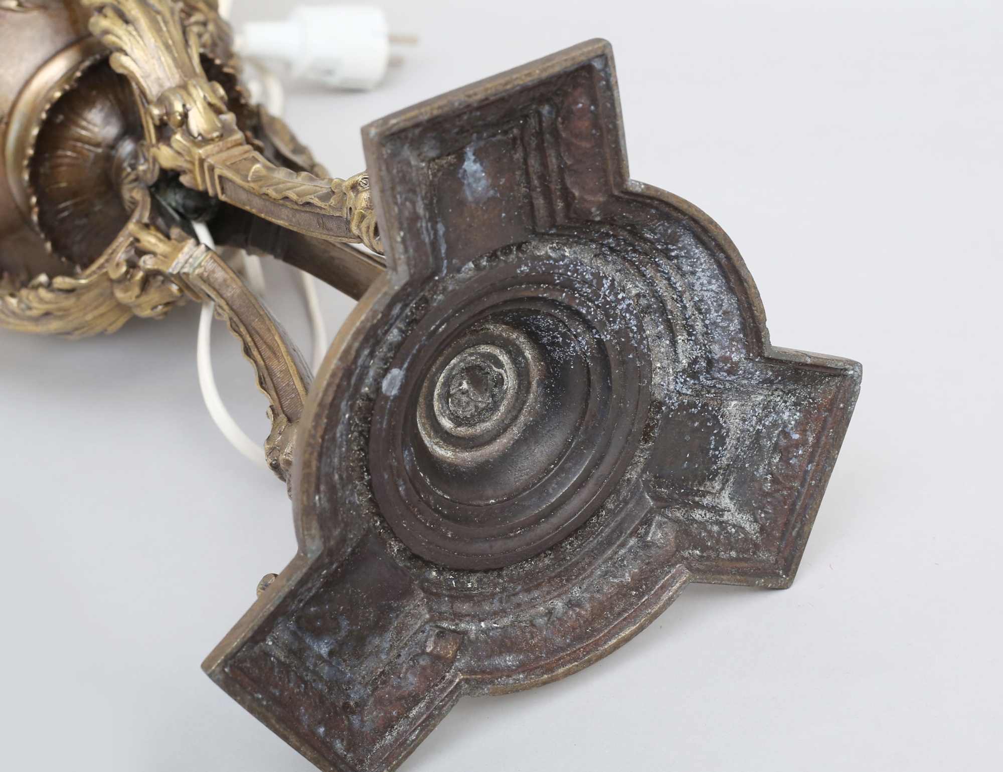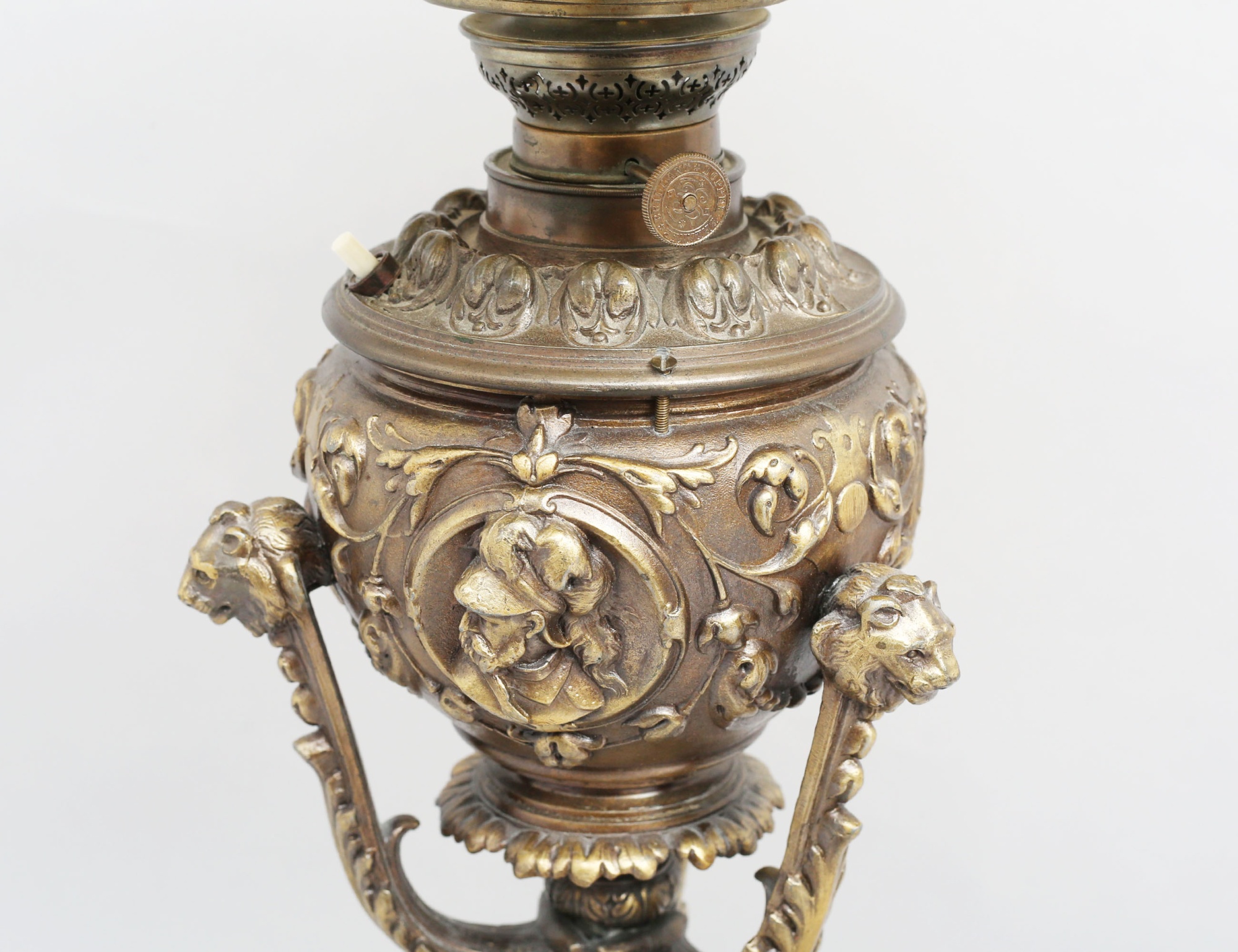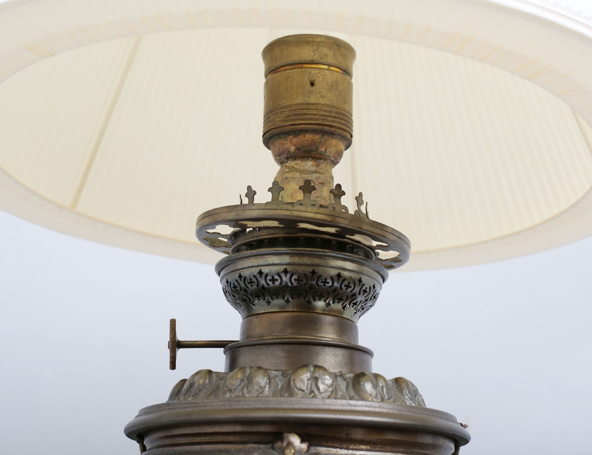 ornamenterad och patinerad brons, dekor av bla. lejonmaskaroner, tidigare fotogenlampa nu för el, plisserad textilskärm, höjd 56 (69)