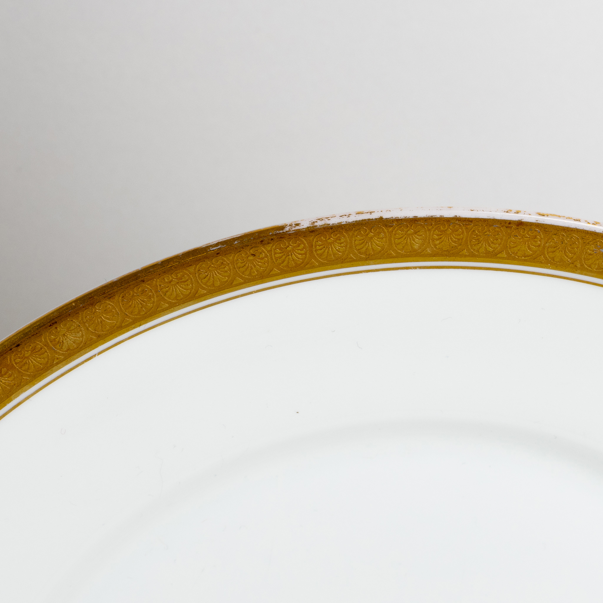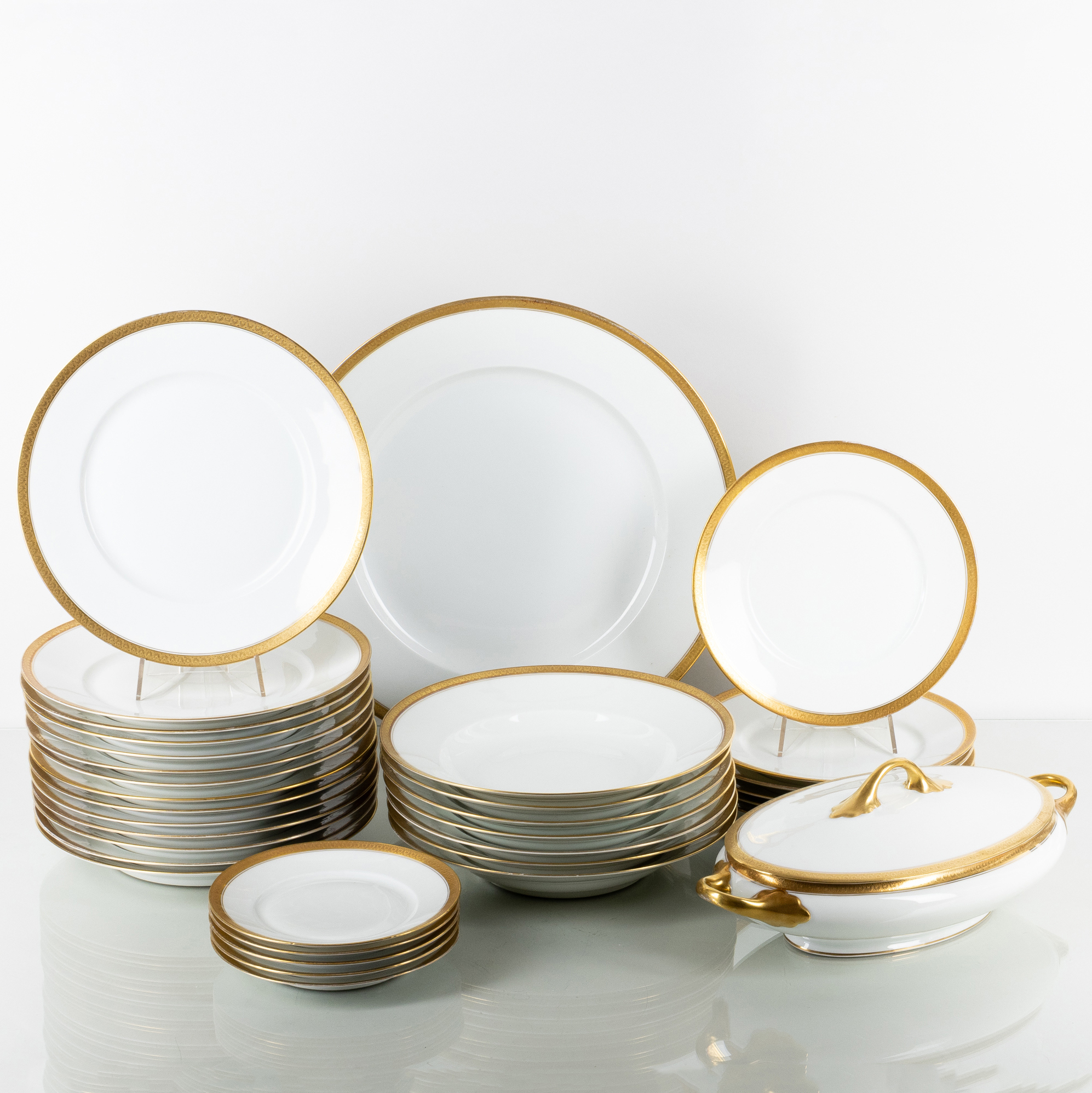 Förgylld kant, omfattande 14 mattallrikar (diameter ca 25,5 cm), 7 djupa tallrikar (25,5 cm), 6 förrättstallrikar (21,5 cm), 5 assietter (15 cm), uppläggningsfat 36 cm samt soppterrin