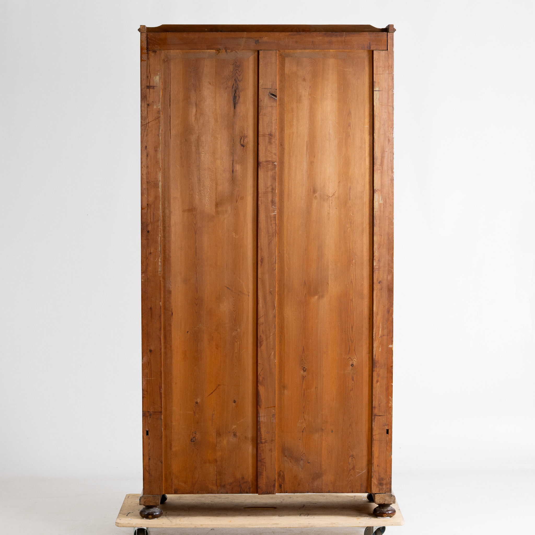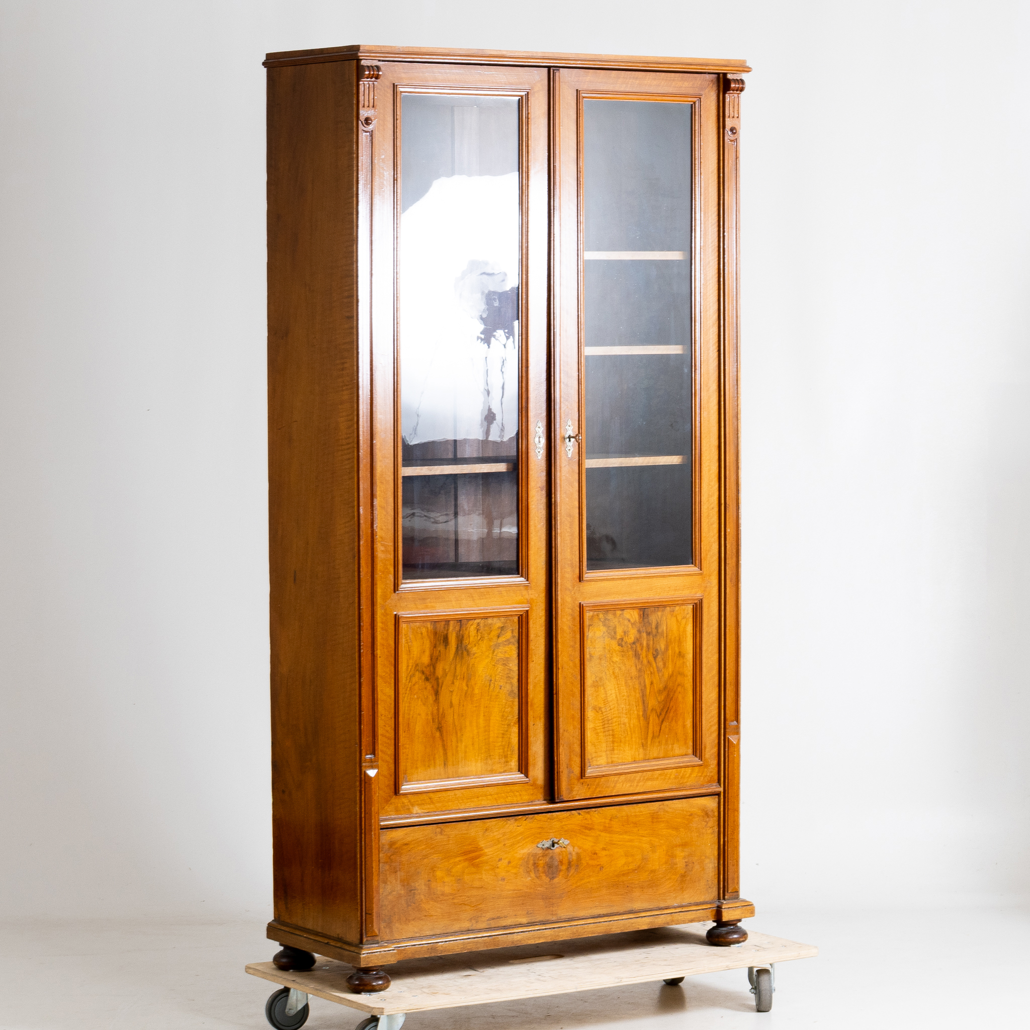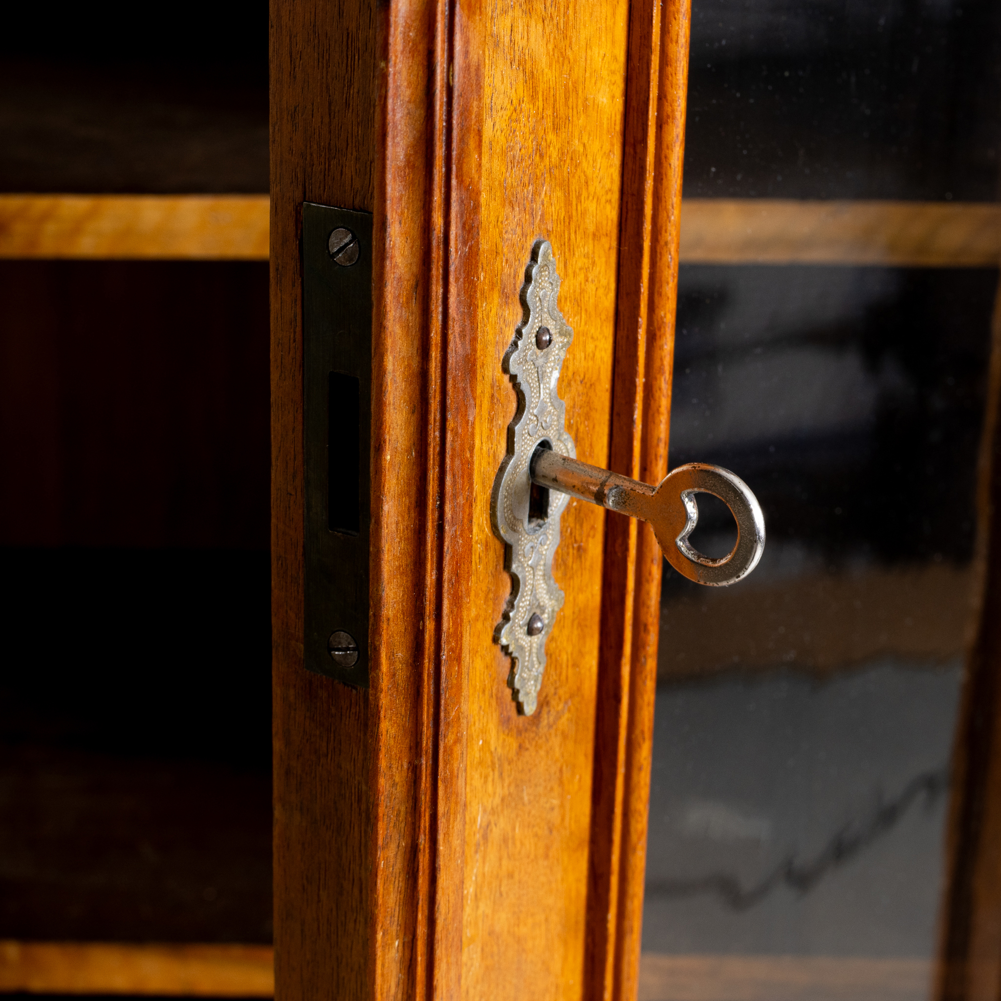 Fanerat med olika träslag, dörrar med vitrin, 1 låda i sarg, fem flyttbara hyllplan, nyckel finns, höjd 205, 105 x 42 cm