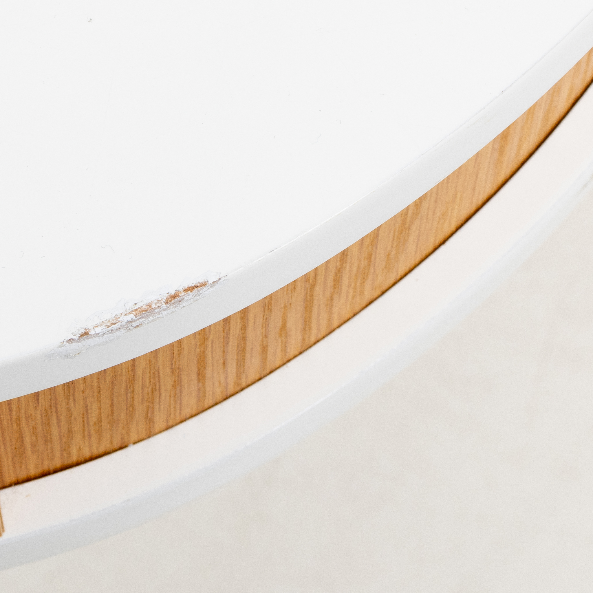 Ben av ek, sarg med ekfanér, oval skiva av vit laminat, höjd 50,140 x 70 cm