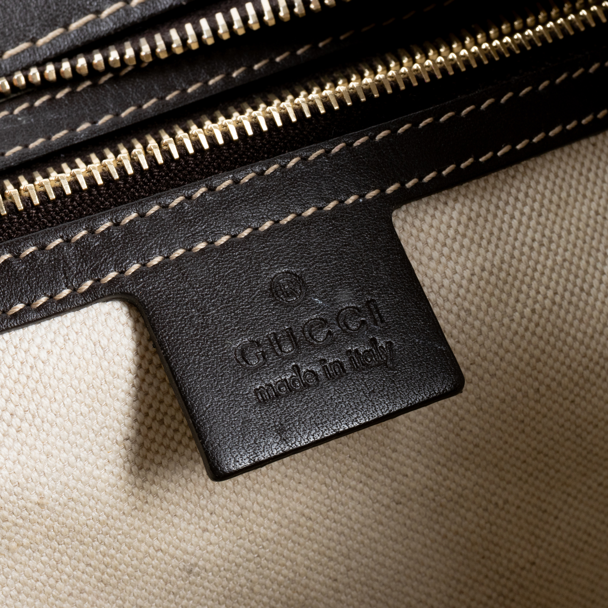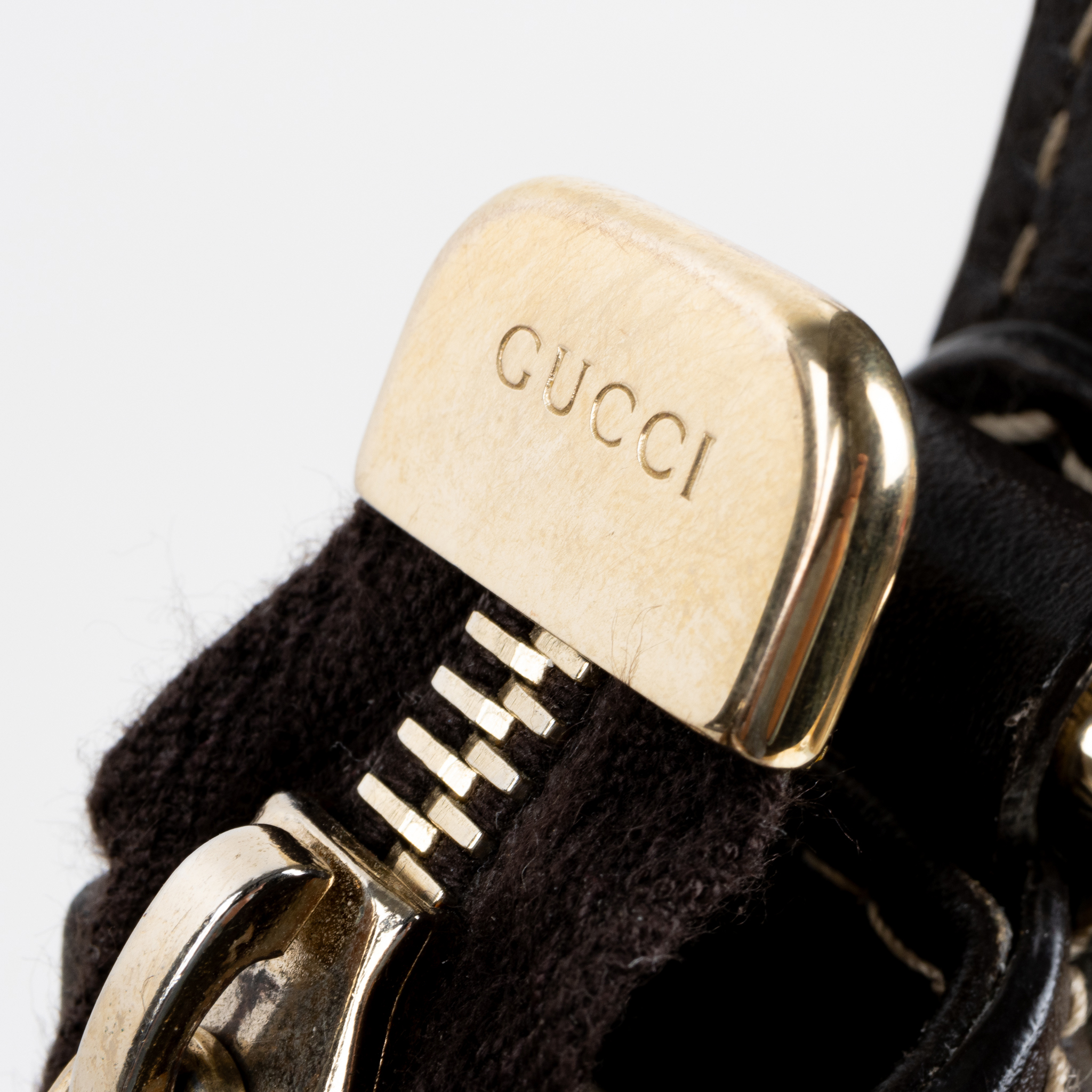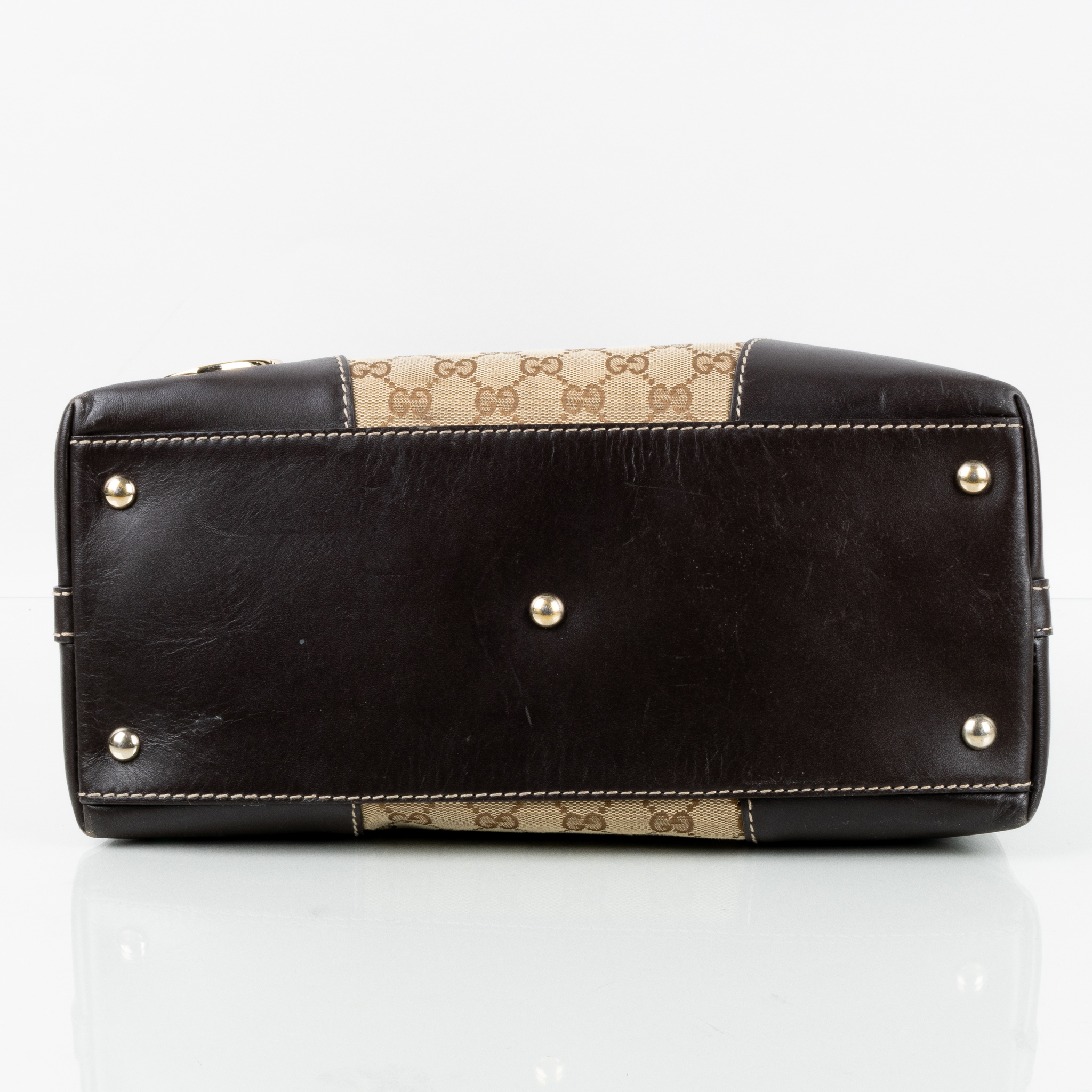 GG supreme tyg, brunt läder, guldfärgade beslag, märkt 257070-002404, ca exkl handtag 32 x 32 x 13 cm, höjd inkl handtag ca 44 cm