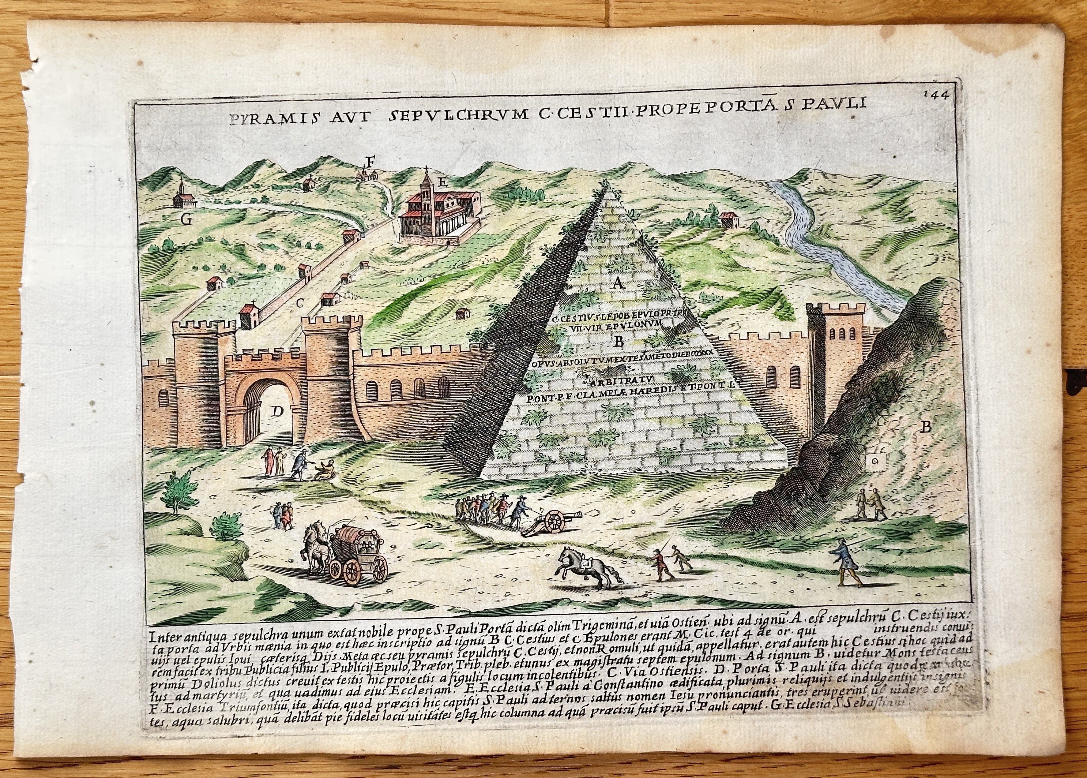Bilder Giacomo Lauro (ca. 1583–1650) – The Pyramid or Sepulchre of C. Cestius near the Gate of St. Paul – Hand-coloured Copperplate Engraving (Circa 1630)