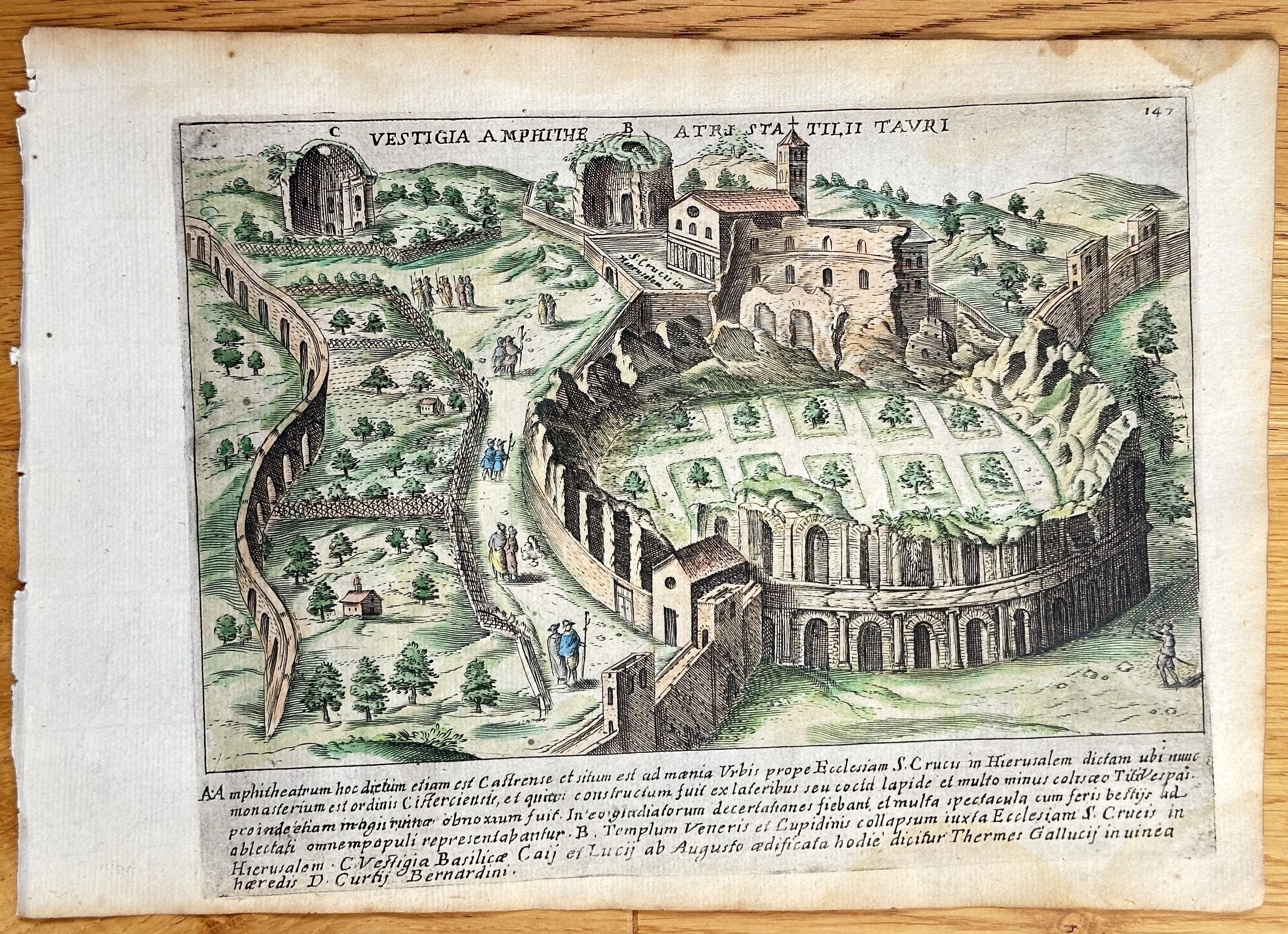 Bilder Giacomo Lauro (ca. 1583–1650) – Ruins of the Amphitheater of Titus Statilius Taurus (Vestigia Amphitheatrii D. Statilii Tauri) – Hand-coloured Copperplate Engraving (Circa 1630)