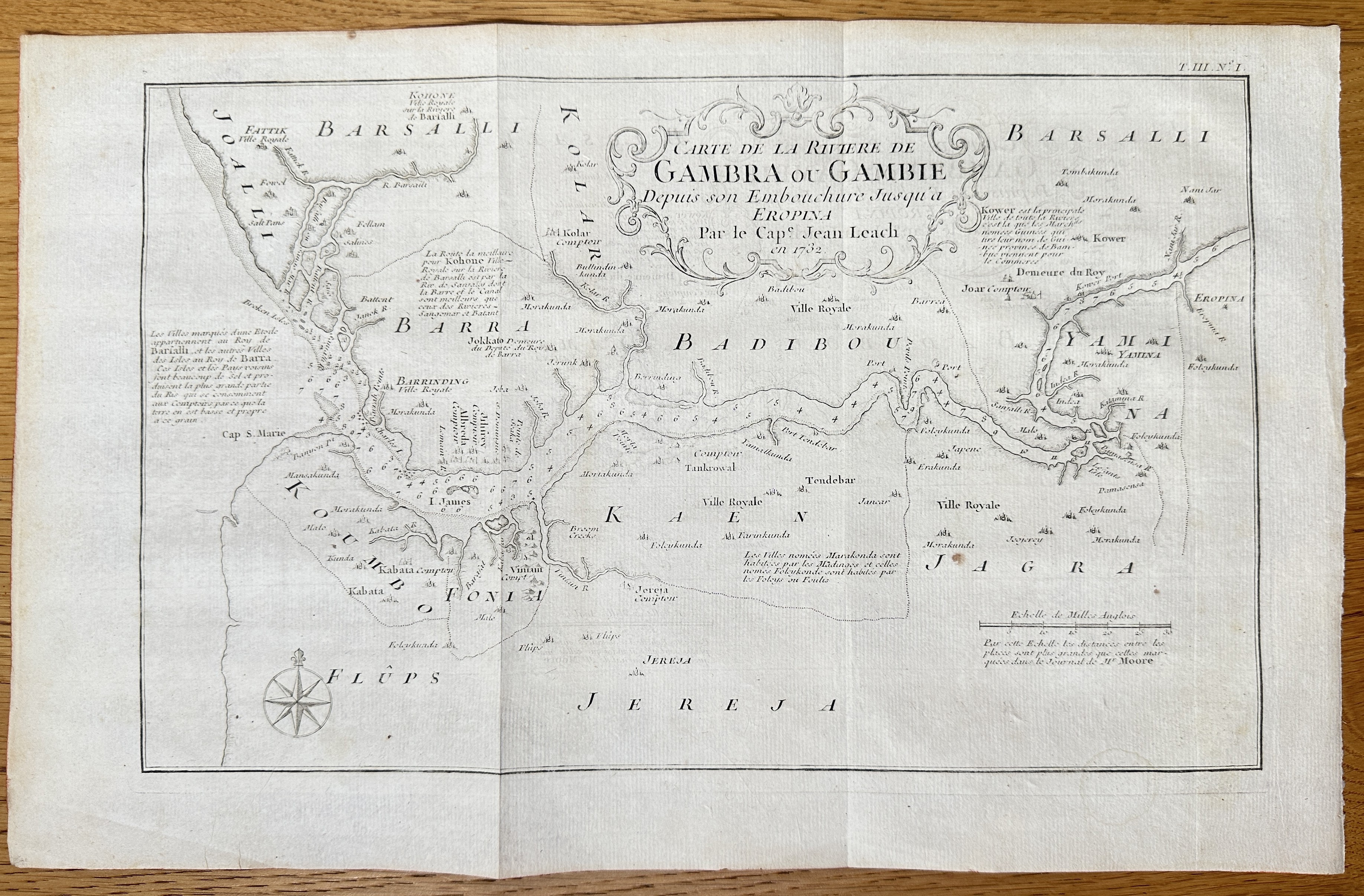 This detailed hydrographic map charts the navigable course of the Gambia River (Riviere de Gambra ou Gambie) from its mouth on the Atlantic coast inland to the settlement of Eropina. The map includes intricate details of the river's winding path, depth soundings, and key settlements and trading posts (comptoirs) along its banks, notably in the kingdoms of Barsalli and Barra. The map was based on the explorations of the British Captain John Leach in 1732 and was published by Bellin in the comprehensive geographical compilation, the Histoire Générale des Voyages, highlighting the river's importance to West African trade.