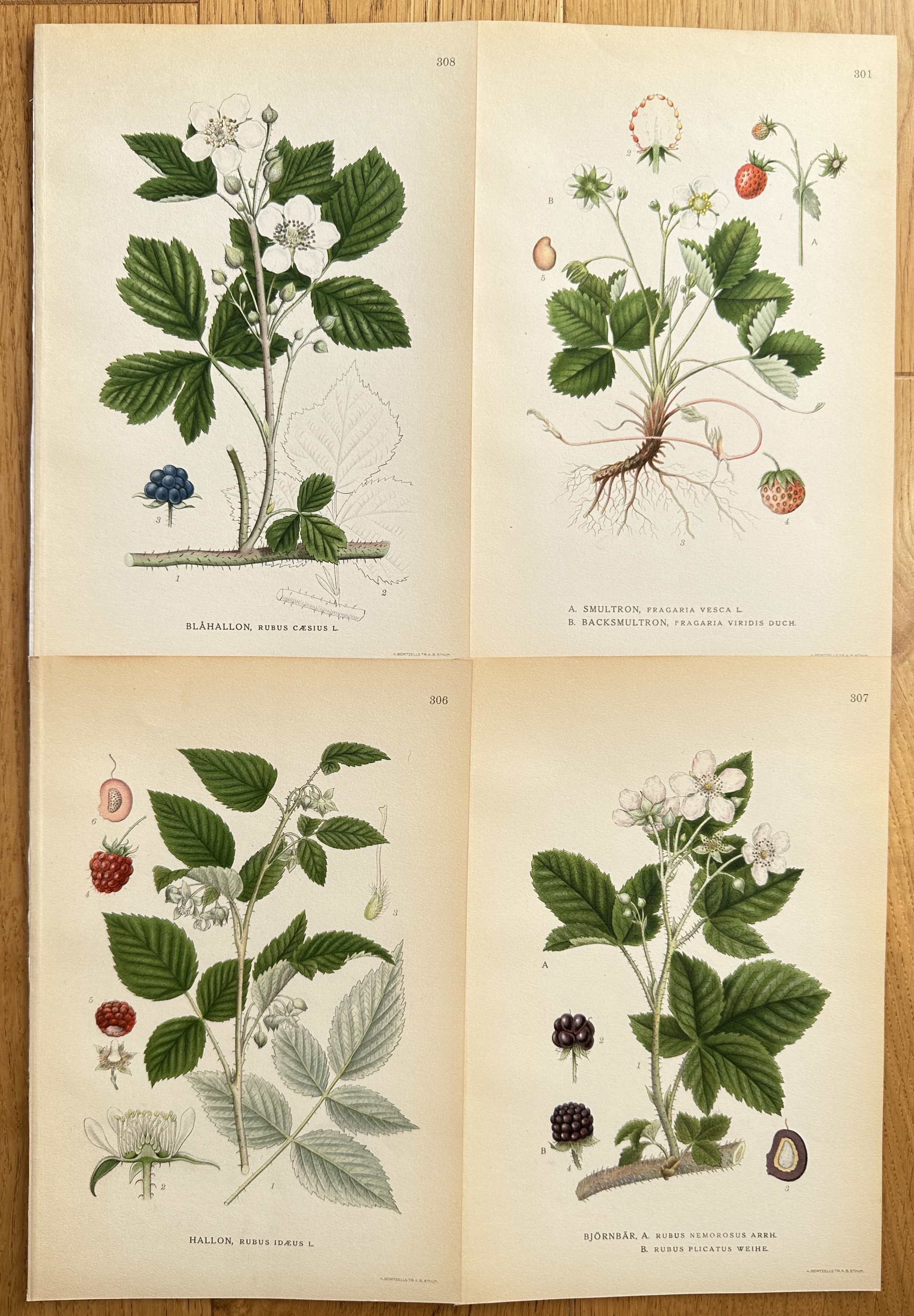 This set of four detailed botanical prints illustrates several species of small, edible berries native to the Nordic region, all belonging to the genus Rubus or related genera in the rose family (Rosaceae). The plates feature the European Dewberry (Rubus caesius), Wild Strawberry (Fragaria vesca), Raspberry (Rubus idaeus), and Stone Bramble (Rubus saxatilis), detailing each plant's distinct flowers, leaves, and fruit clusters. These scientific yet highly decorative prints were produced for Bilder ur Nordens Flora (Pictures of Northern Flora), a key turn-of-the-century work documenting Scandinavian botany.
