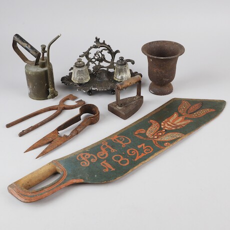 Bilder Gryta, plättjärn och våffeljärn, metall, bl.a Ronneby Bruk och Kockums.