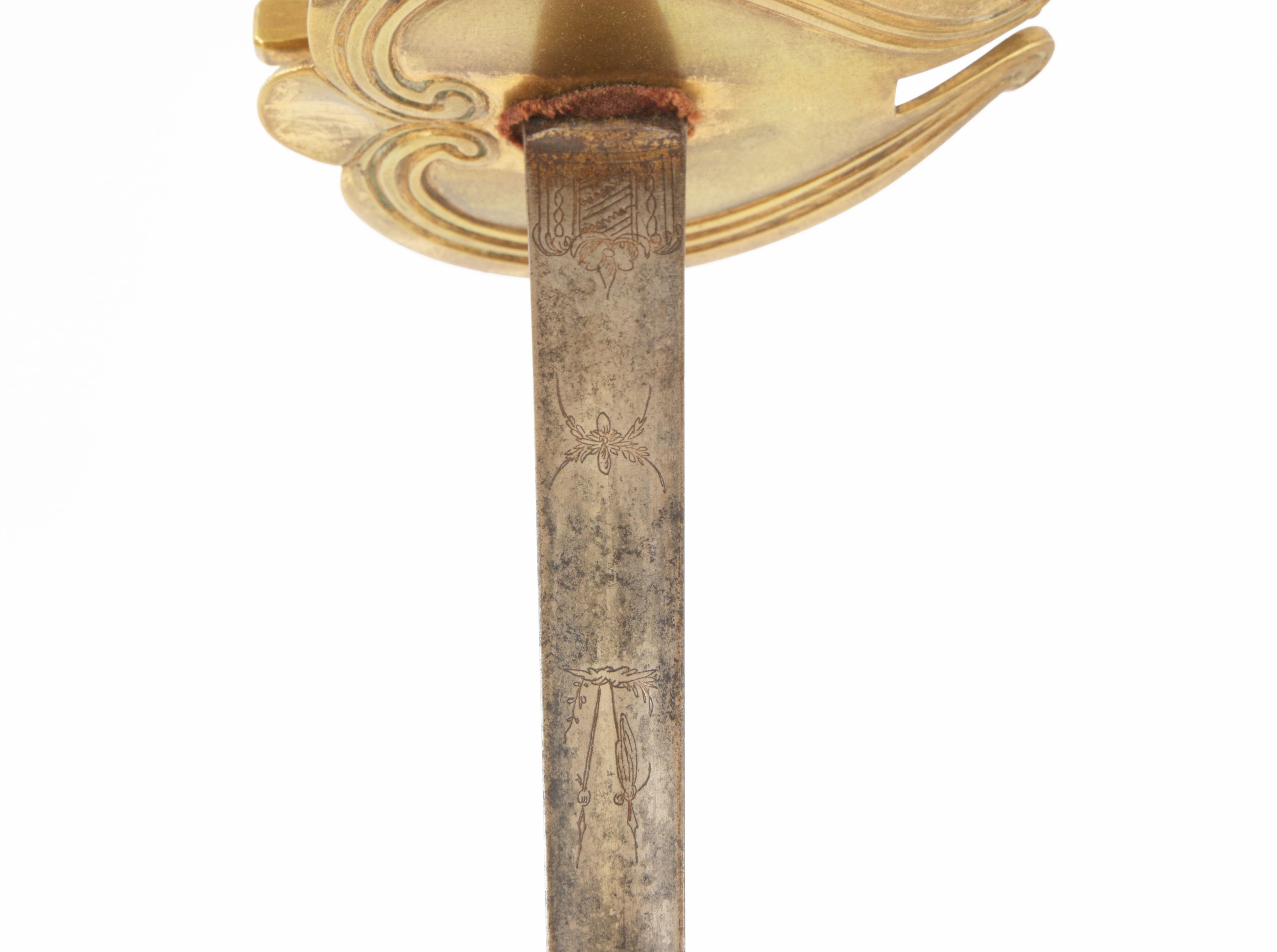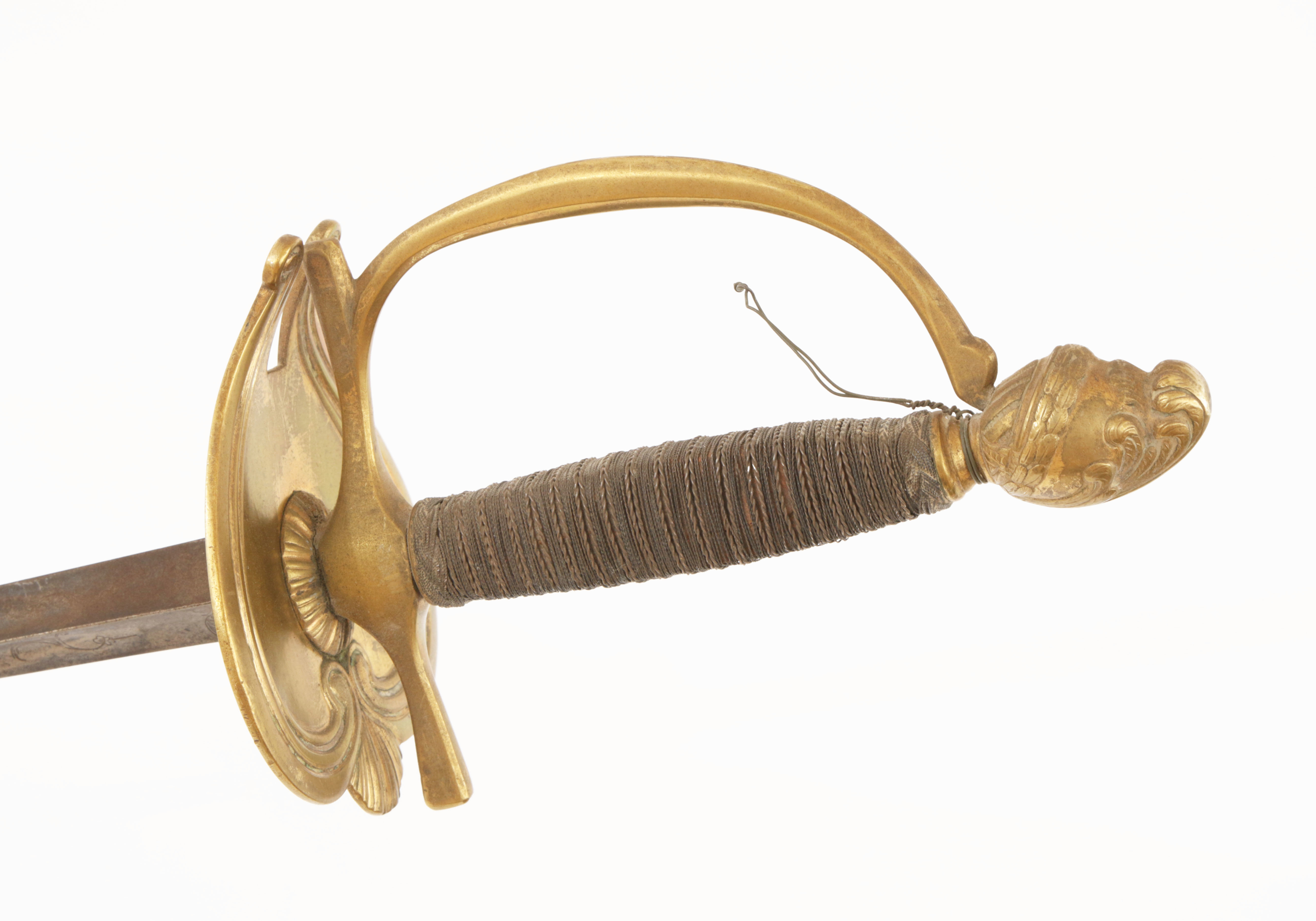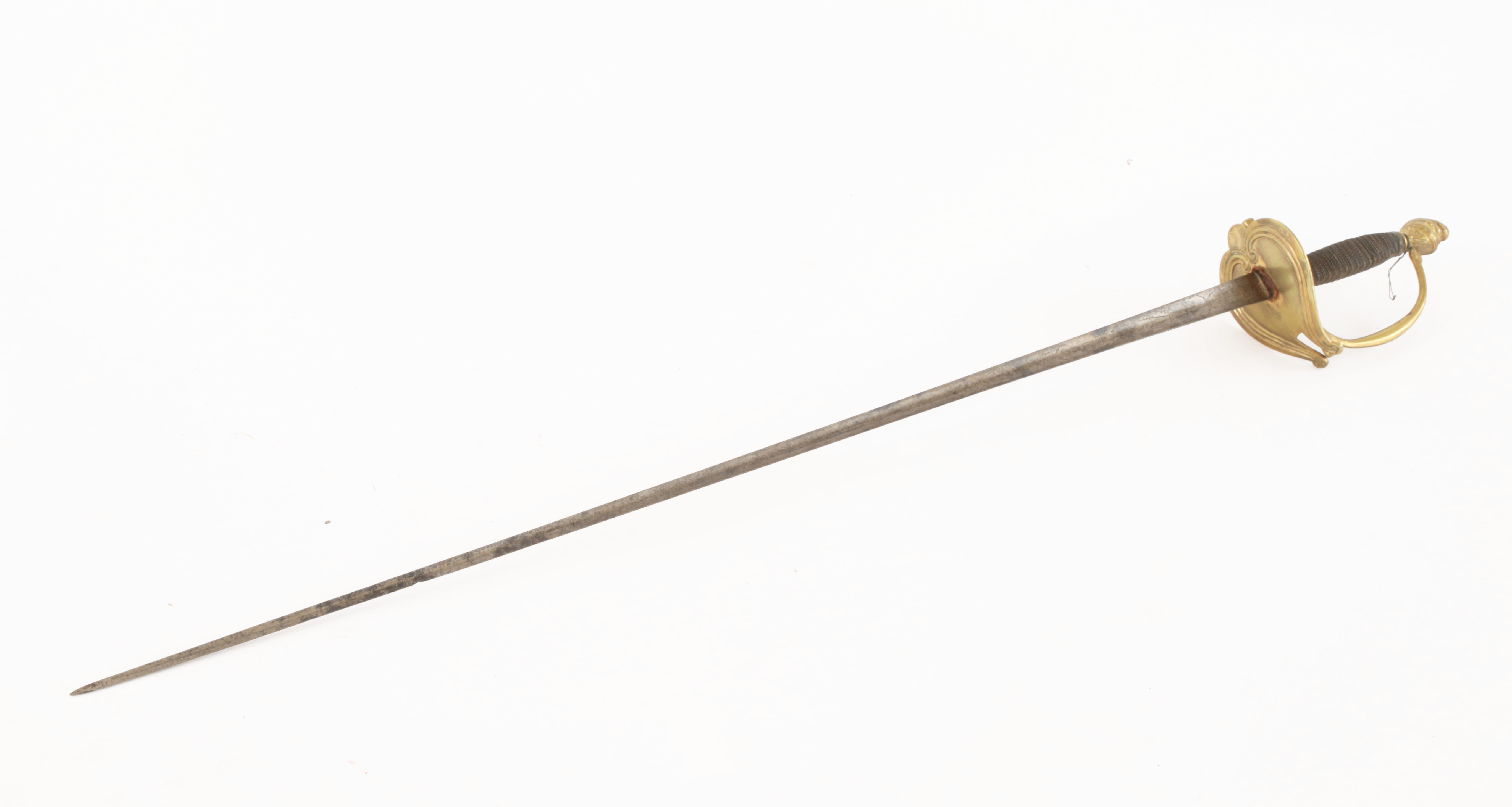 Handtag och parerskydd i mässing. Stålklinga, med graverad dekor. Lindat handtag.